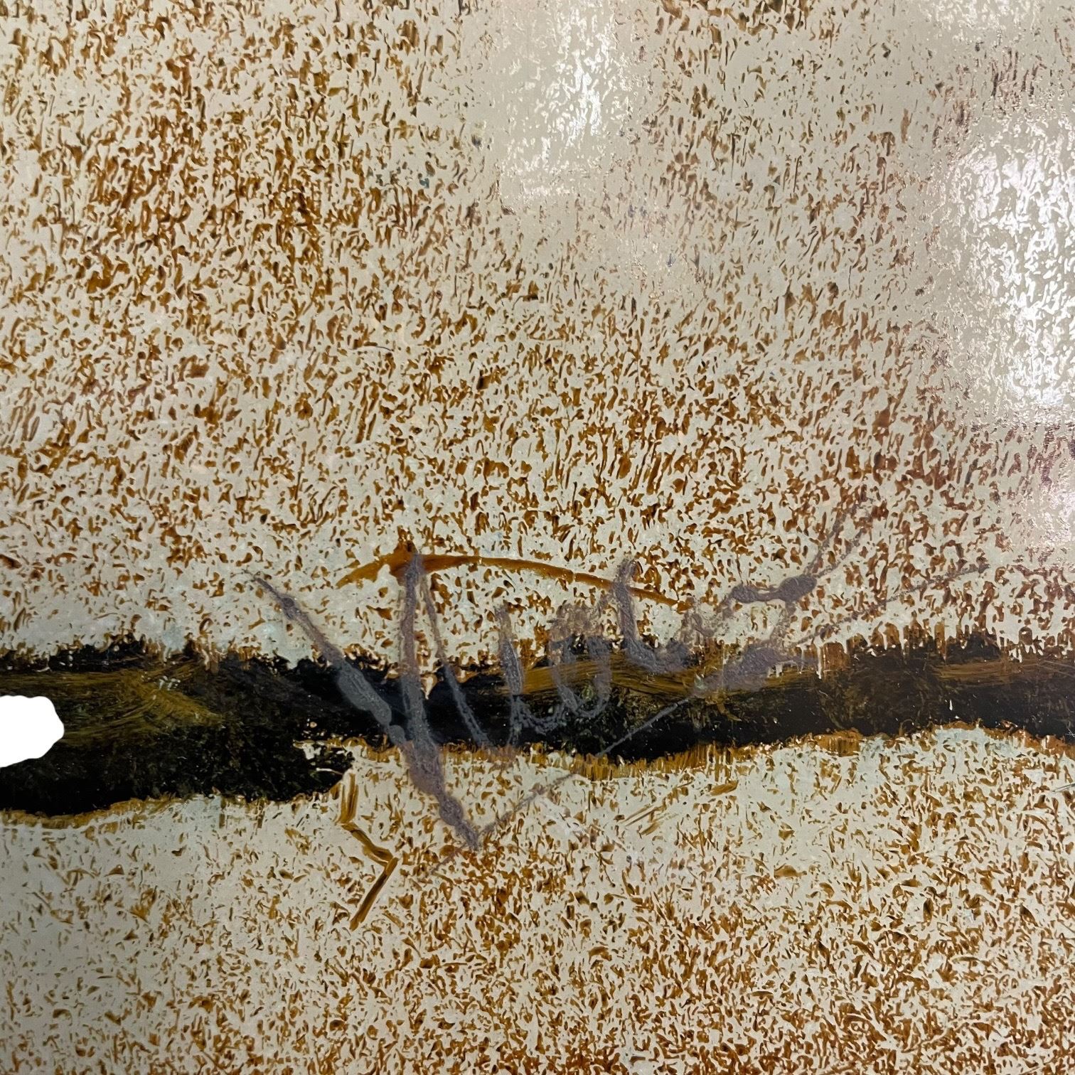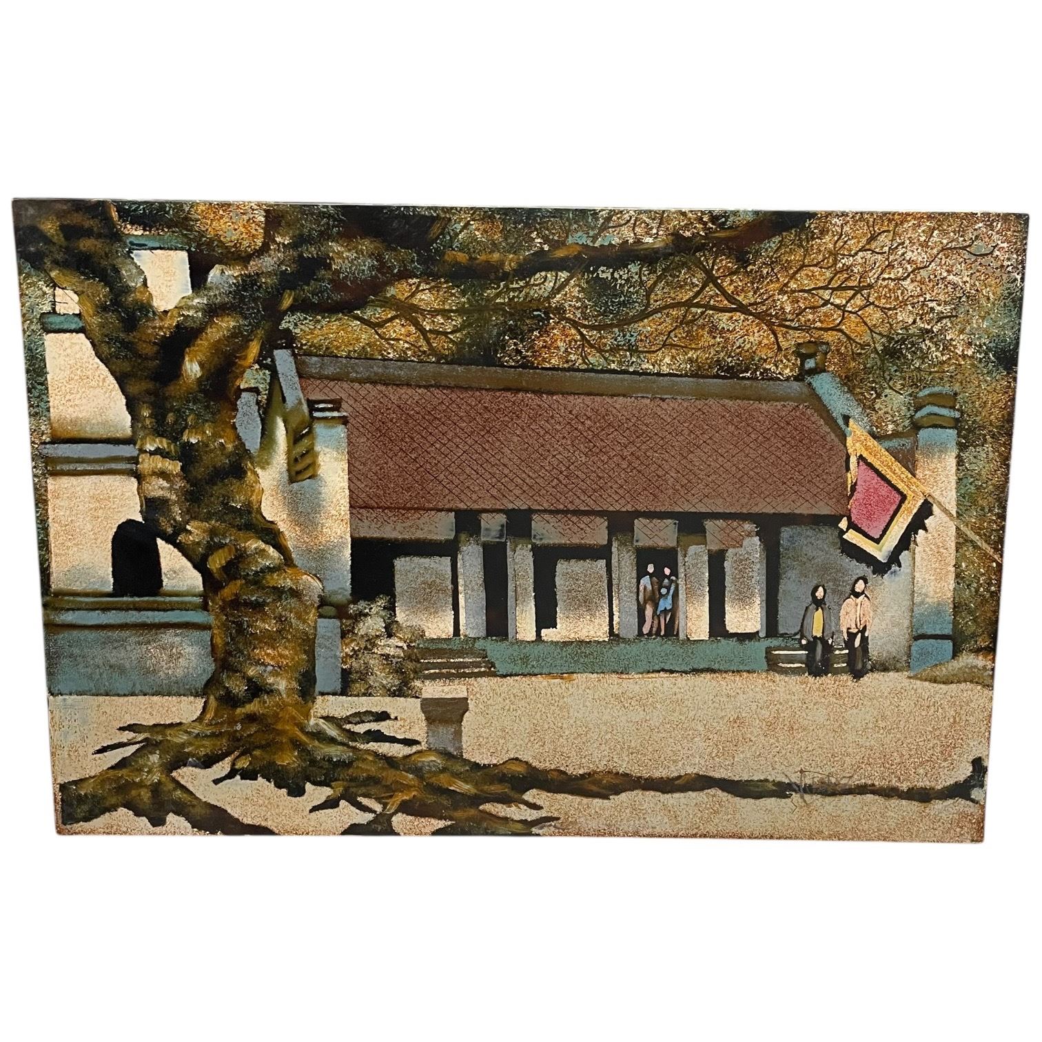 Medium painting on board with lacquered surface measuring 23.5 x 15.75 inches. Depicts a stylized architectural scene featuring a traditional building, red-tiled roof, large spreading tree, figures, and a vertical banner. Shows Japanese influence. Signature is present but illegible. Item is as pictured.