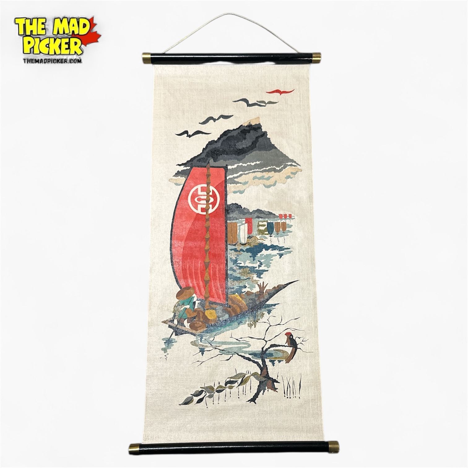 Japanese reproduction kakejiku hanging scroll featuring a maritime scene. Measures 24x12 inches. Traditional Japanese artistic format using ink and pigment on scroll paper or silk, mounted on fabric backing. Ideal for decorative hanging or cultural display.