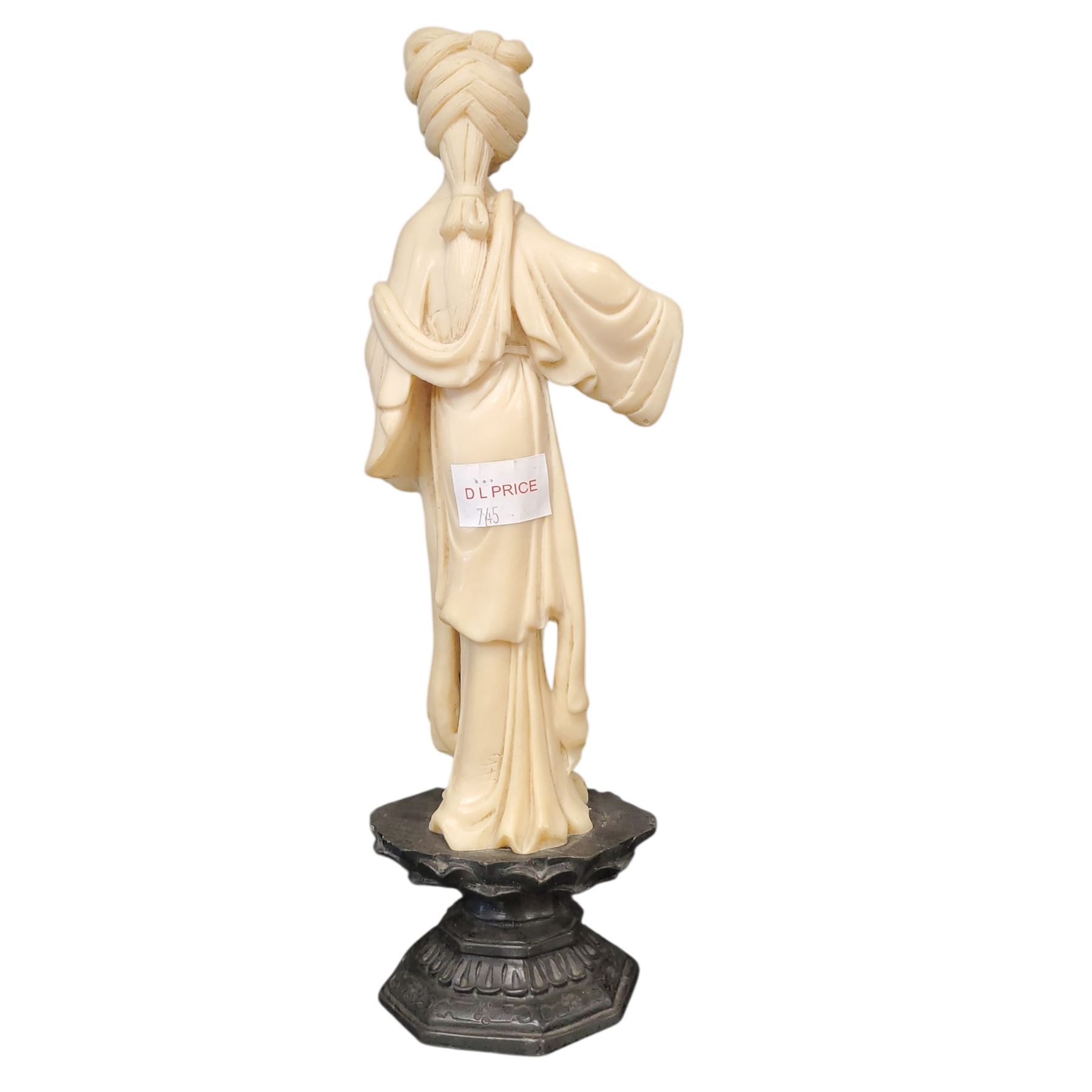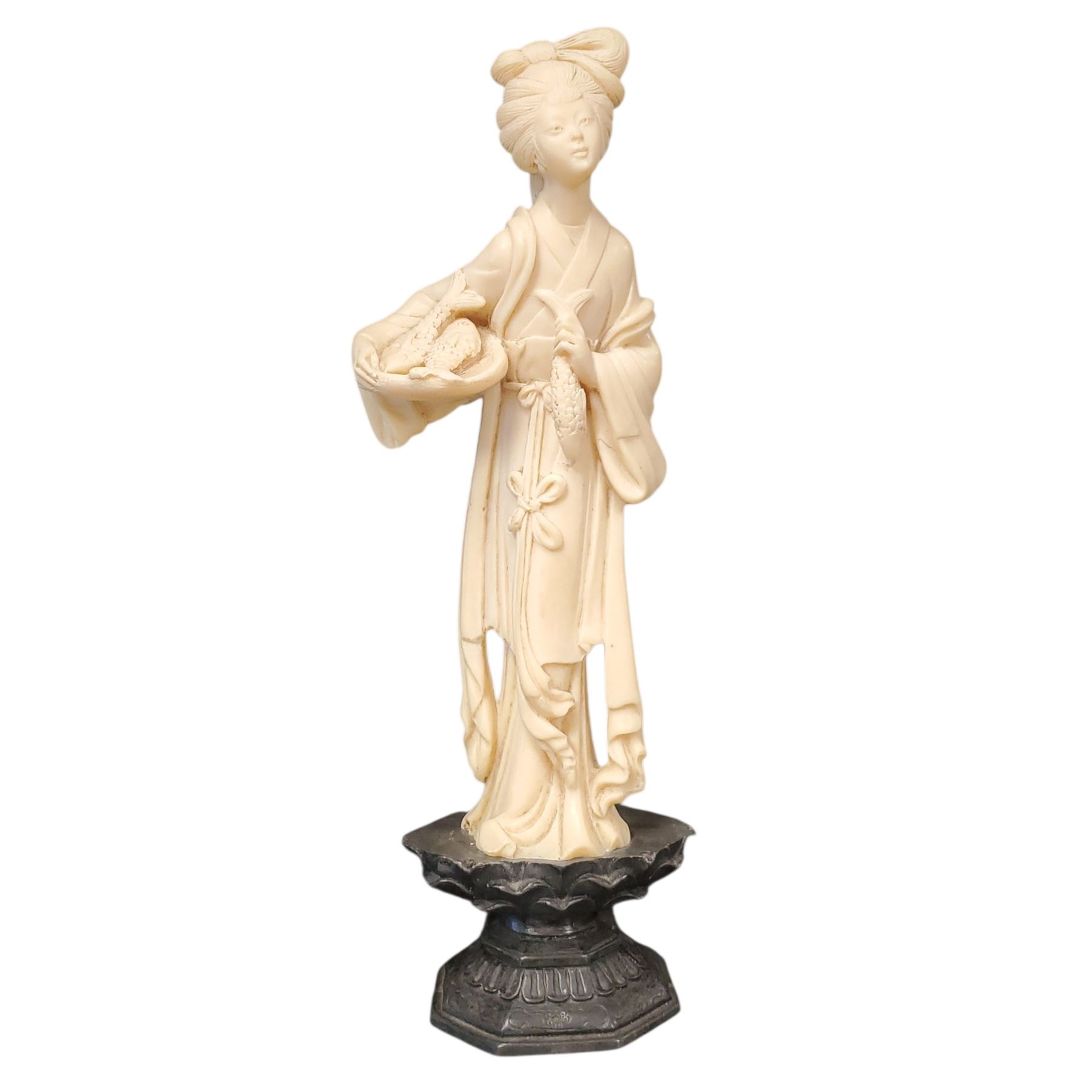 Japanese resin sculpture depicting a geisha woman holding a basket of fish. Stands 12-Inch tall. Features detailed craftsmanship capturing traditional attire and accessories. Item is as pictured.