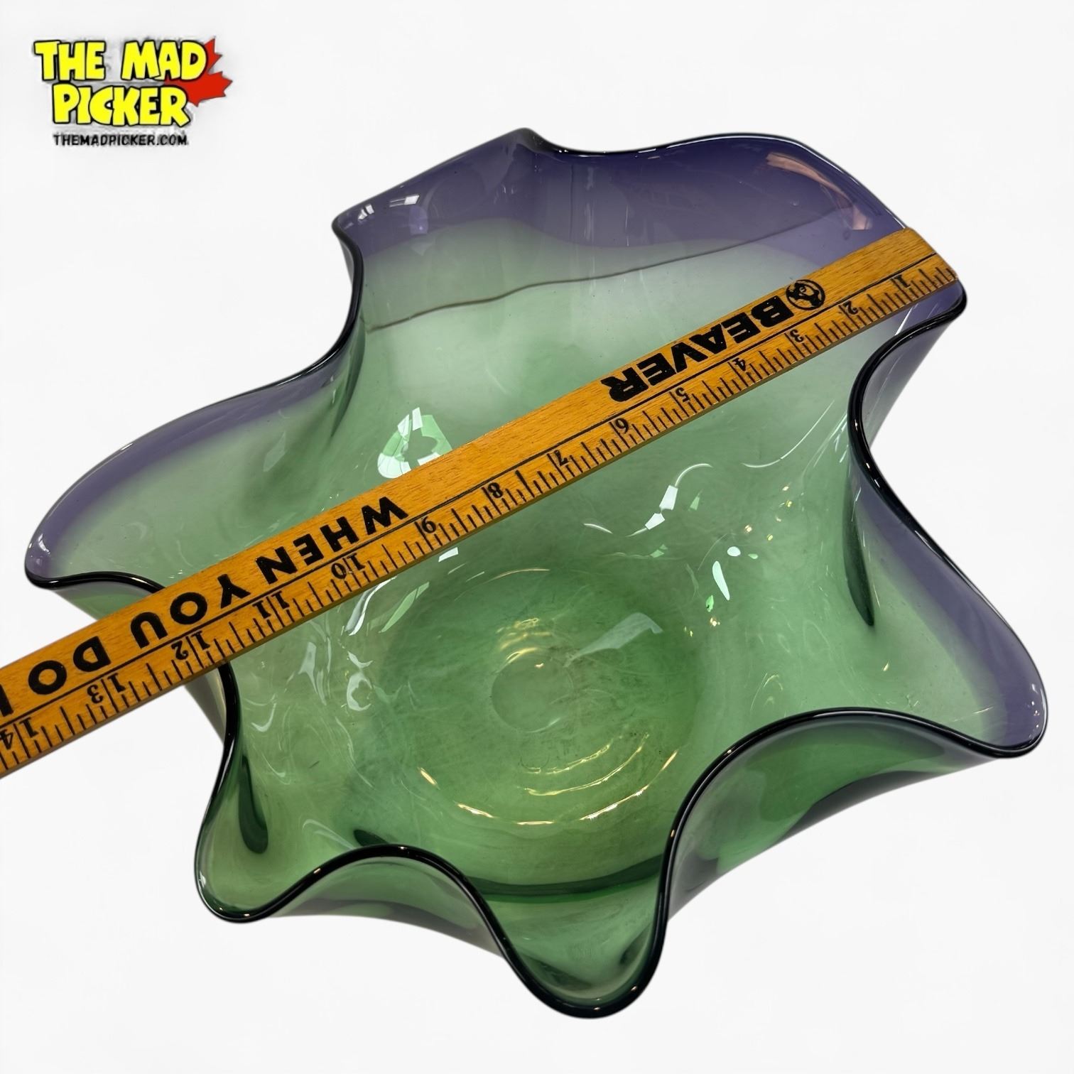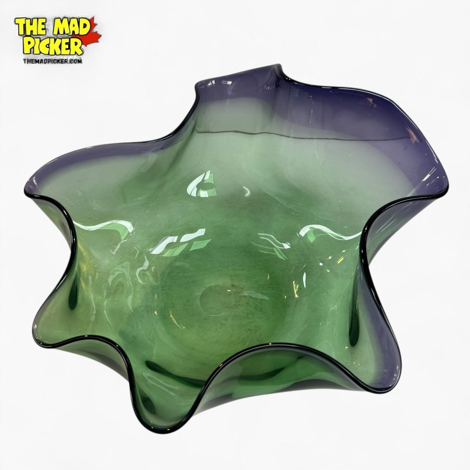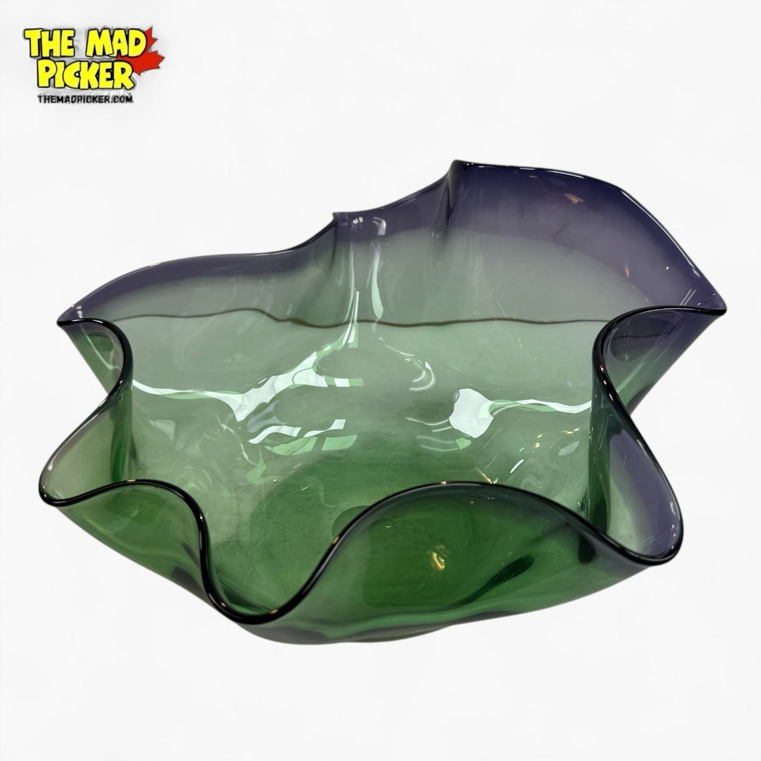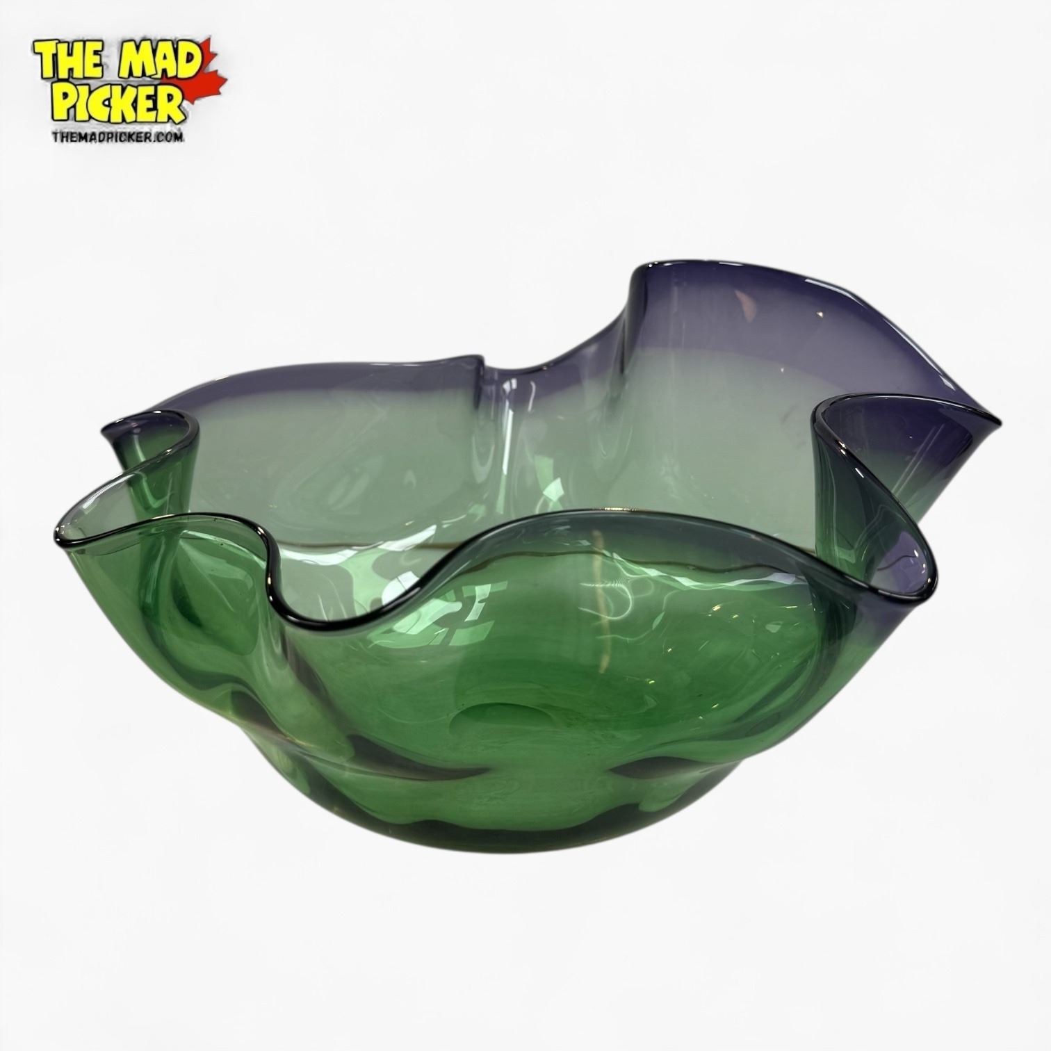 Studio art glass bowl by John Phillips, renowned Canadian glass artist. Hand-blown with vibrant green and purple hues, featuring ruffled edges and an organic free-form shape. Phillips began his career in 1973, producing works in British Columbia, Canada, now collected widely in North America.