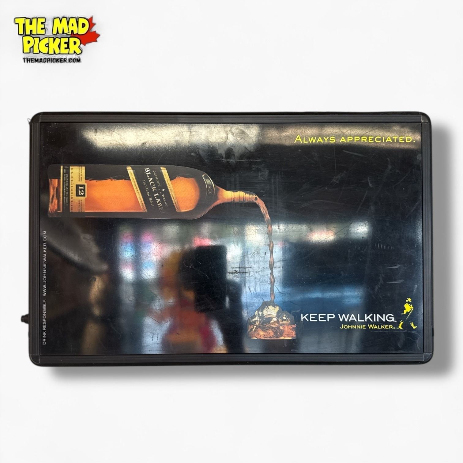 Johnnie Walker Black Label light-up advertising sign made of durable plastic. Features the iconic striding man logo and Black Label branding. Display piece, originally illuminated, but sold without plug or power functionality. Suitable for collectors or for decorative purposes.