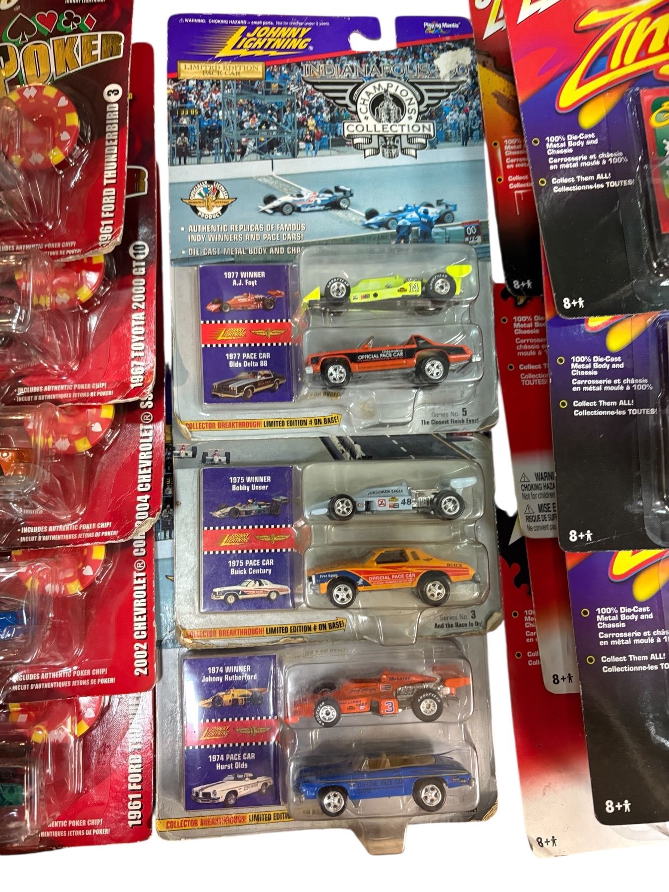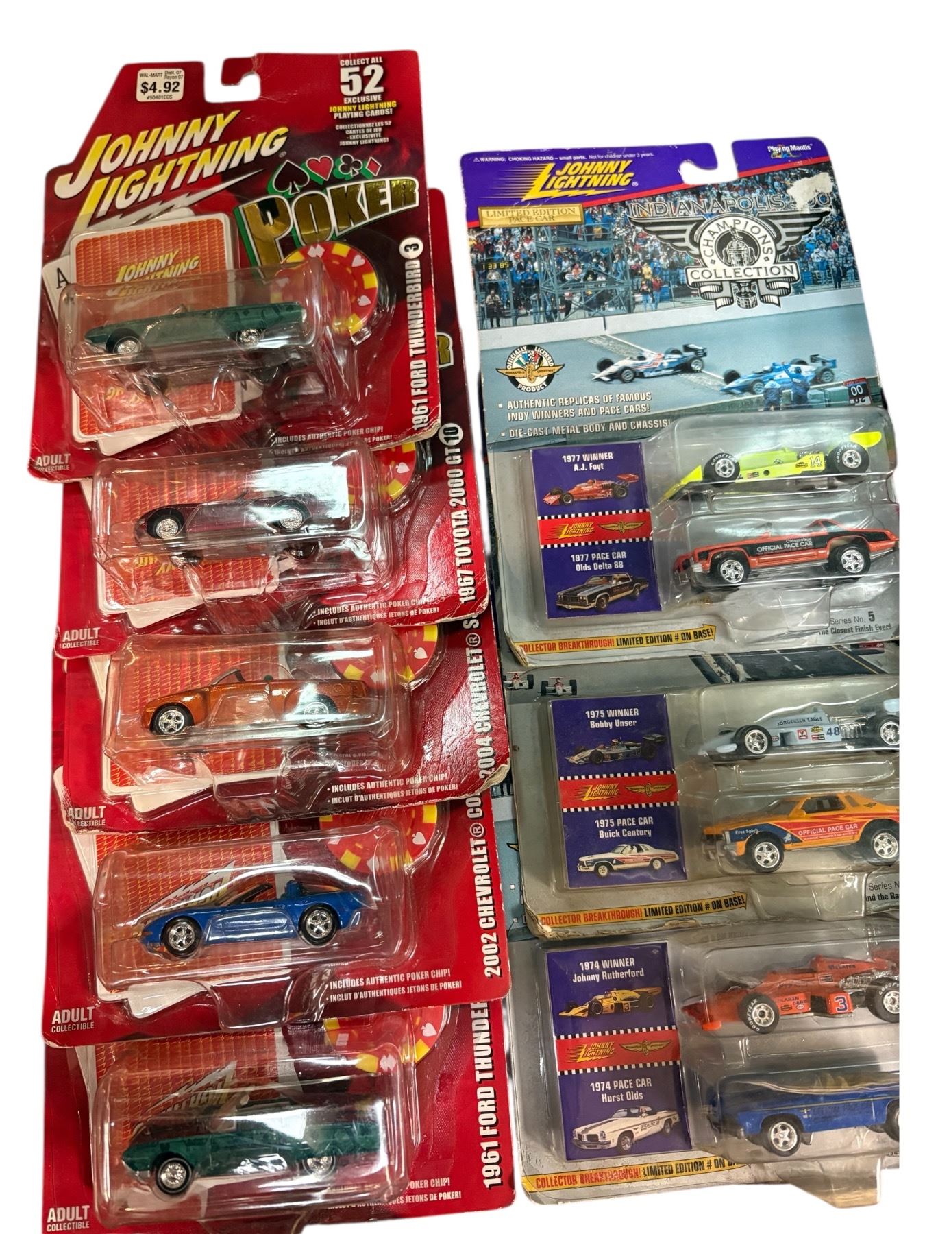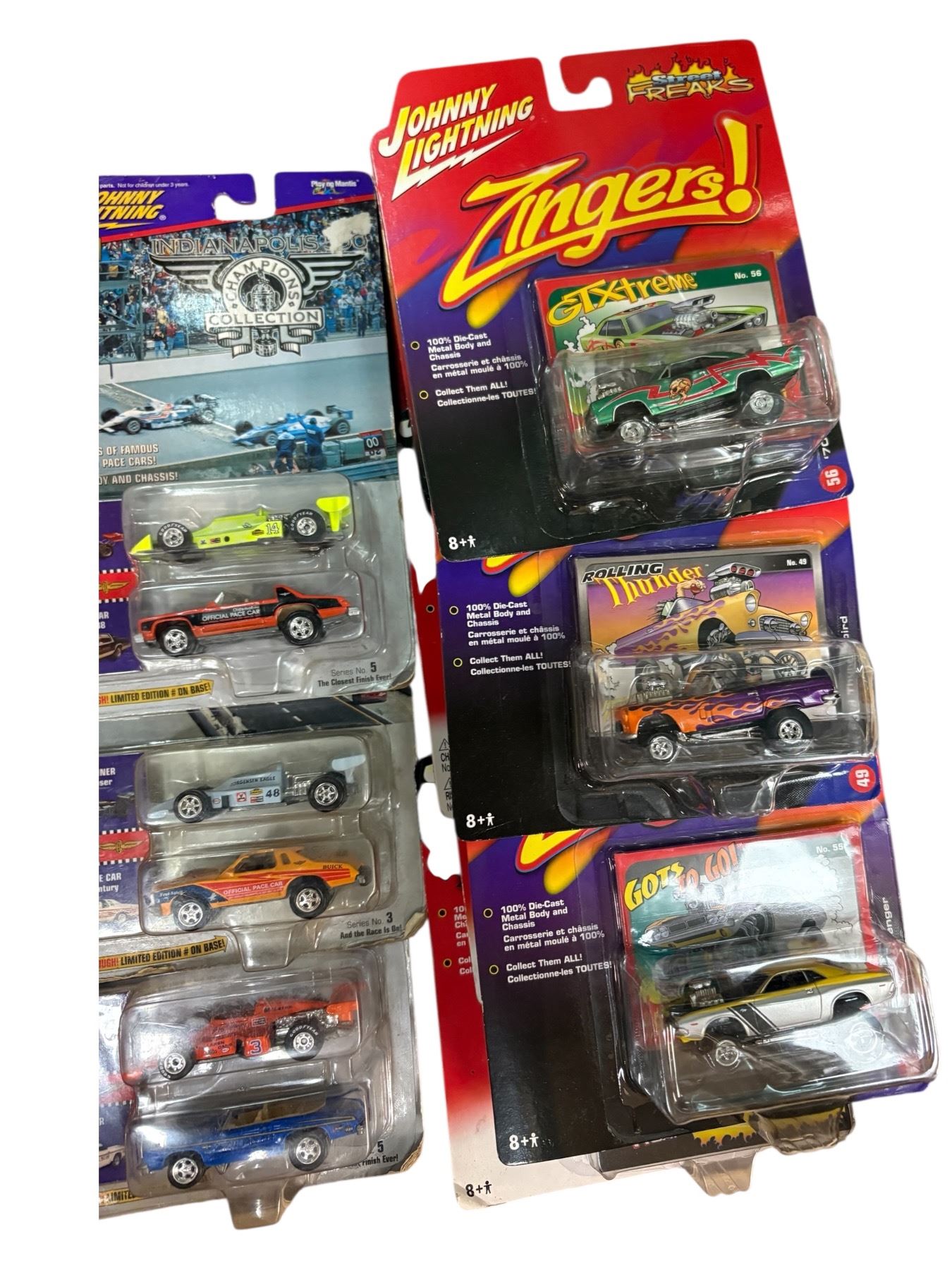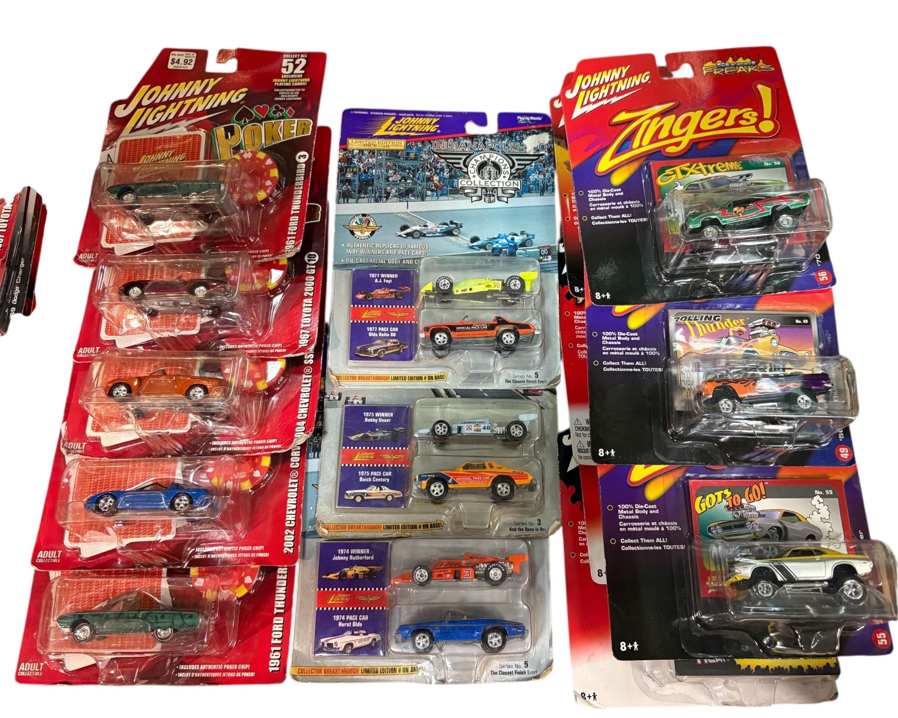 Collection of 14 assorted Johnny Lightning diecast cars, all in sealed blister packs. Includes various models and series, preserved in original packaging. Known for detailed craftsmanship and 1:64 scale designs. Dates and specific models within the assortment not provided.