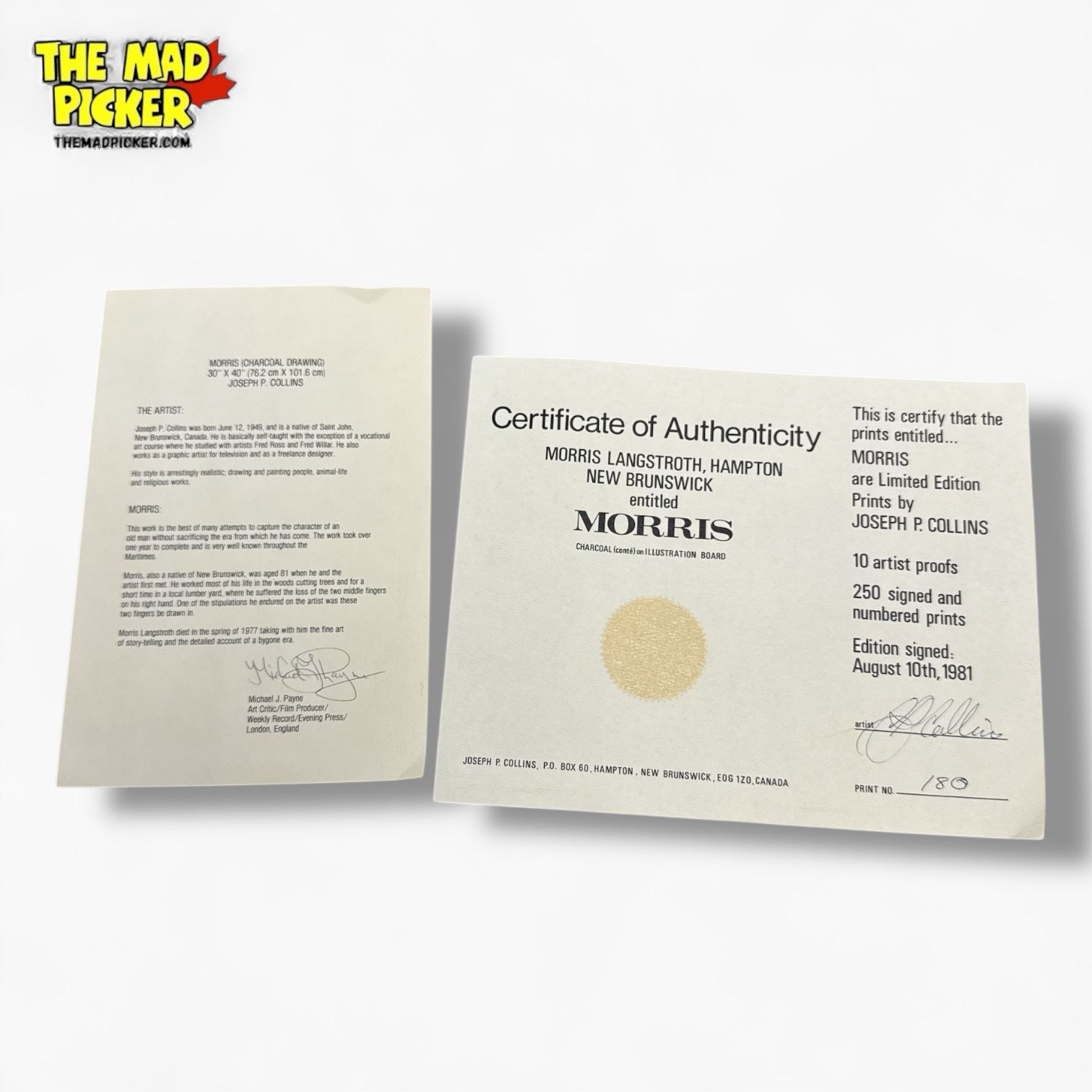 'Morris' by Joseph P. Collins, limited edition of 250 signed and numbered prints, plus 10 artist proofs. Published on August 10, 1981, by Morris Langstroth in Hampton, New Brunswick. Each print comes with a certificate of authenticity. Classic example of 1980s Canadian art printmaking.