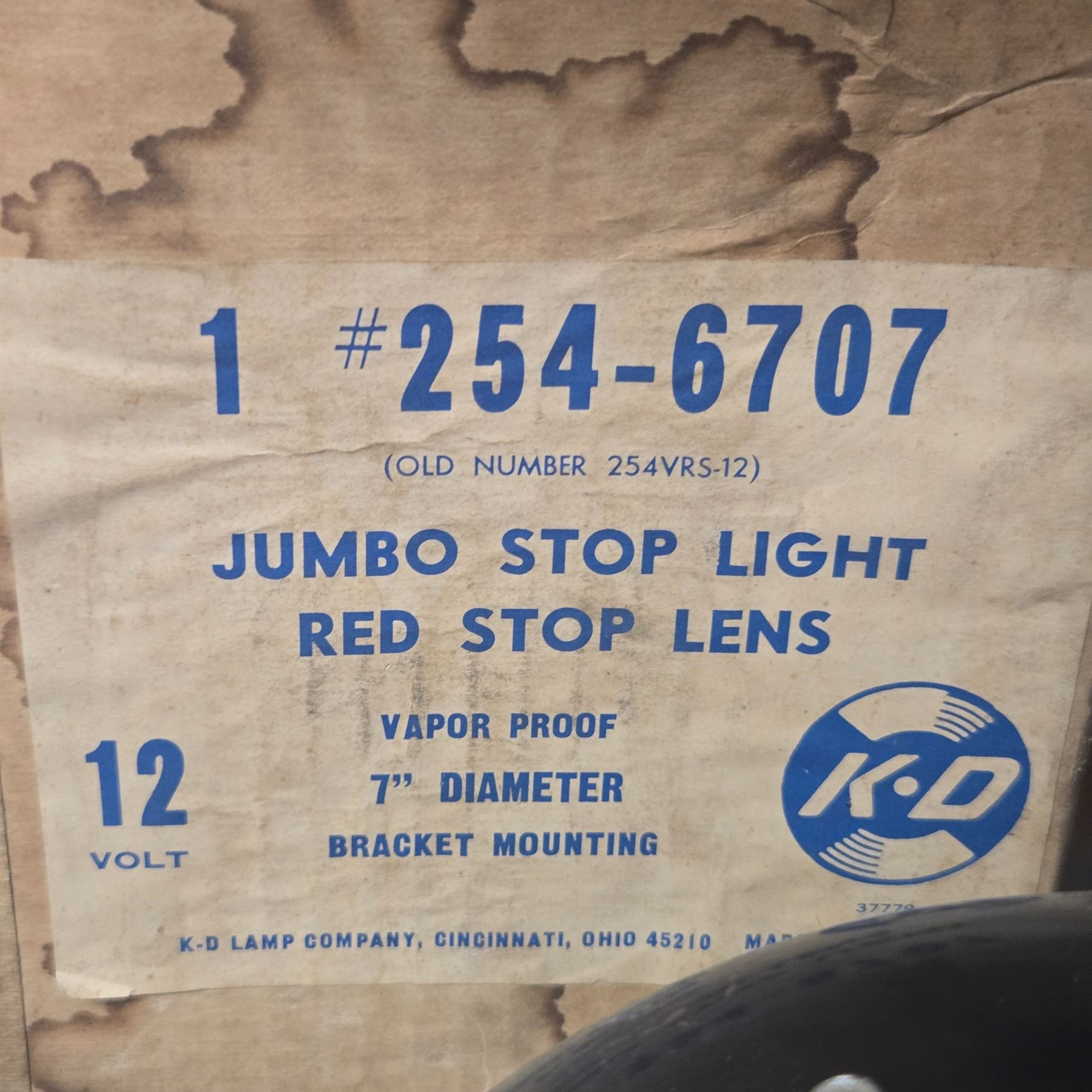 Pair of KD 254-6707 vintage jumbo stop light lenses. Red plastic lenses, 7-inch diameter. Includes original box and mounting hardware. Typically used for stop lights or signal applications. Manufactured mid-20th century, known for durability and unique size.
