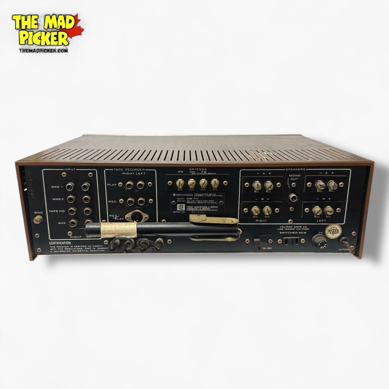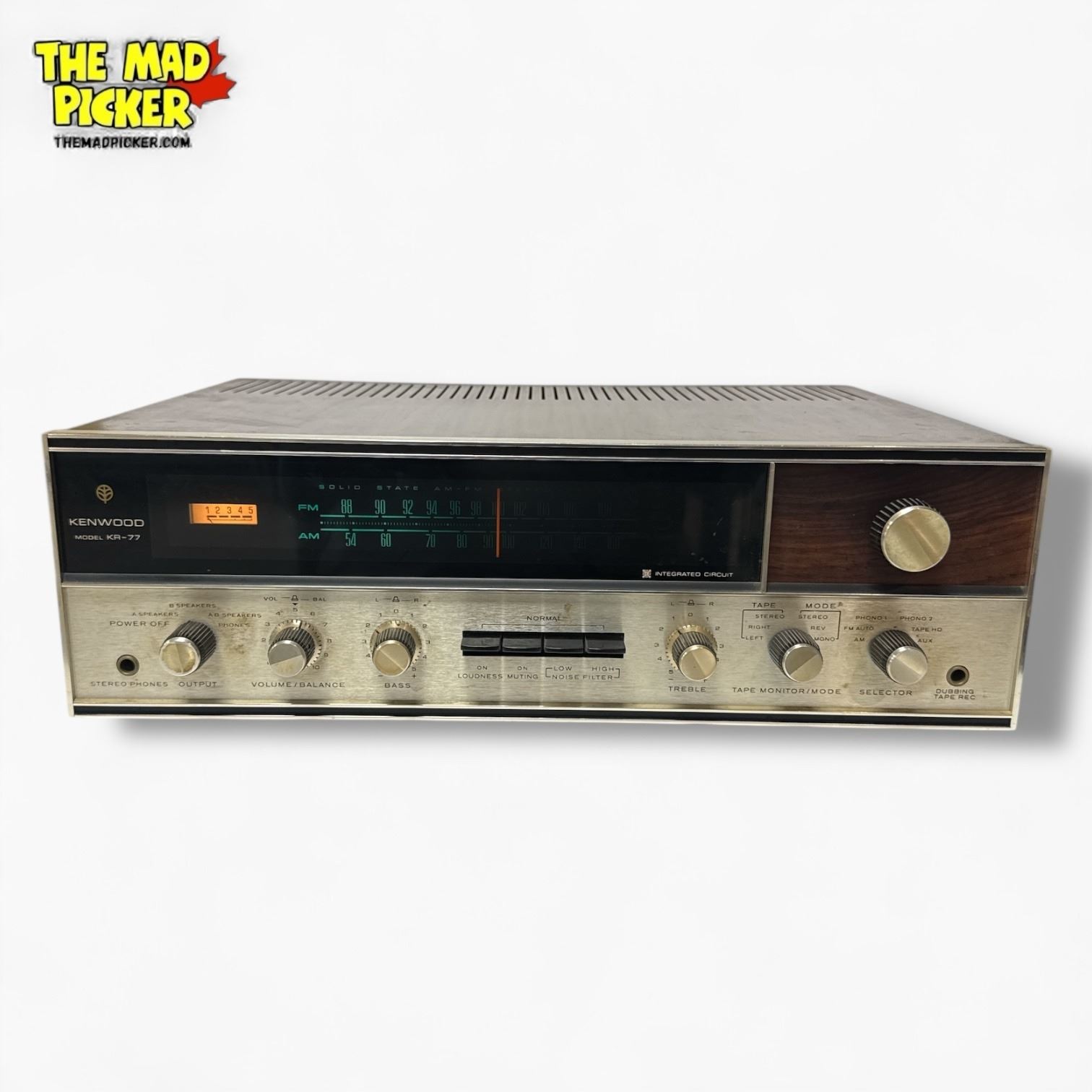 Kenwood KR-77 stereo receiver, solid state model produced in Japan during the 1970s. Features include AM/FM radio tuning with analog display, multiple input options, and built-in amplifier. Known for its durable construction and warm sound quality. Wooden cabinet with metal front panel design.