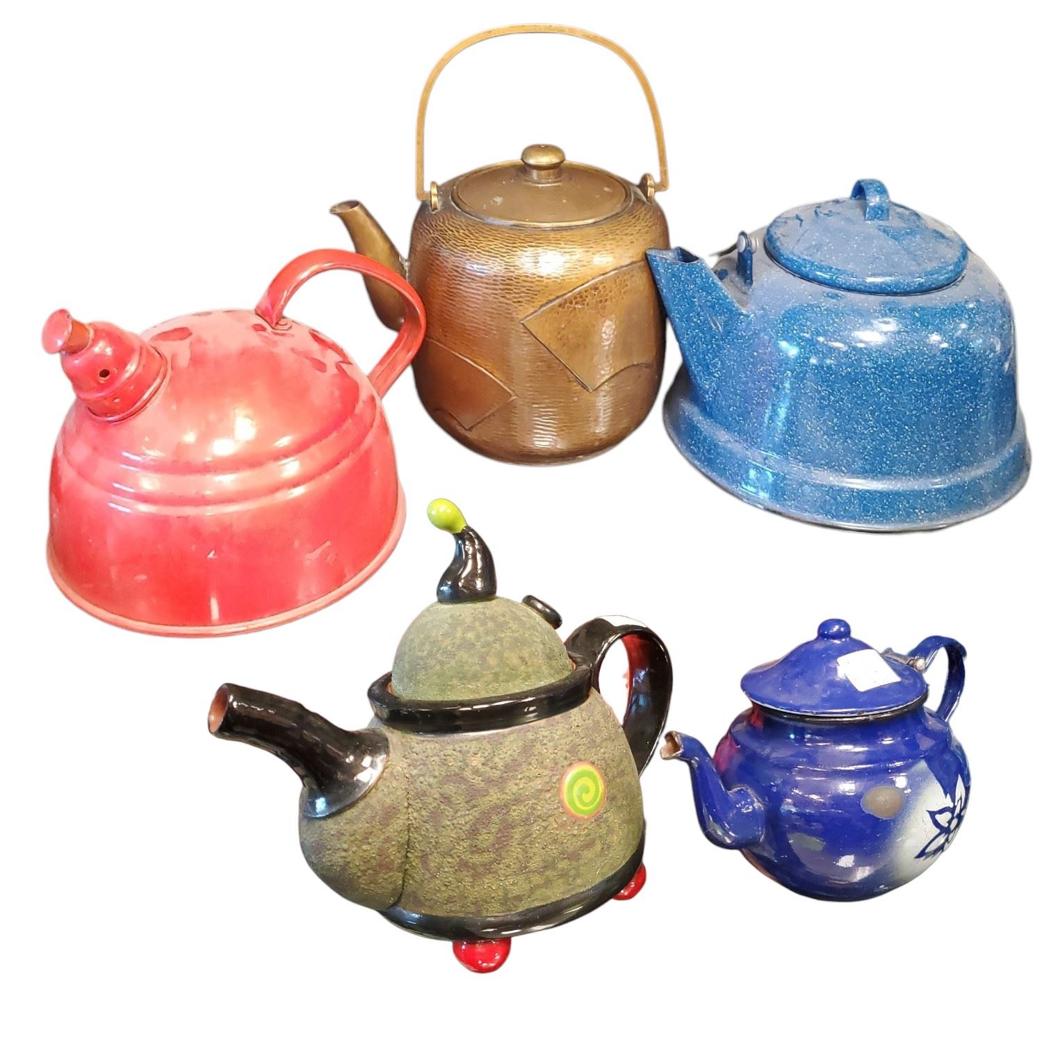 Collection of four teapots & kettles including a funky ceramic teapot, Polish enamel kettle, red Art Deco kettle, and a blue enamel camping kettle. Each piece features unique design and material, showing a variety of styles for functional or decorative use. Items are as pictured.
