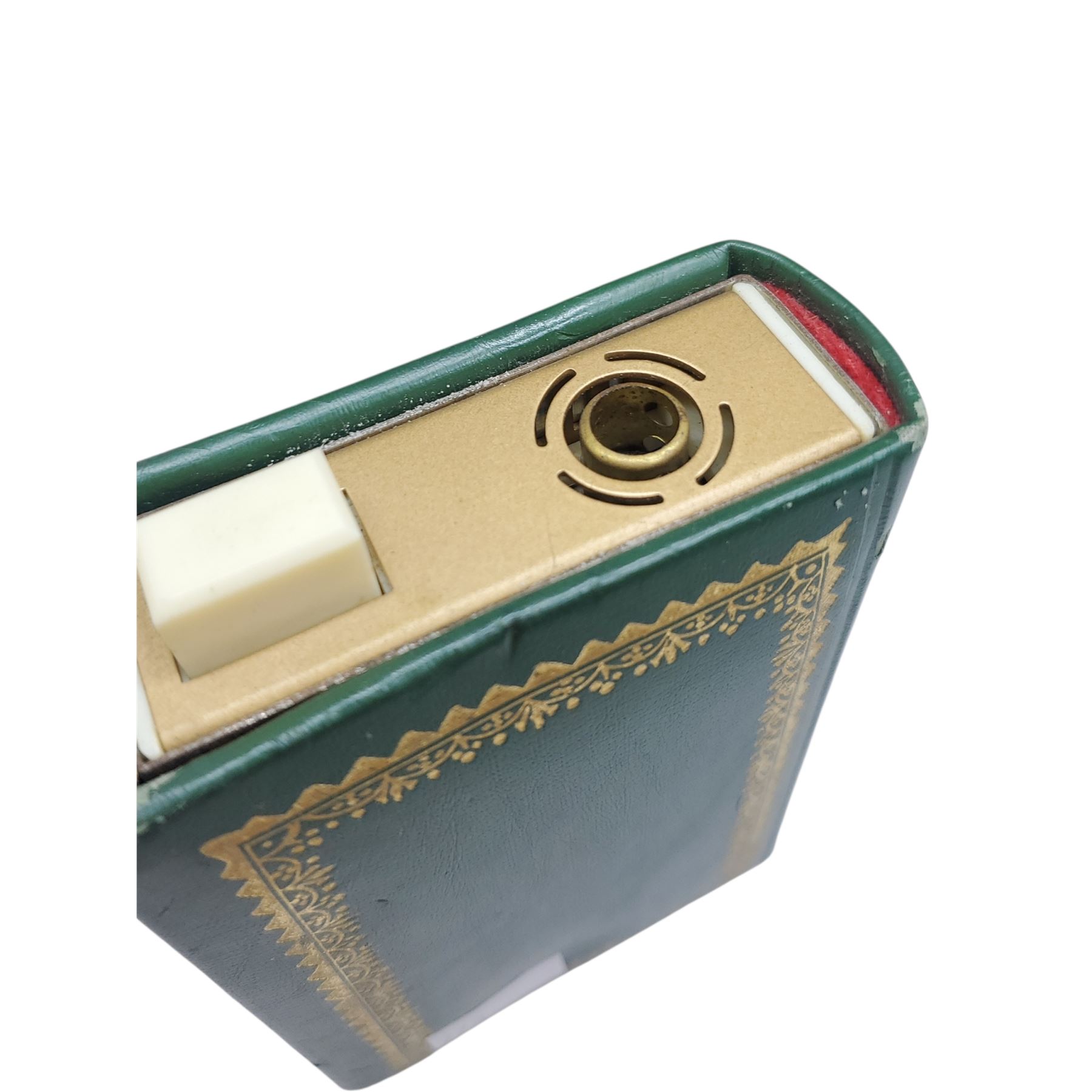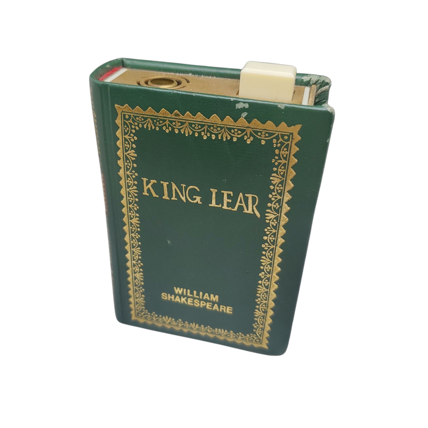 Electric table lighter with 'King Lear' by William Shakespeare design. Features green leather-bound style exterior. Manufactured in Japan, mid-20th century. Functional lighter component embedded into the top. Decorative and literary-themed collectible.