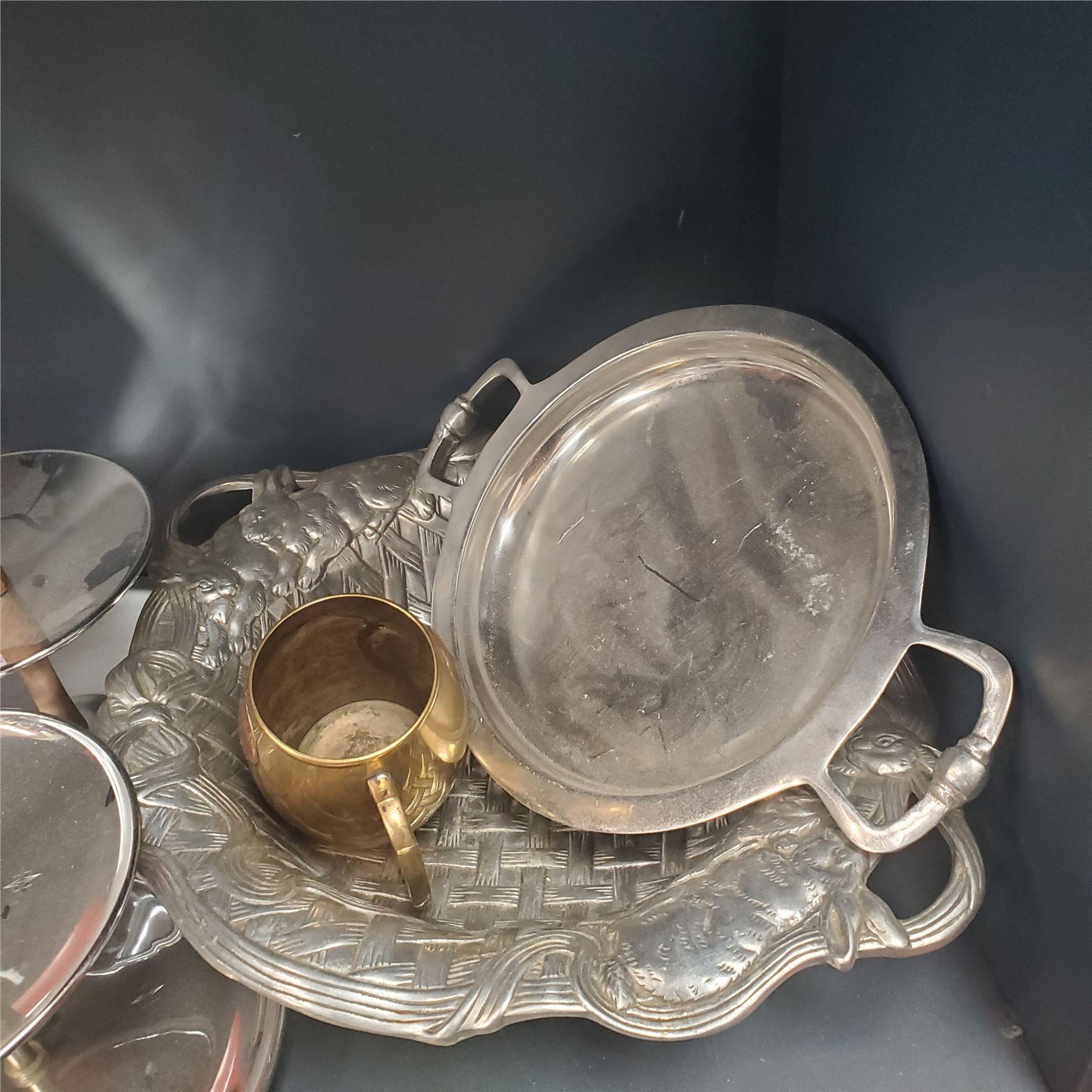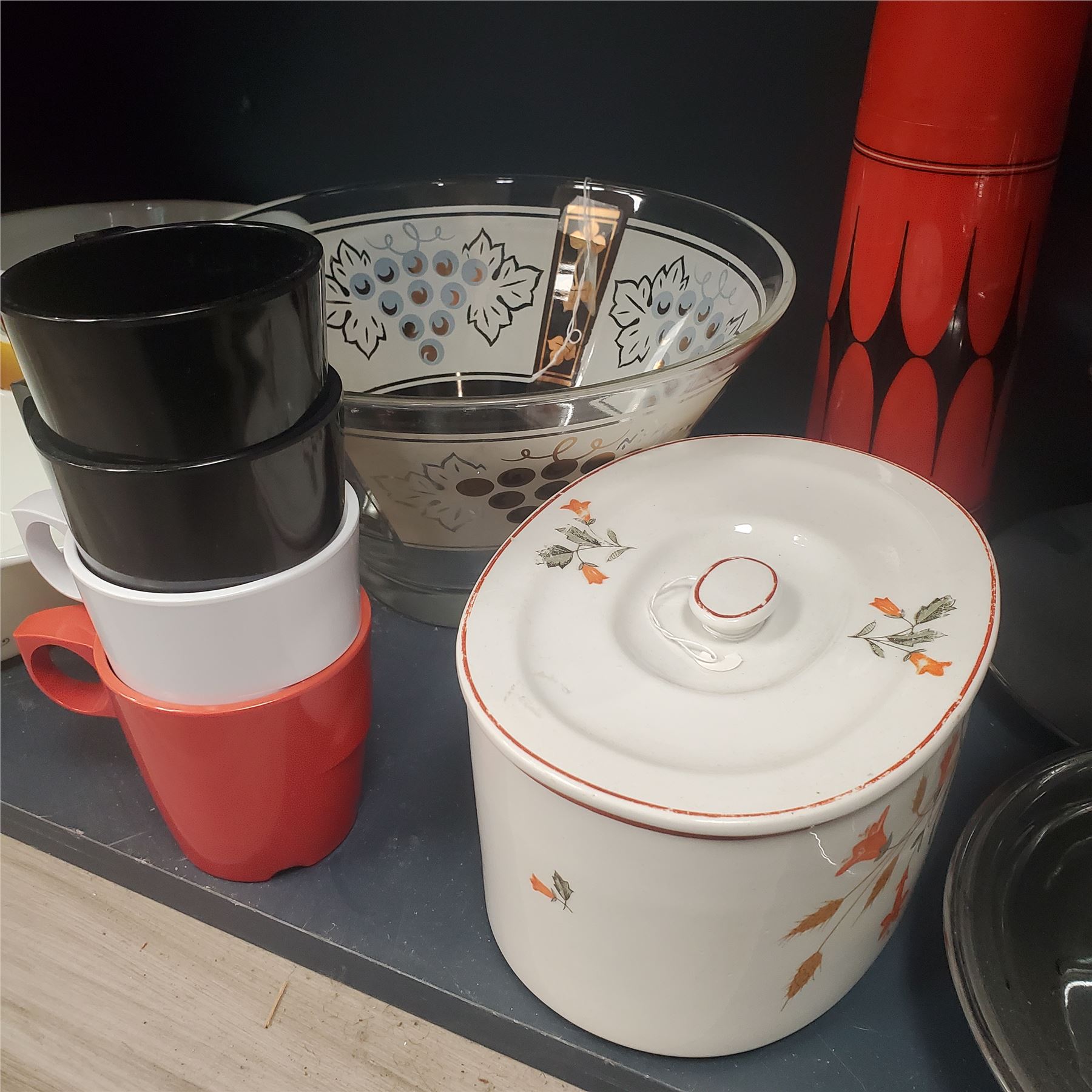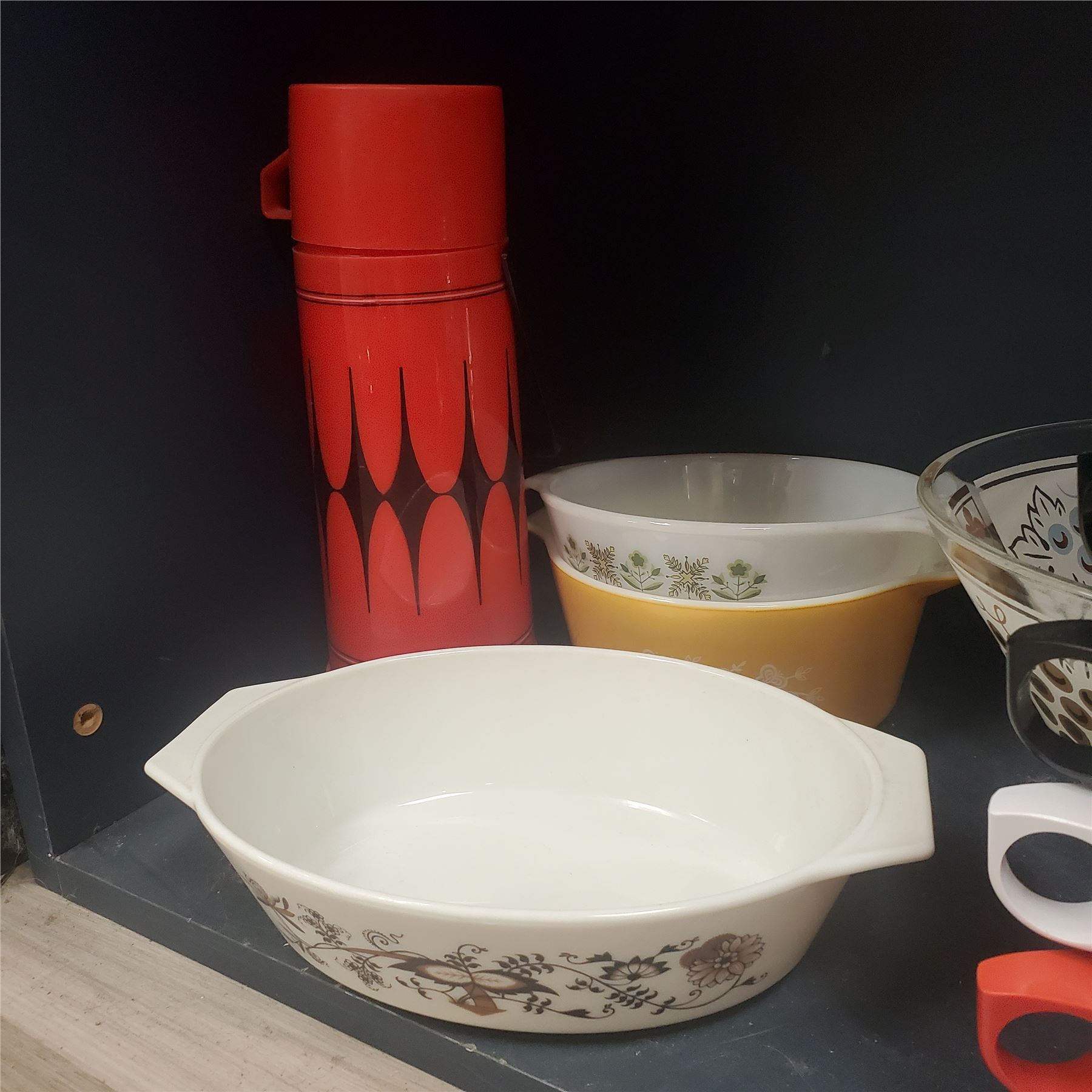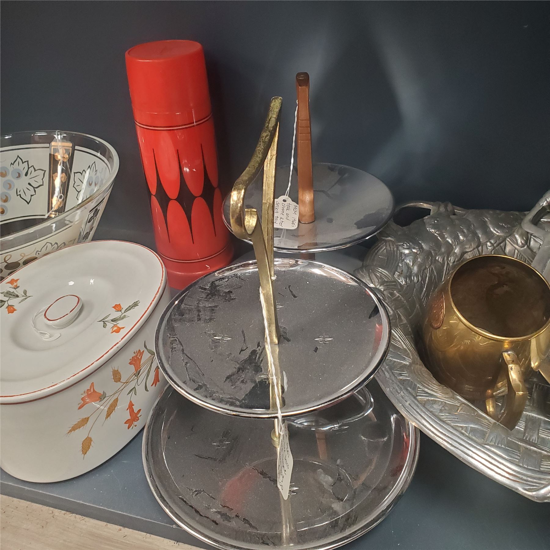 Collection of kitchen items featuring Pyrex, Fire King, Anchor Hocking glassware, pewter and brass pieces, Mid-Century Modern tiered trays, and thermoses. Items include a mix of materials and likely span various production eras. Item is as pictured.