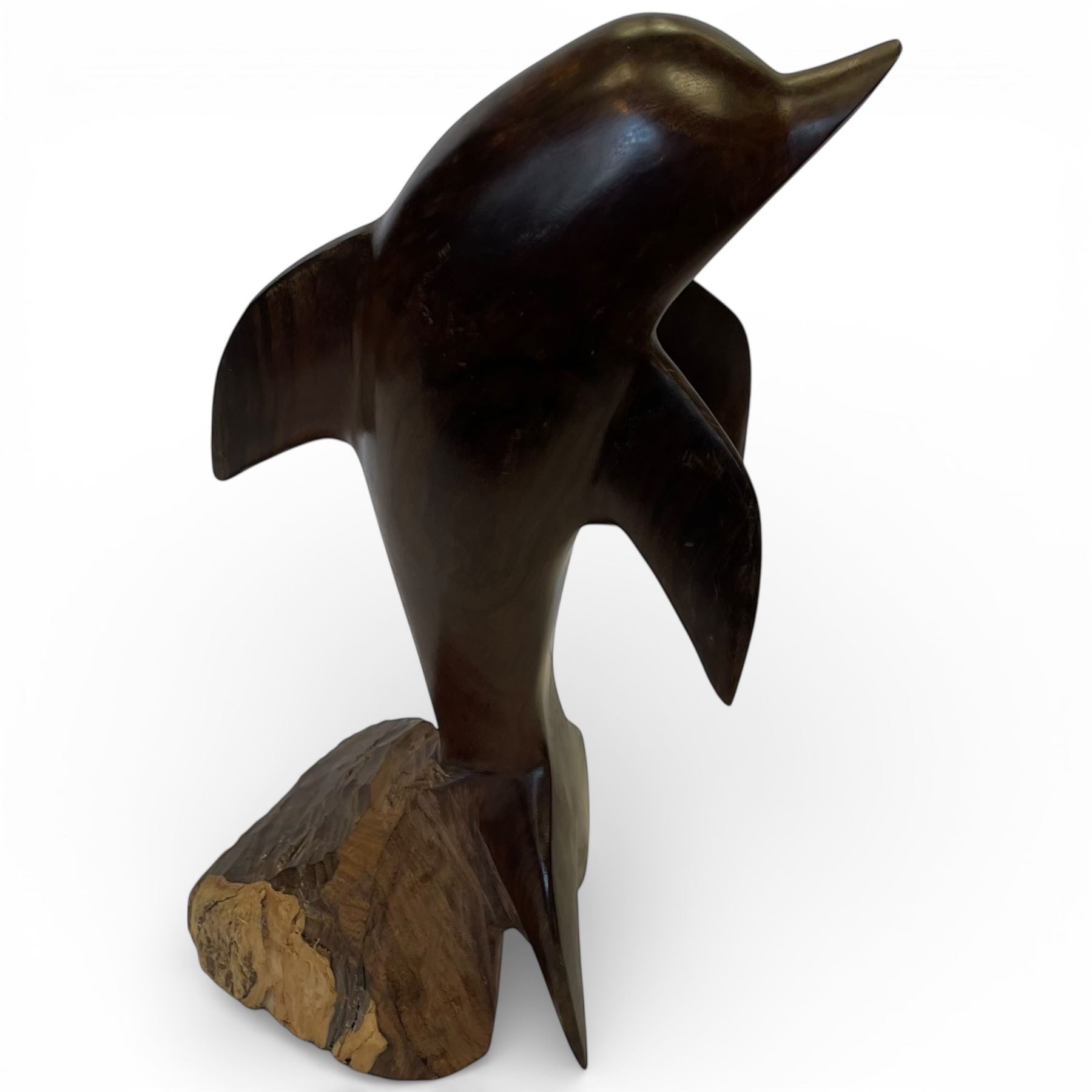 Hand-carved dolphin sculpture made from Koa wood, known for its rich grain and coloration. Measures 14-Inch in height. Item is as pictured.