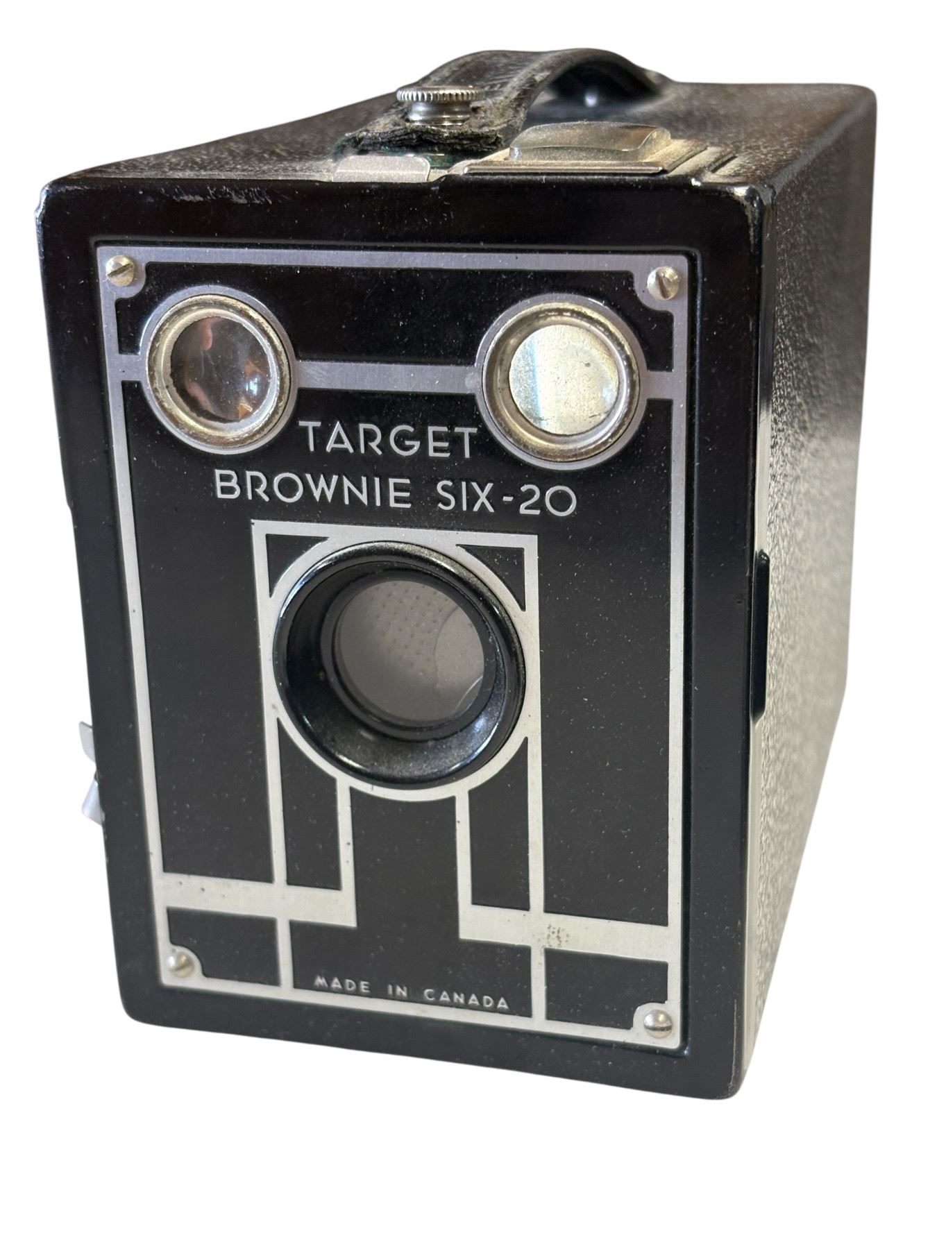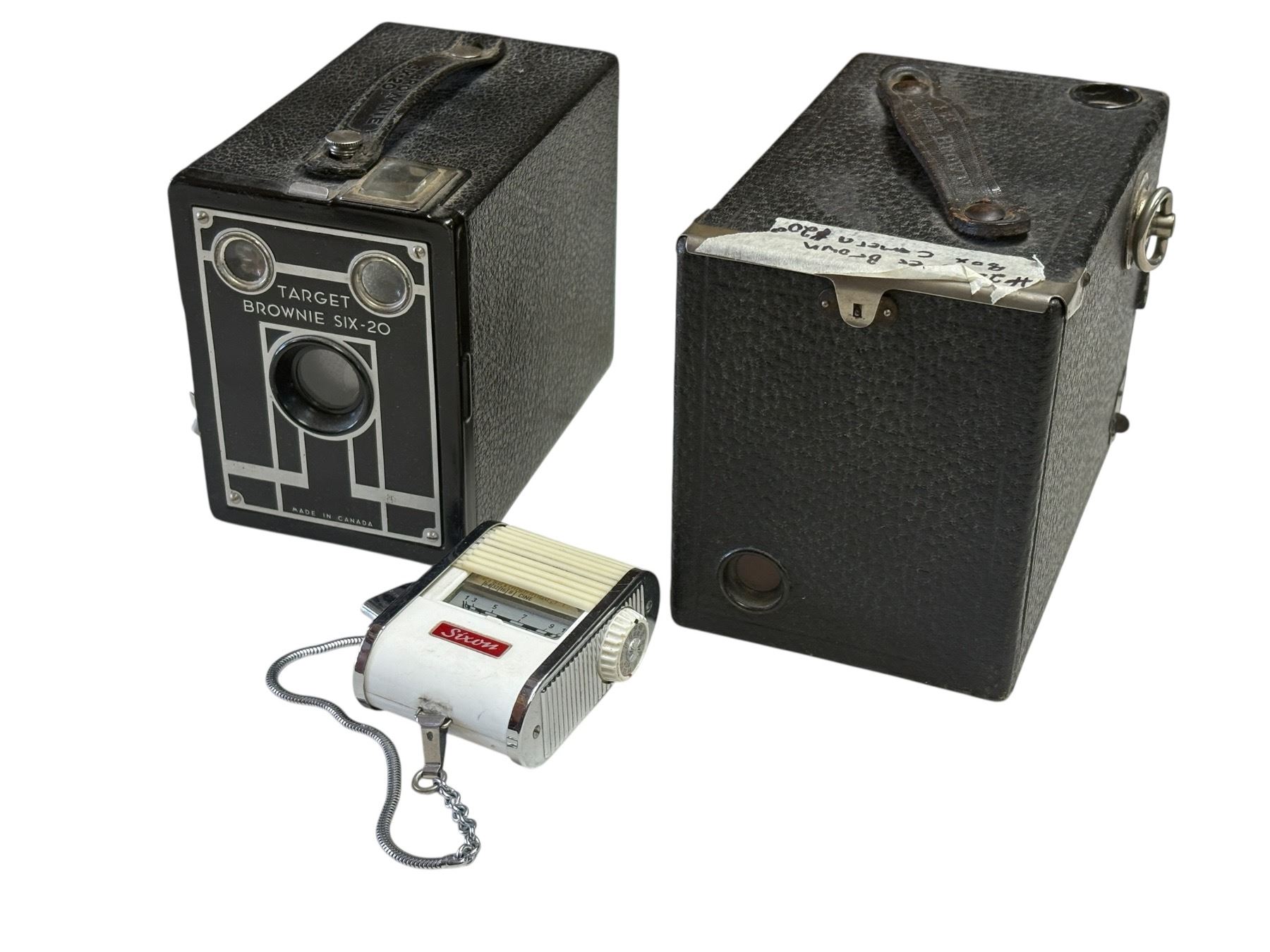 Set includes a Kodak Brownie Six-20 box camera, introduced in the 1930s, designed for 620 roll film, and an Ansco No. 2 Buster Brown box camera, produced circa 1910s-1920s for 120 roll film. Both feature box camera construction and were staples of early amateur photography.