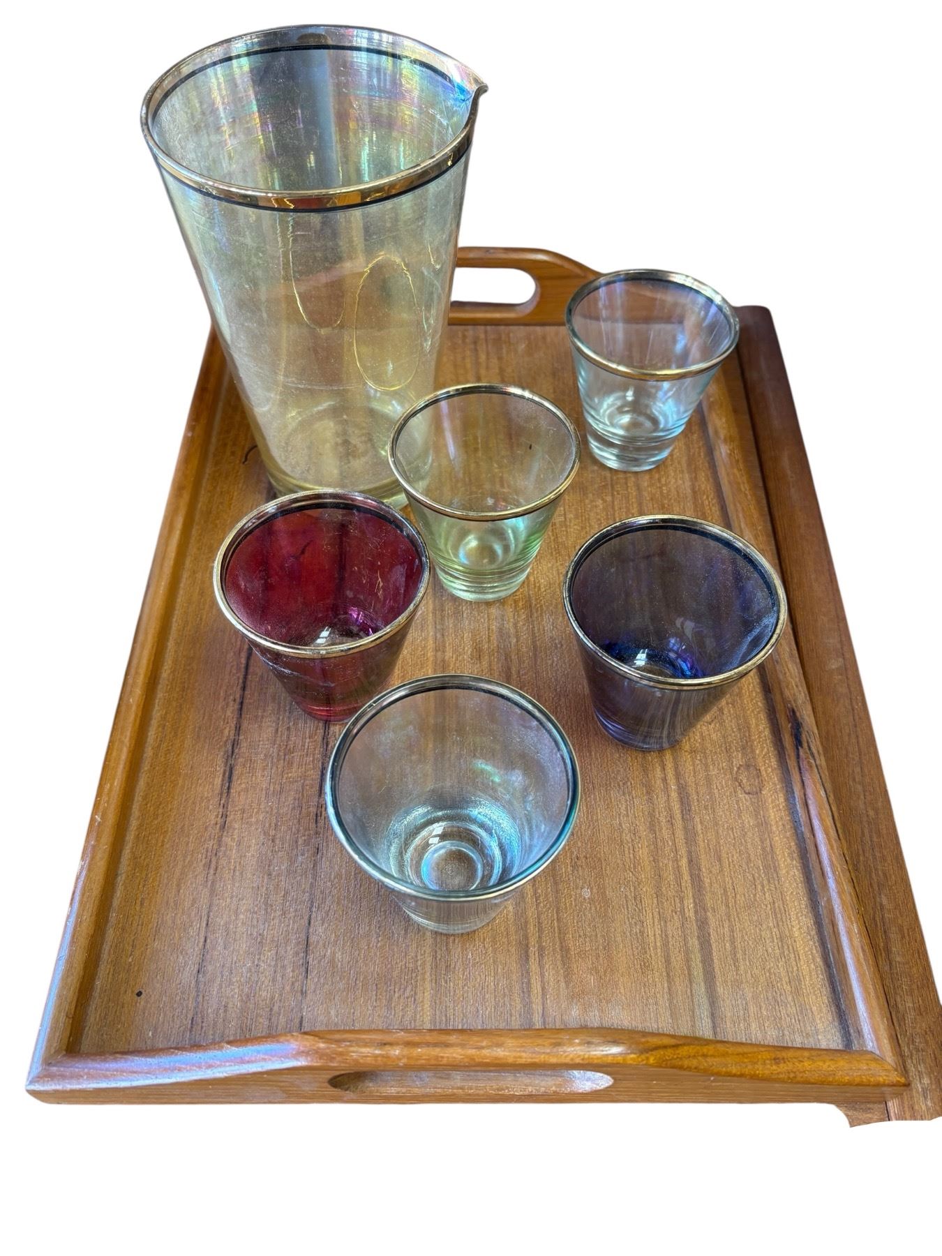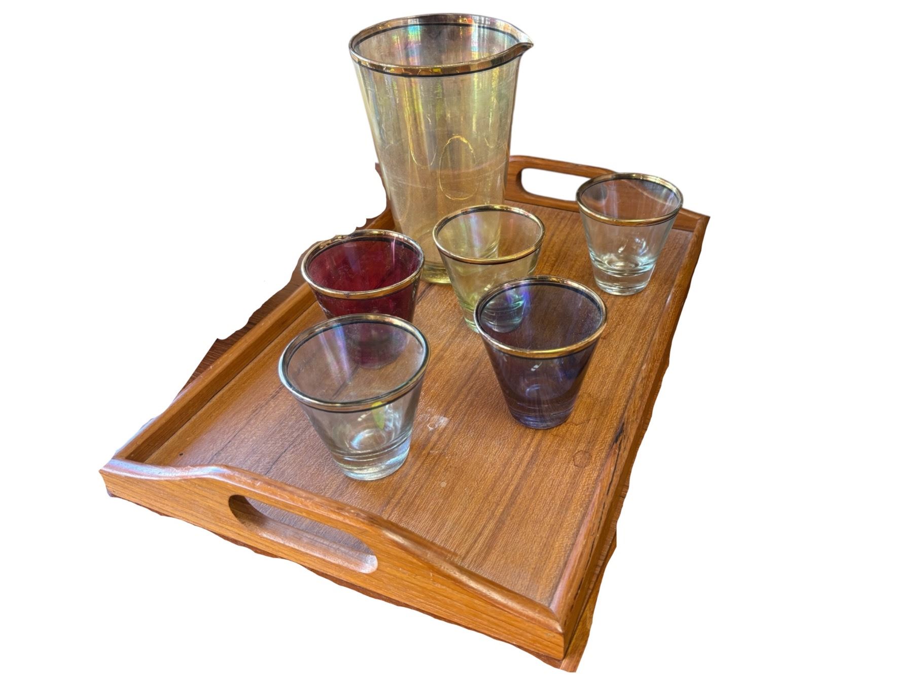 Kosta Boda Mid Century Modern set featuring glass pitcher and glasses on a teak serving tray. Known for its Swedish design, Kosta Boda is renowned for high-quality glassware. Includes a coordinated set of glasses and a matching pitcher, complemented by a sleek wooden teak tray. Item is as pictured.