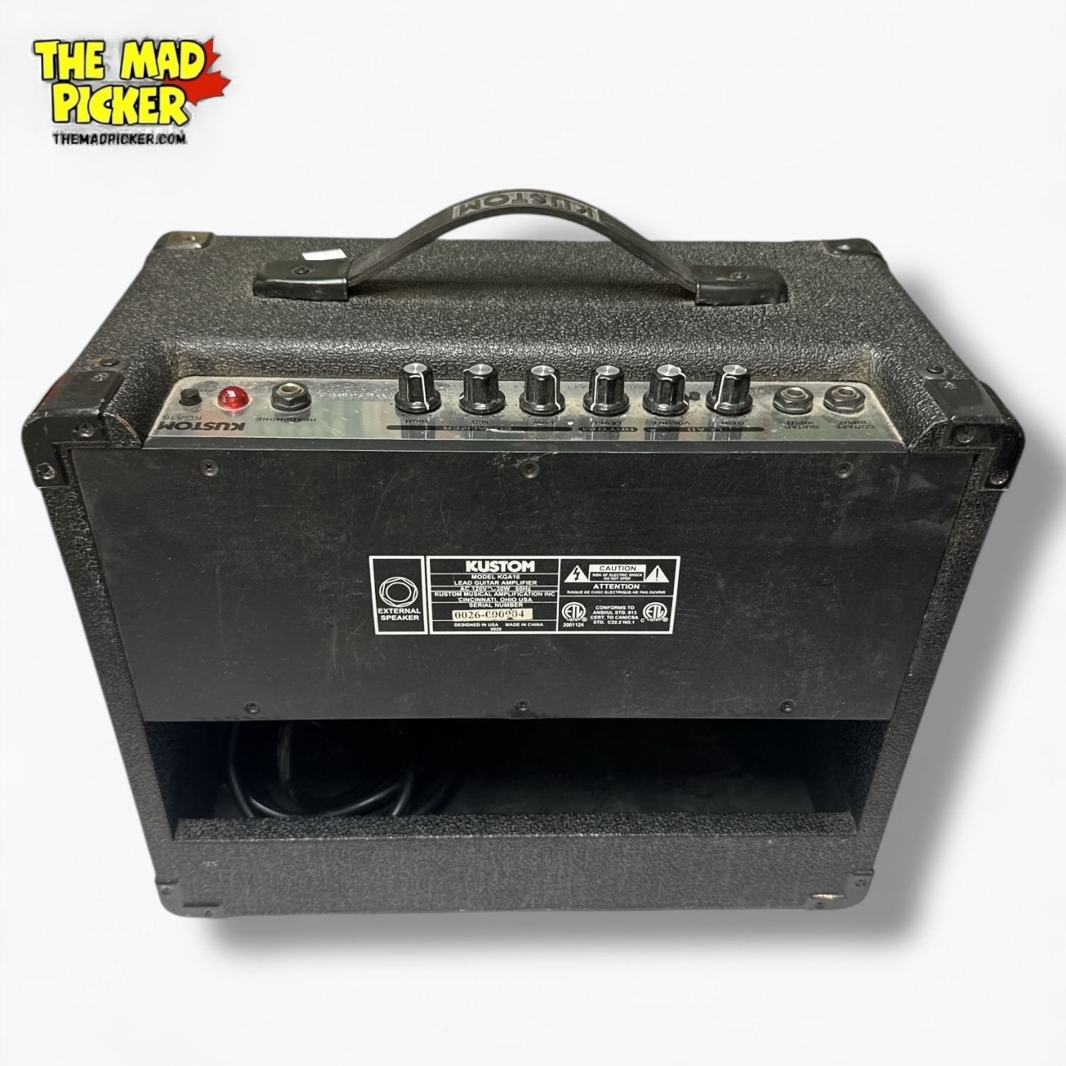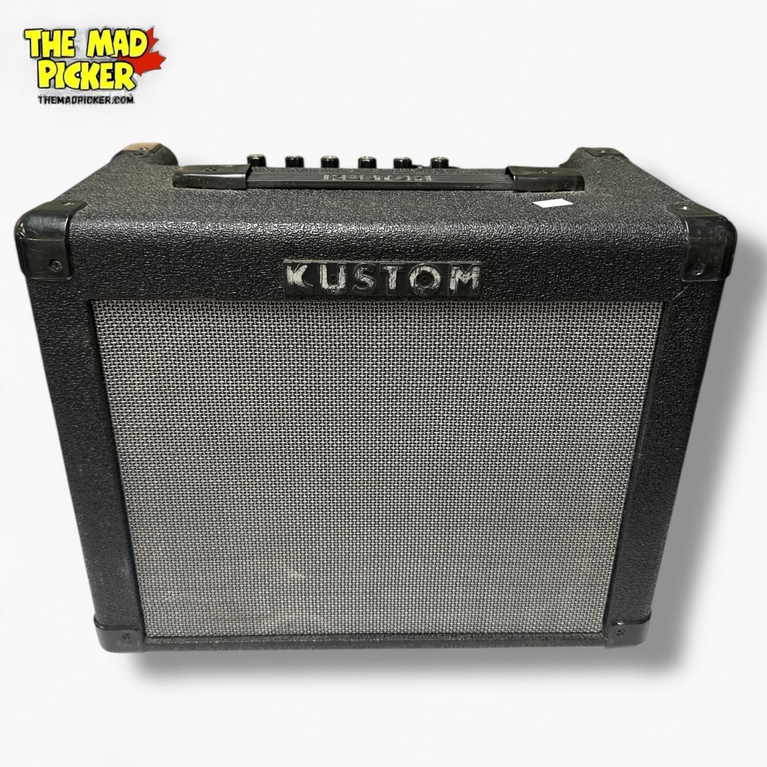 Kustom KGA16 guitar amplifier featuring a 16-watt output and 8-inch speaker. Includes clean and gain channels with shared EQ for tone control. Compact design with a built-in headphone jack for private practice. Durable black housing with classic styling. Suitable for practice and small performances.