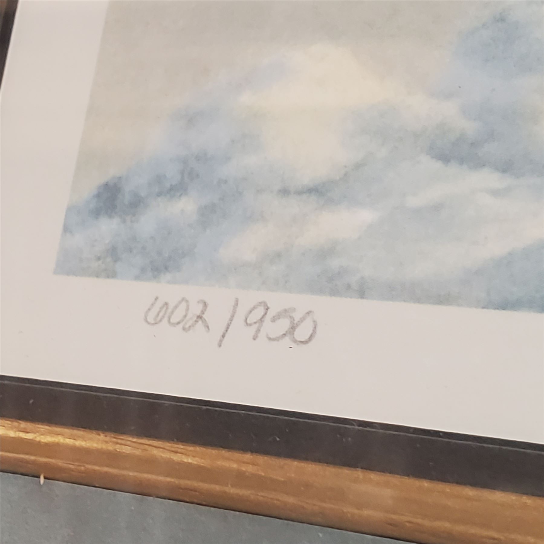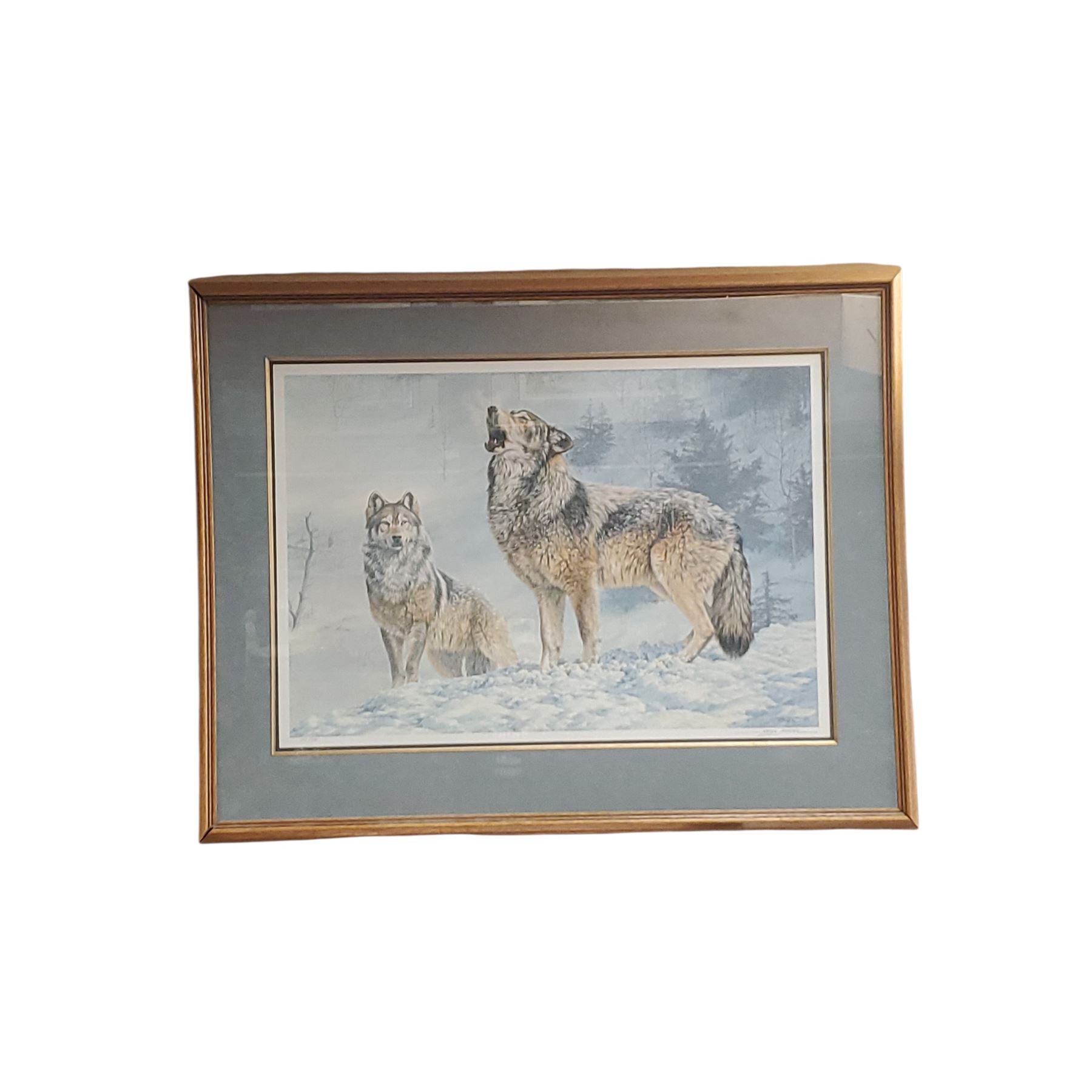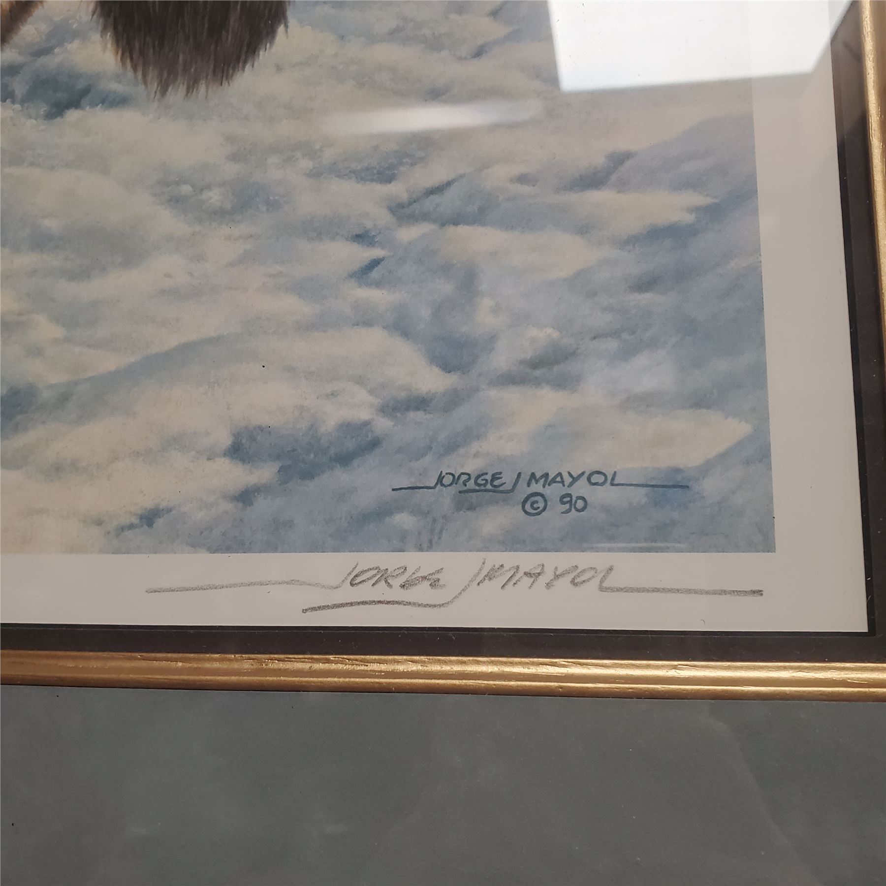 Limited edition print by Jordan Mayol titled 'Wolf' created in 1990. Numbered 602/900. Measures 38x30-Inch. Features a detailed depiction of a wolf in a natural setting. Edition size and artist signature included. Item is as pictured.