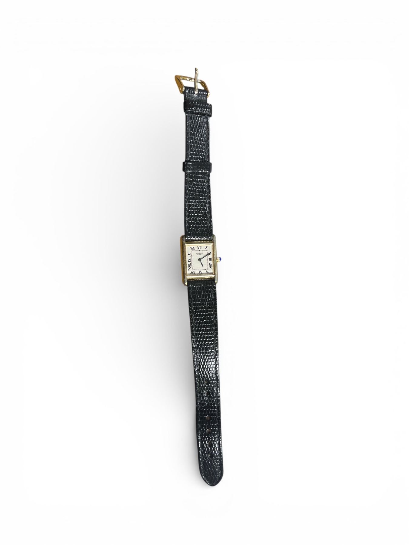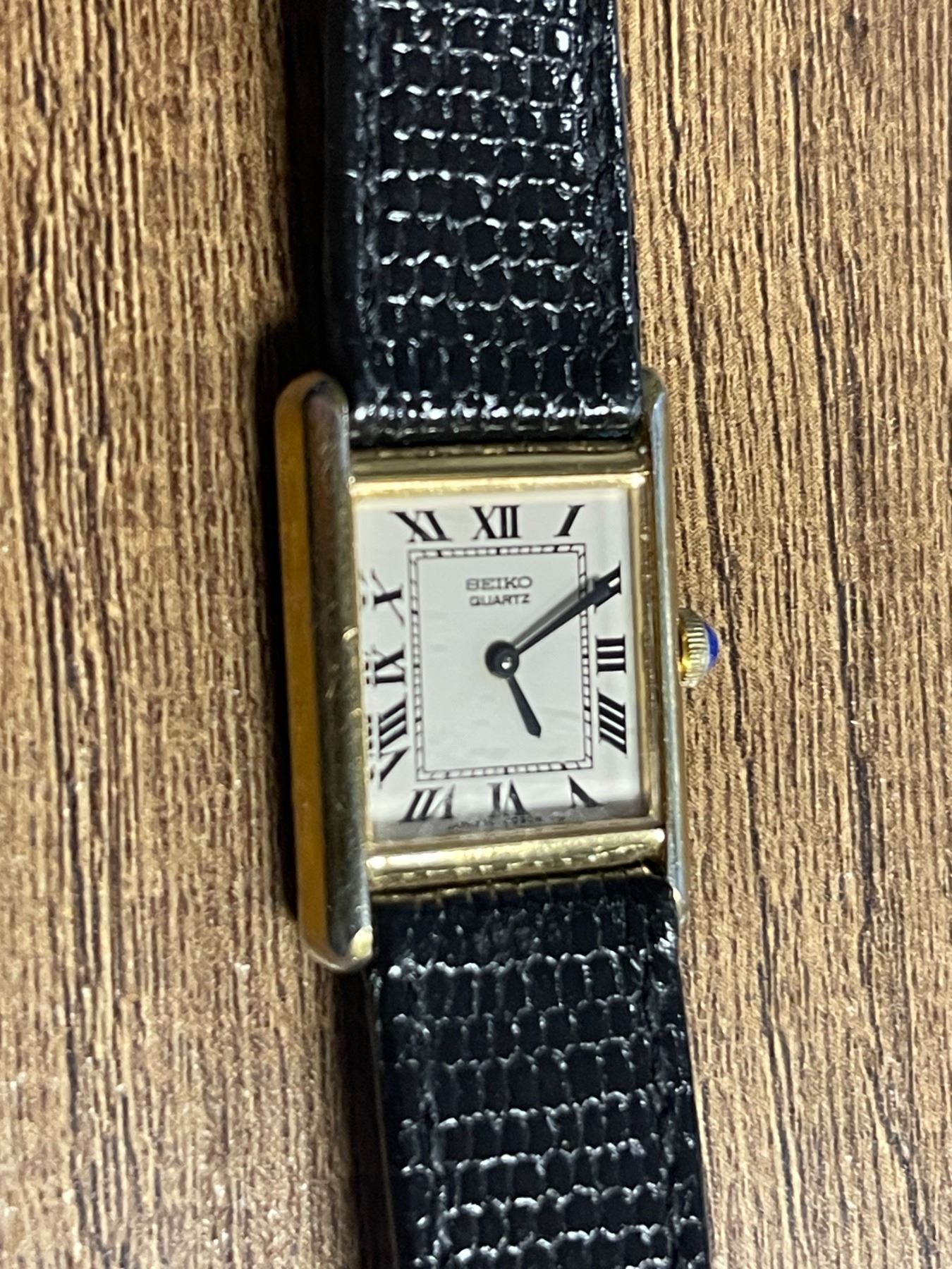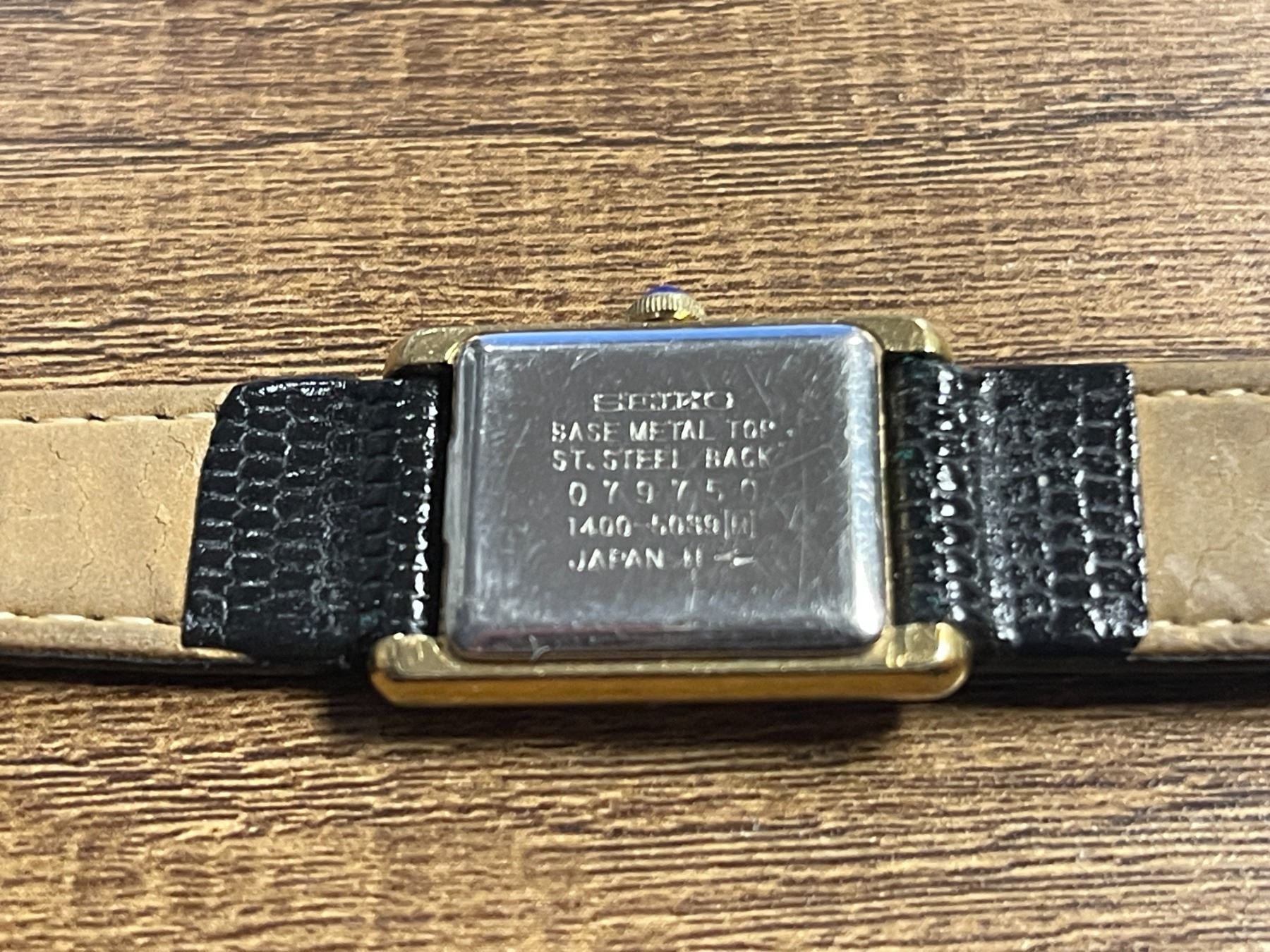 Lady's Seiko Quartz Tank Watch gold-plated over base metal with small square dial and a black leather strap - Appraised Value $140
