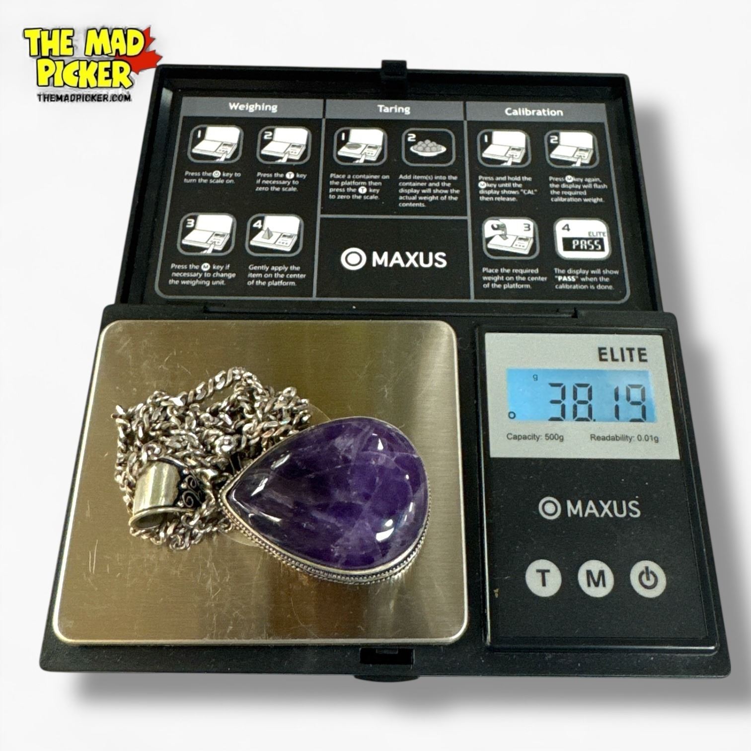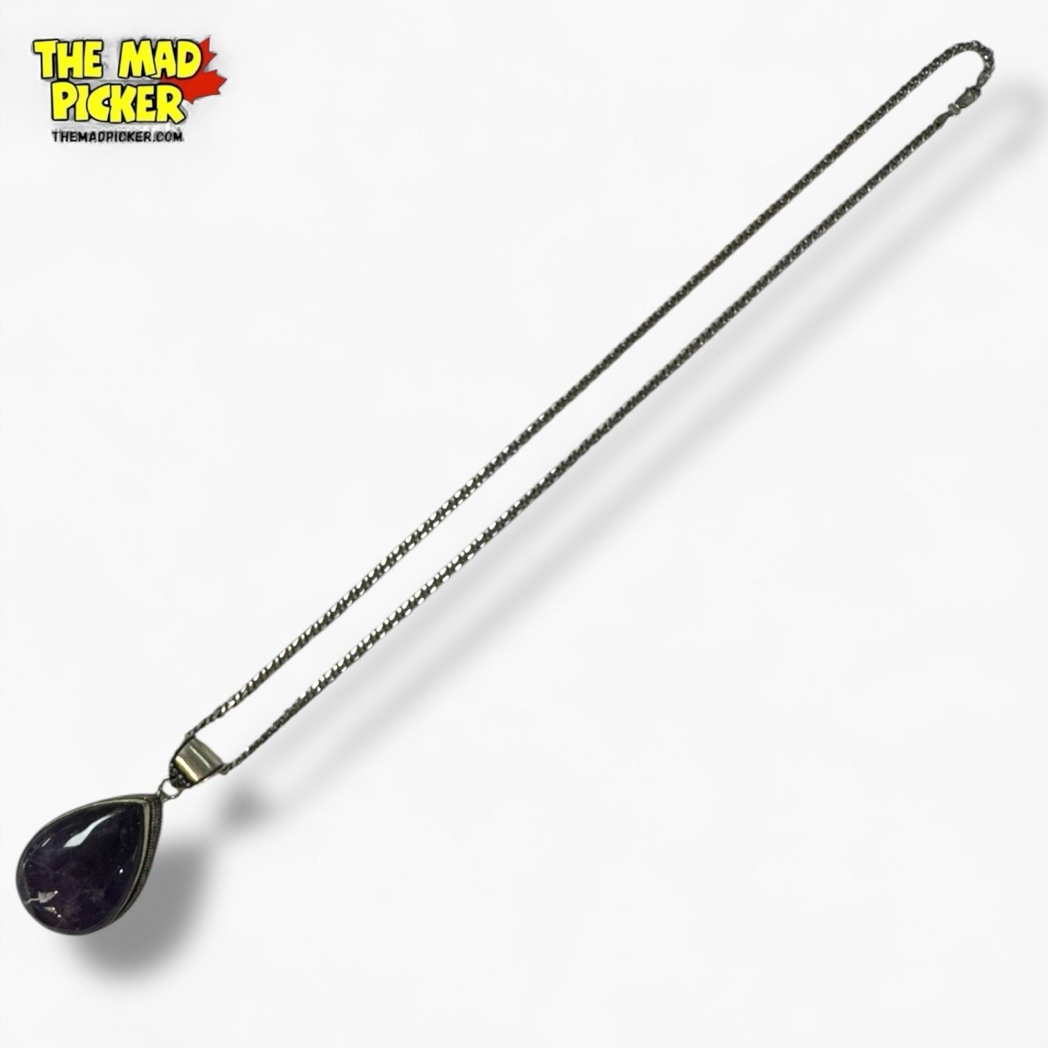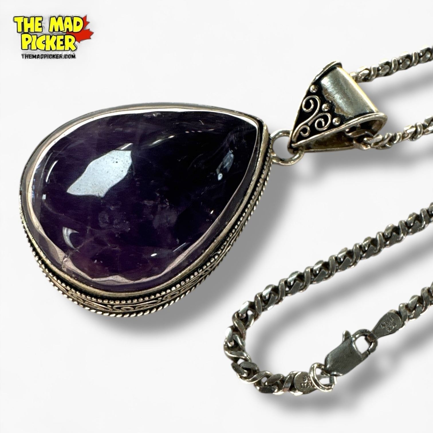 Large .925 Sterling Silver Polished Amethyst Teardrop Necklace - 14 x 29 x 35 mm pendant on 24" Sterling Chain - Total weight: 38 grams