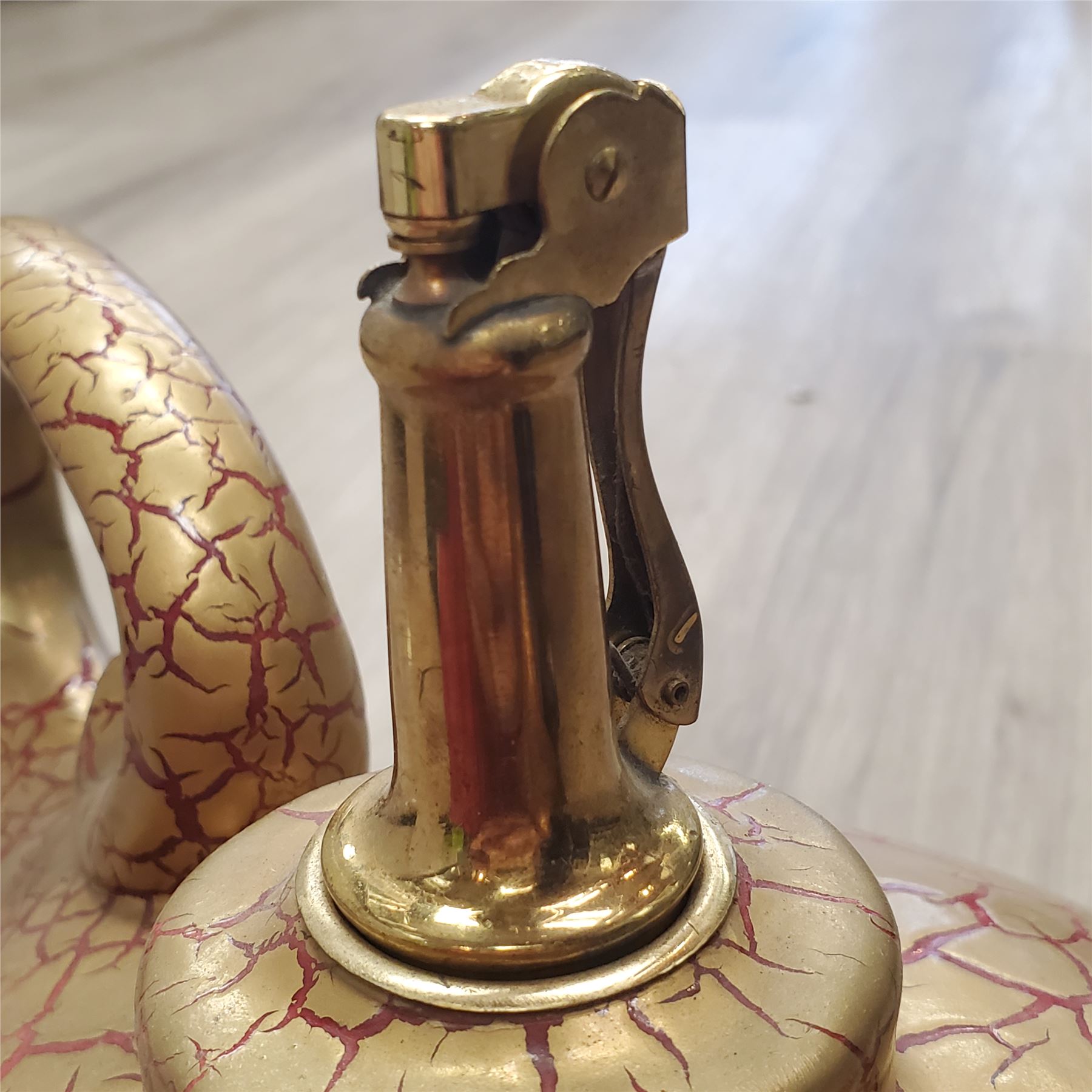Porcelain Aladdin-style genie lamp lighter featuring a red and gold crackle finish. Measures 14.5 inches in length. Includes integrated brass lighter, non-functional but intact. Decorative piece with intricate design and vibrant color. Likely a vintage collectible item.
