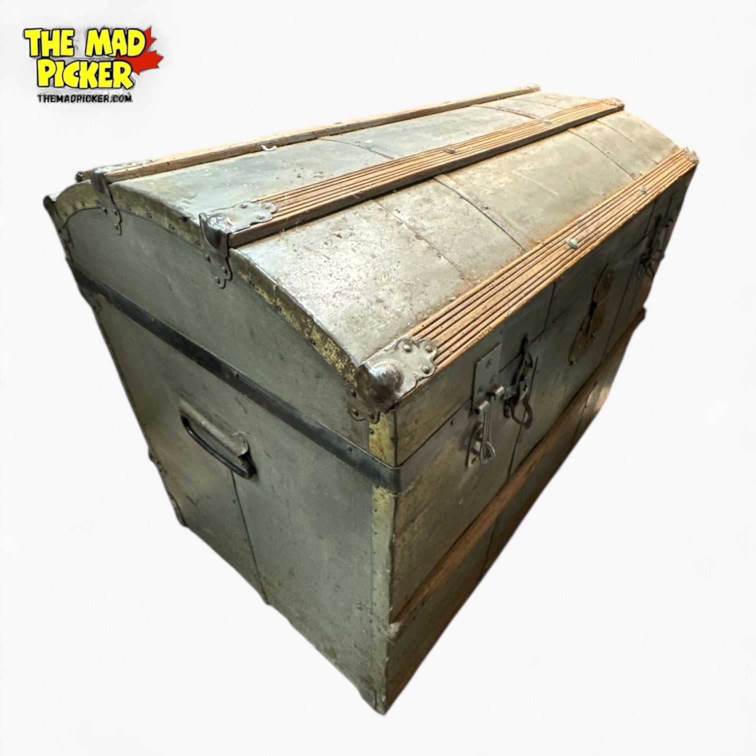 Large antique-style steamer trunk measuring 29 1/2in x 18 1/2in x 23 1/2in tall. Features decorative metal hardware, wood lining, and a hinged lid. Constructed with metal accents and leather straps for a vintage aesthetic. Suitable for storage or decorative use.