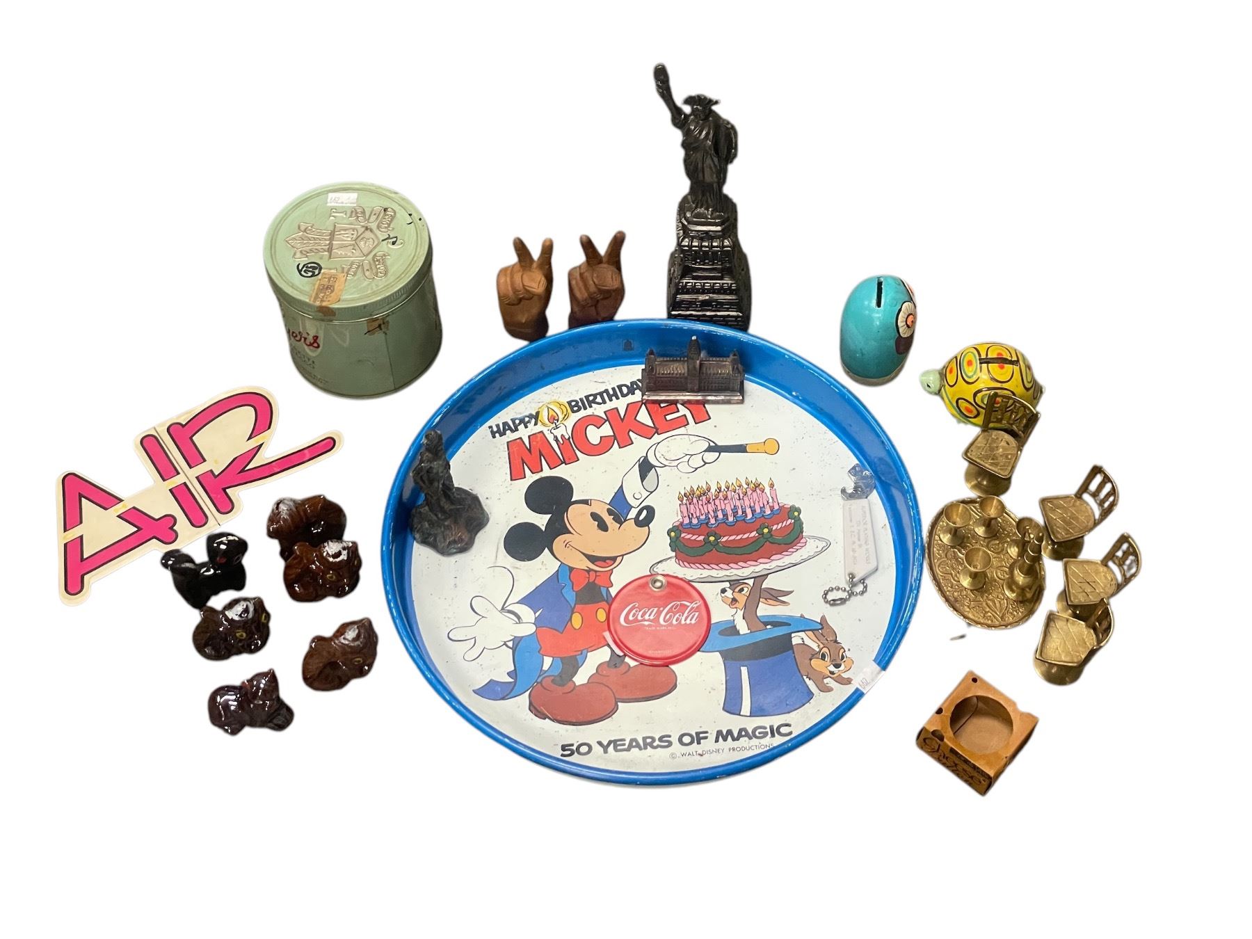 Large Assortment Of Vintage Collectibles, Disney Serving Tray, Miniature Brass Furniture, Etc..