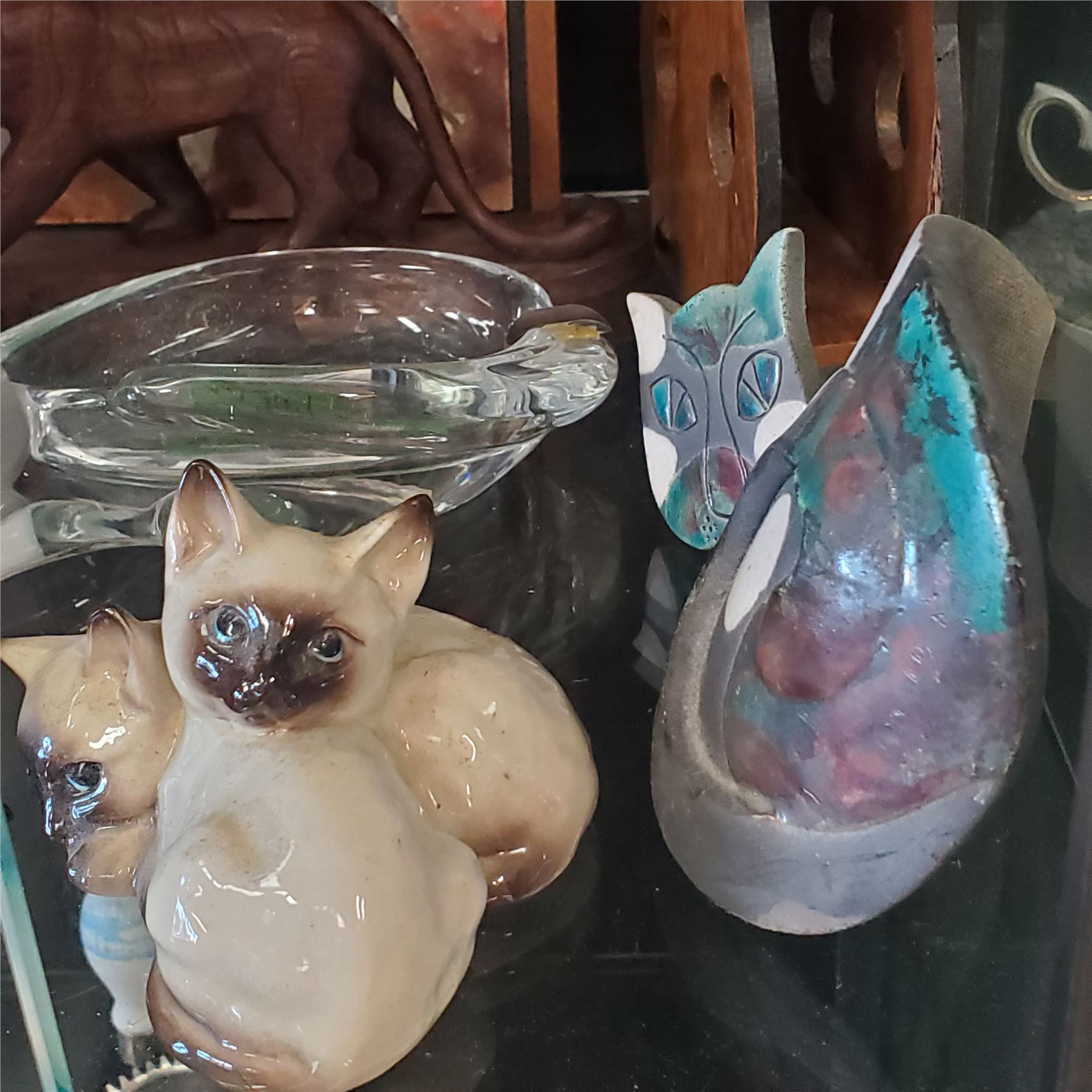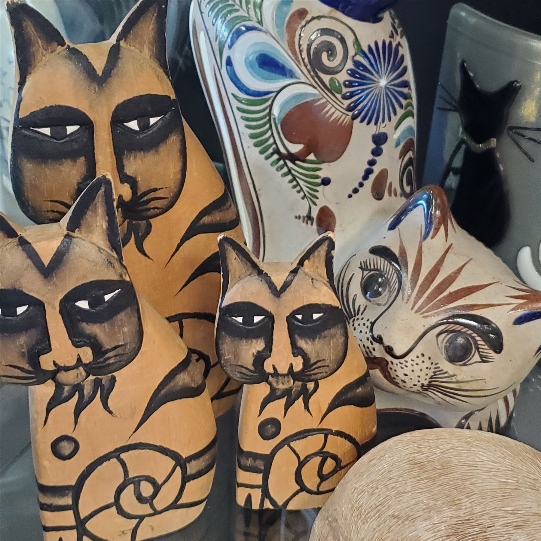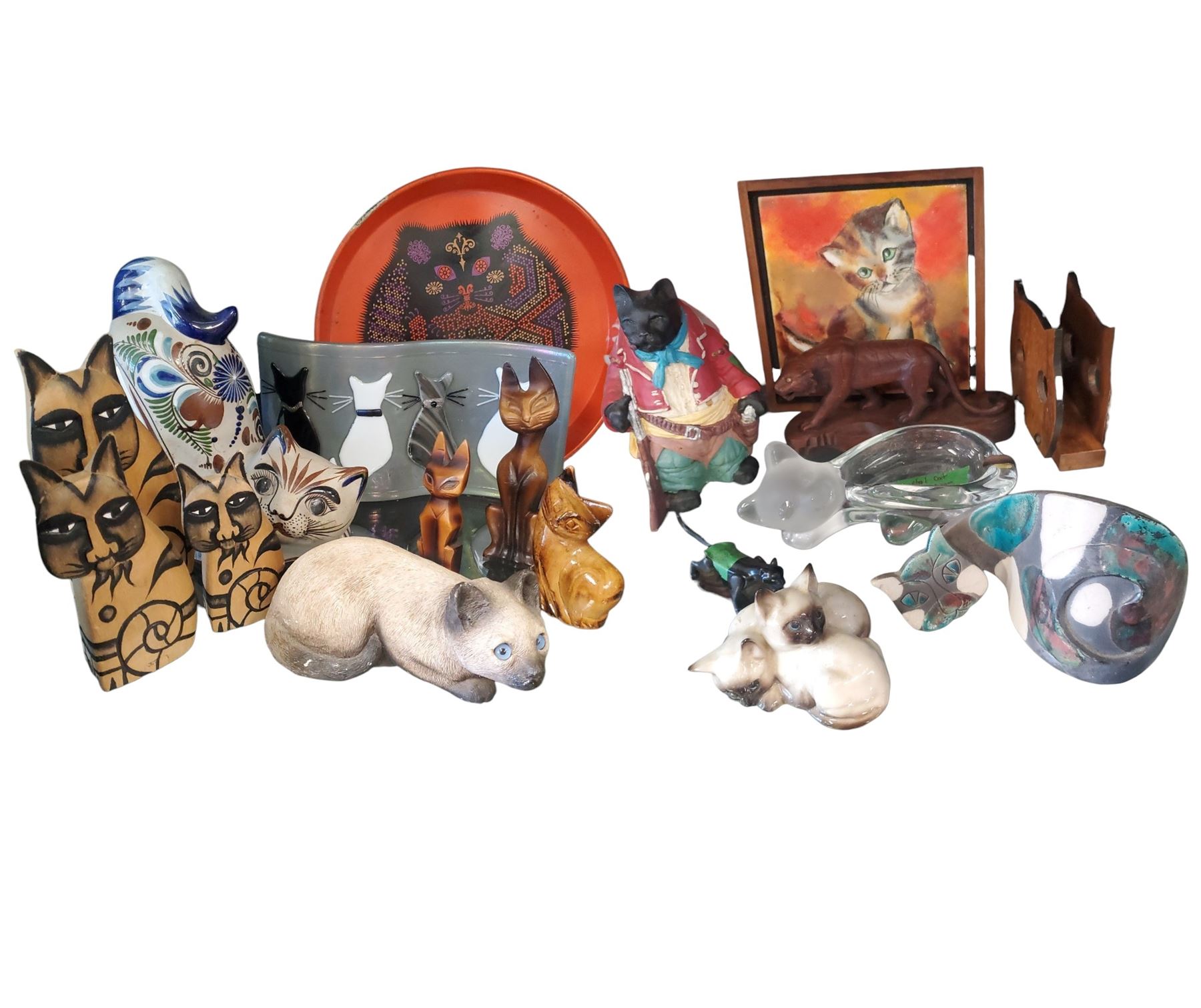 A diverse collection of collectible cat figurines crafted from wood, porcelain, glass and metal. This lot includes various designs and styles appealing to cat enthusiasts and collectors. Items are as pictured and display materials widely used in figurine crafting.