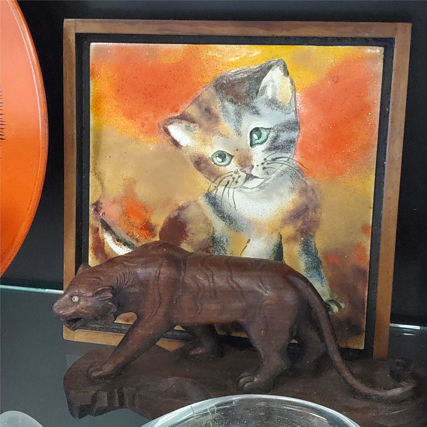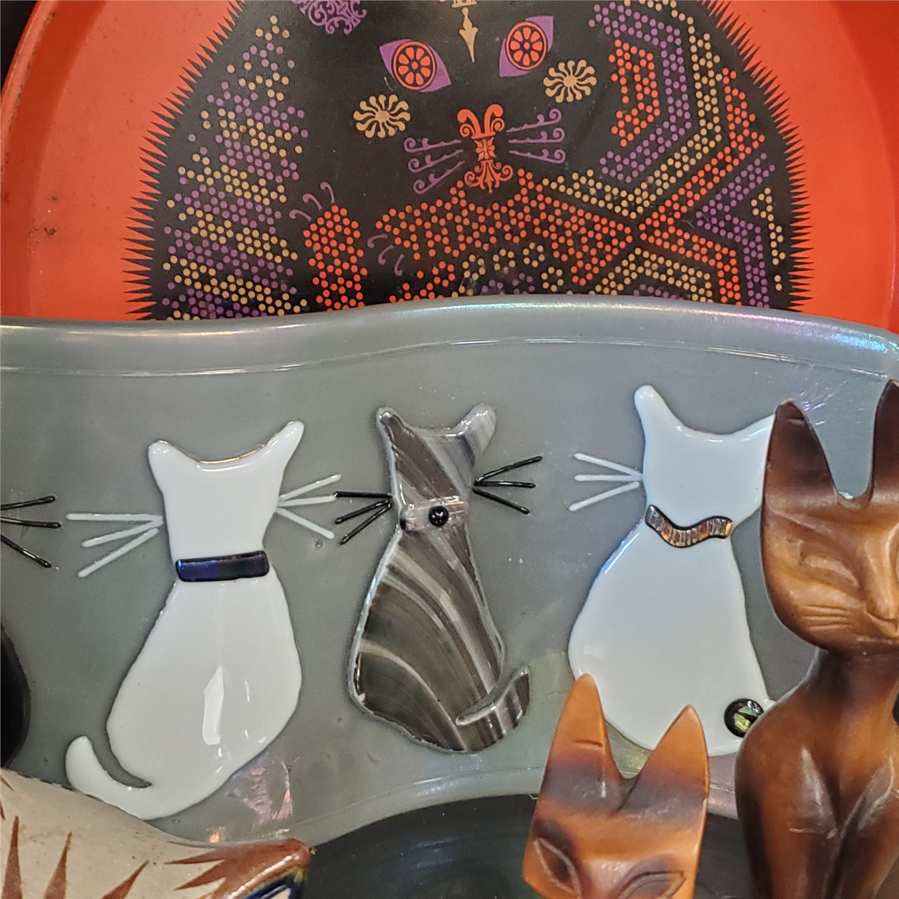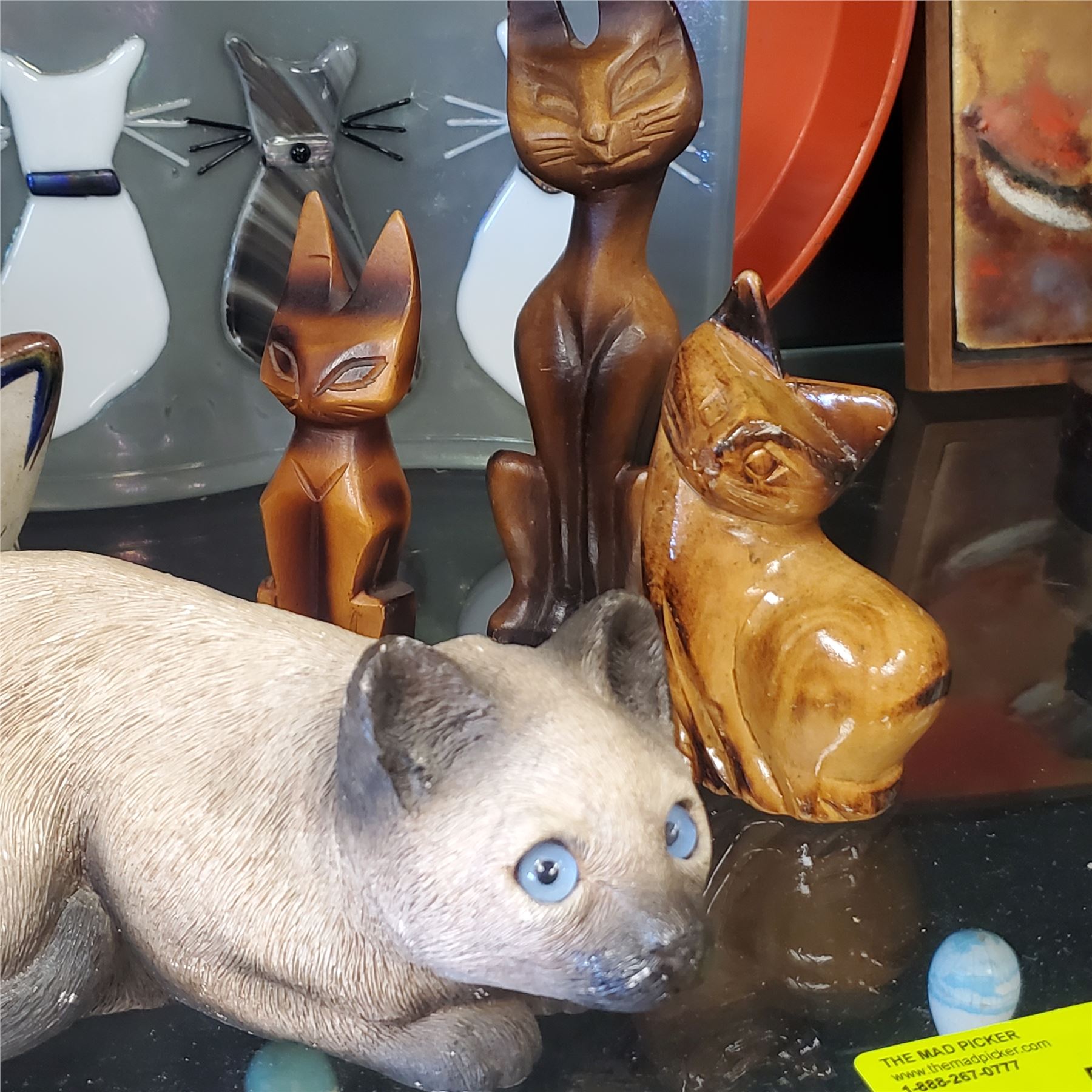 A diverse collection of collectible cat figurines crafted from wood, porcelain, glass and metal. This lot includes various designs and styles appealing to cat enthusiasts and collectors. Items are as pictured and display materials widely used in figurine crafting.