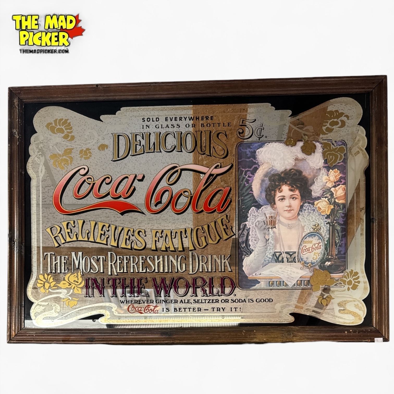Large vintage Coca-Cola mirror featuring a framed advertisement. Displays iconic Coca-Cola branding and artwork. Likely from the mid-to-late 20th century. Wooden frame with glass mirror insert. Size unspecified but categorized as 'large' based on description. Ideal for decorative or collector purposes.