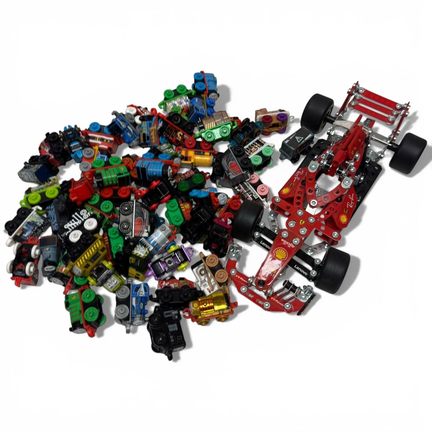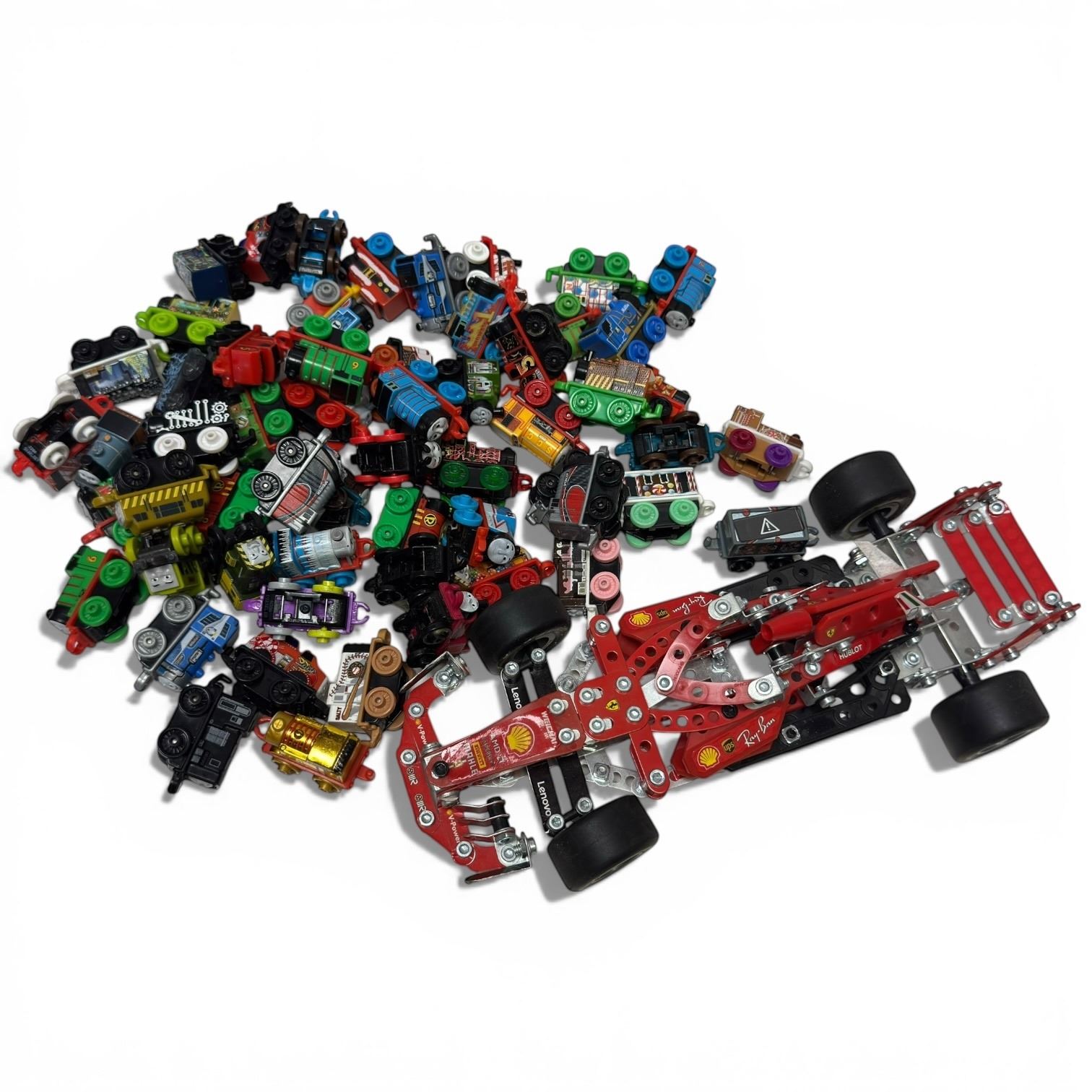 Collection includes 45+ Mattel Thomas & Friends collectible mini trains featuring characters from the series. Also includes a Technics Meccano Ferrari F1 Grand Prix Racer model kit. Item is as pictured.