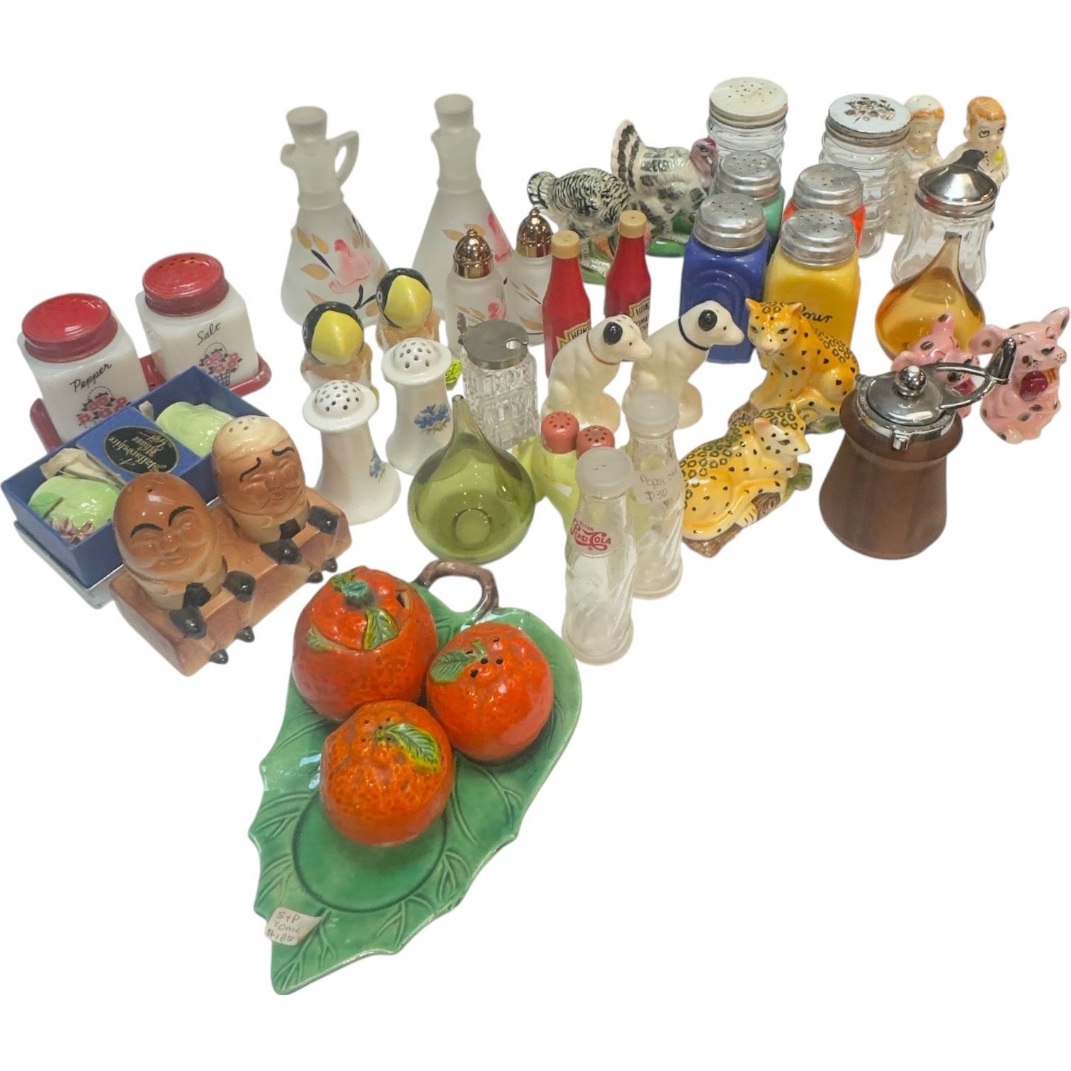 A large collection of assorted salt & pepper shakers featuring various materials, genres, and styles. Includes shakers made from ceramic, glass, metal, and more, with designs ranging from vintage to whimsical motifs. Item is as pictured.