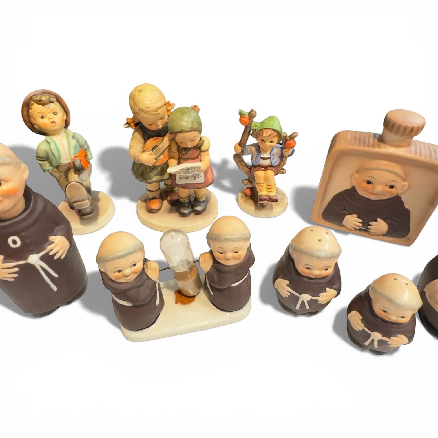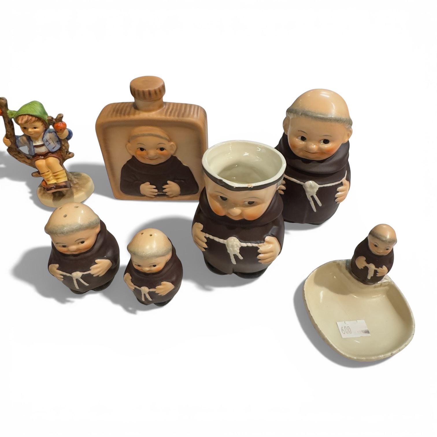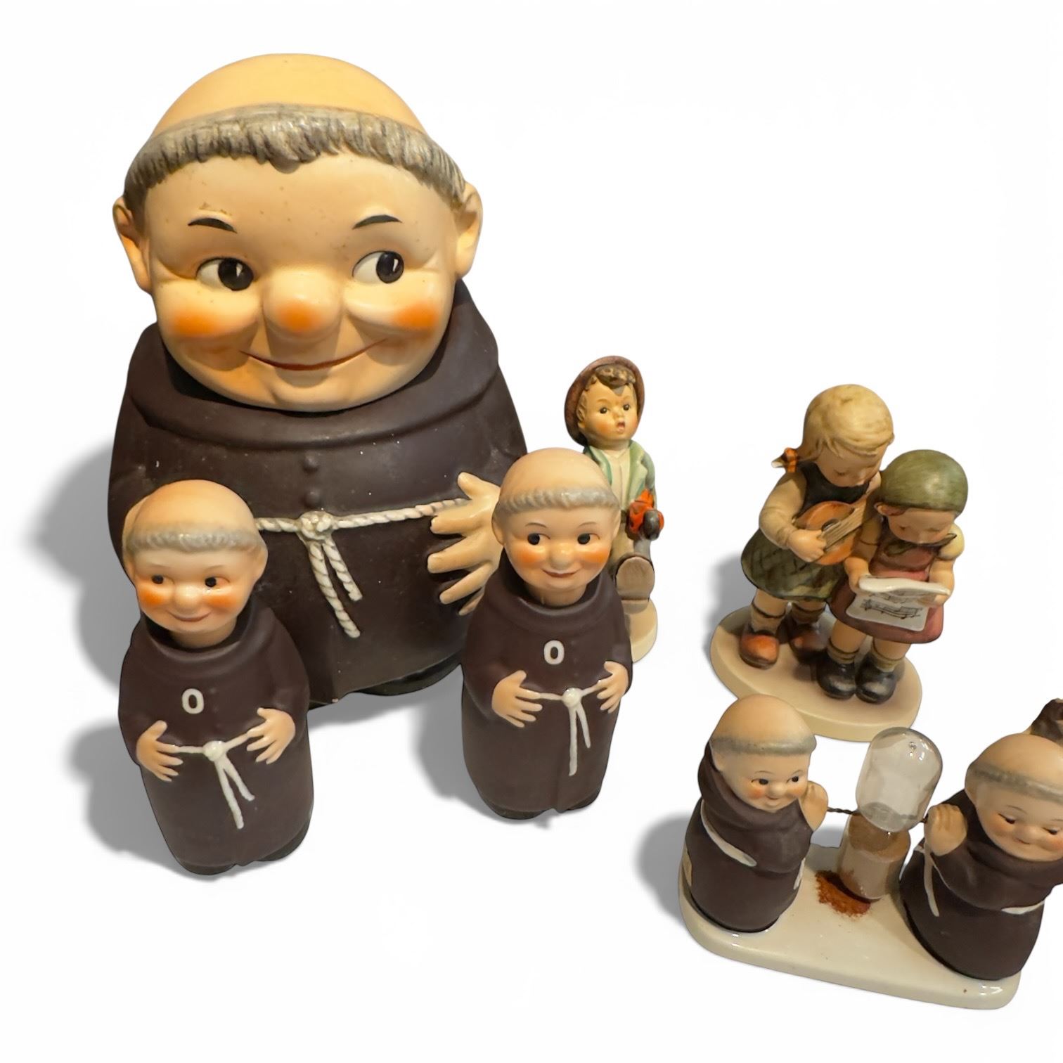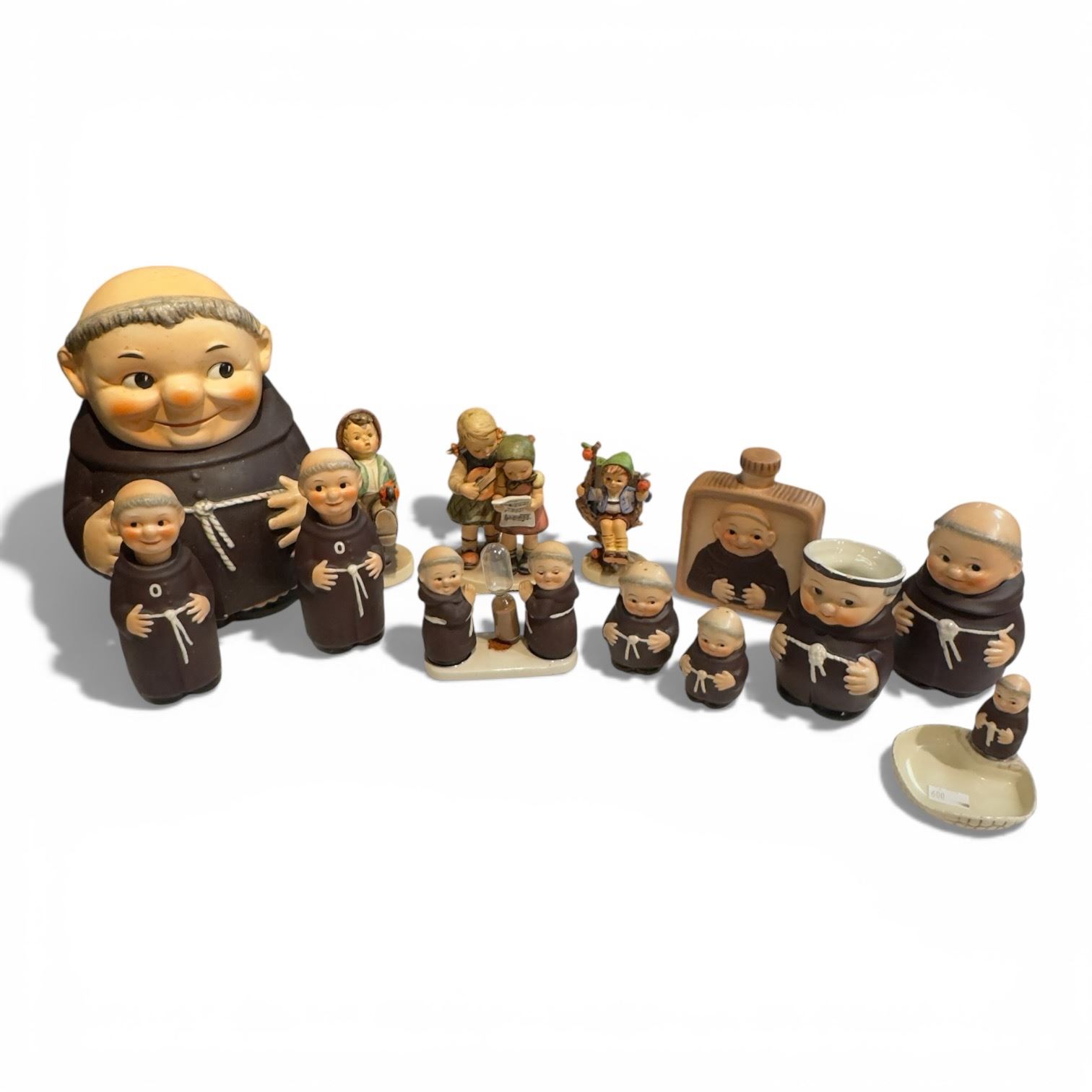 Large collection of Goebel Friar Tuck monk-themed tableware, with the tallest piece measuring 10-Inch in height. Additionally includes 3 Hummel figurines. Known for their distinctive design and craftsmanship. Item is as pictured.
