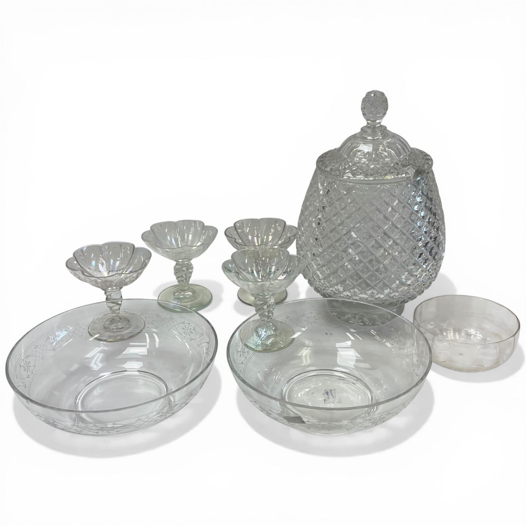 Large Crystal Candy Dish , 4 Crystal Glasses & 2 Bowls (Candy Dish is 12" tall x 8.5" diameter)