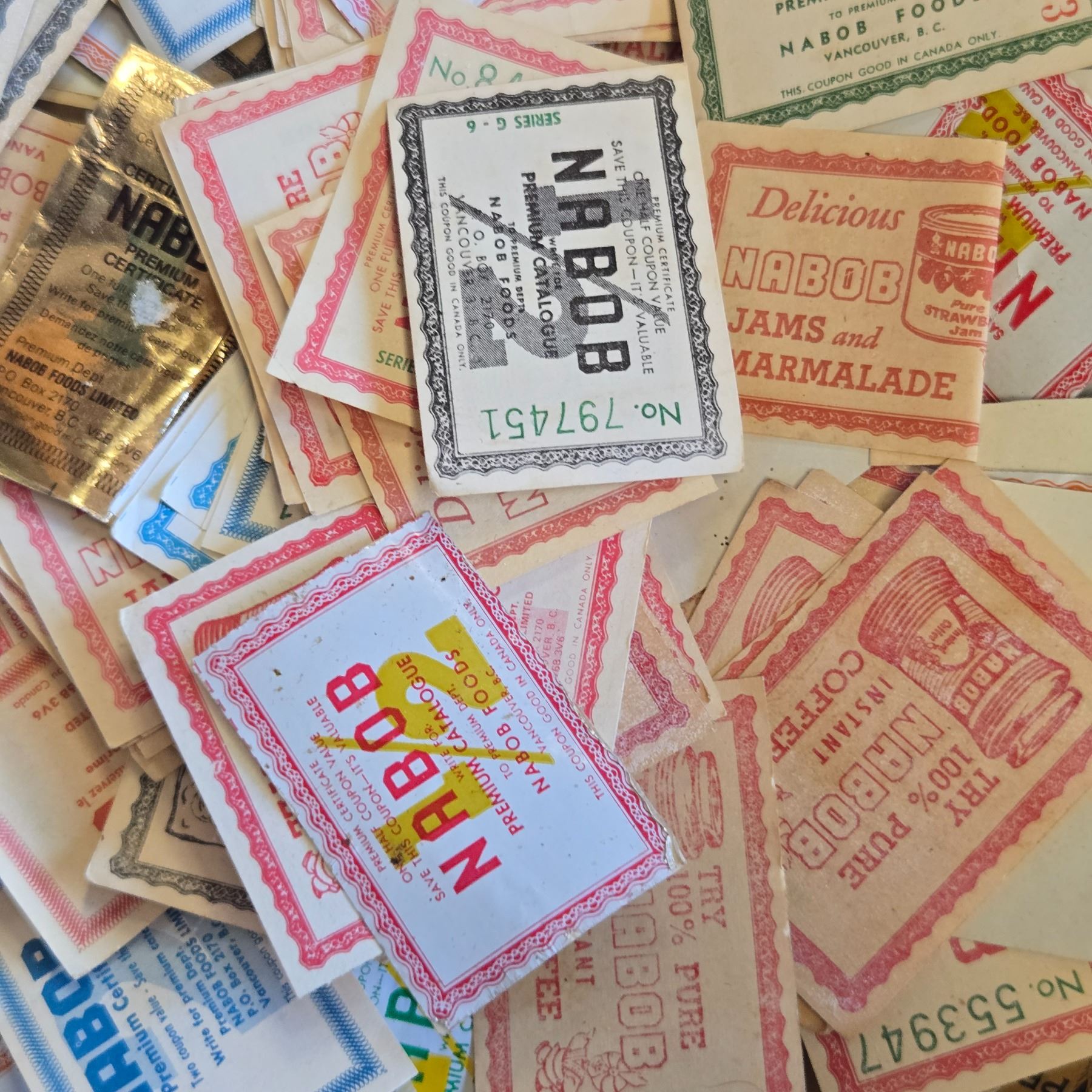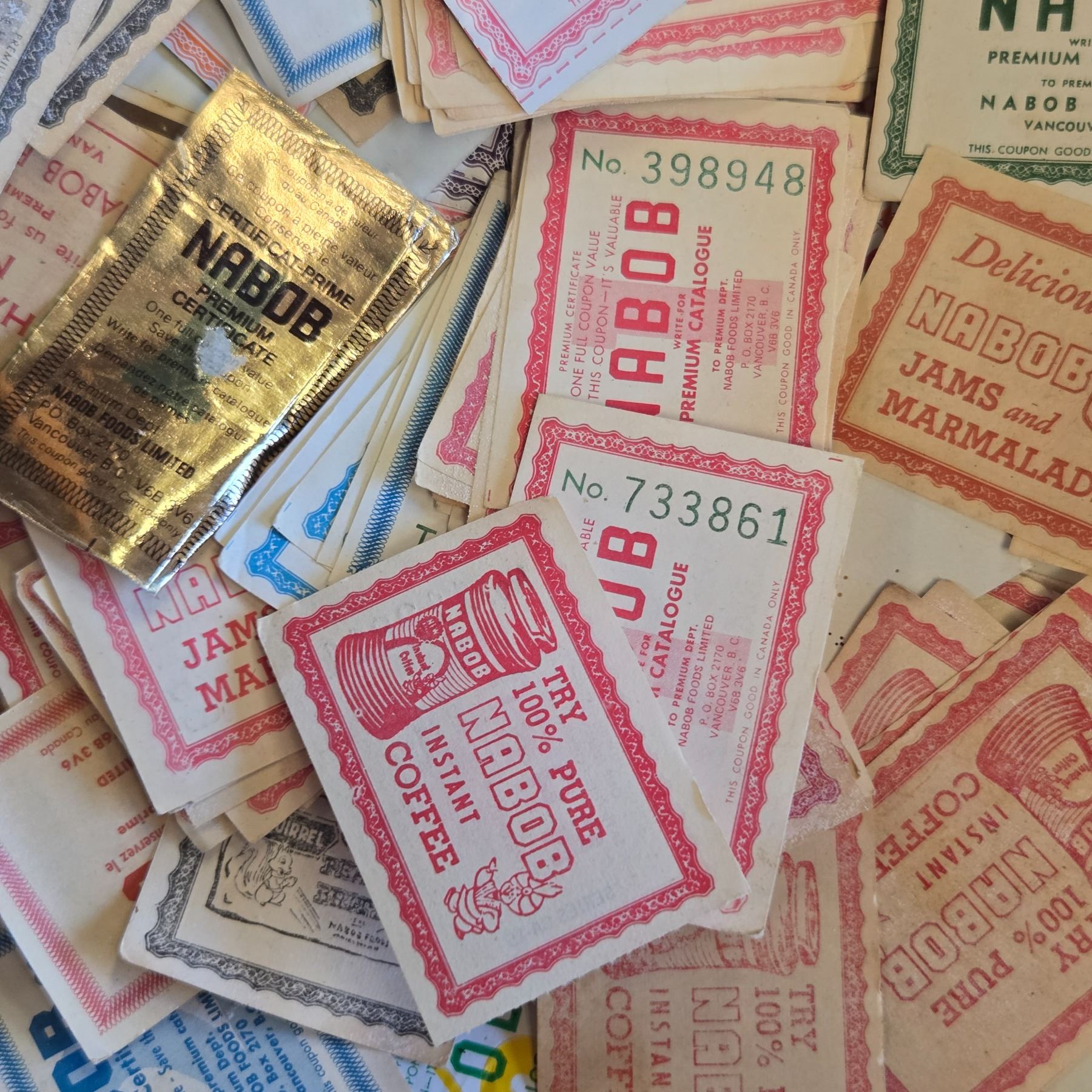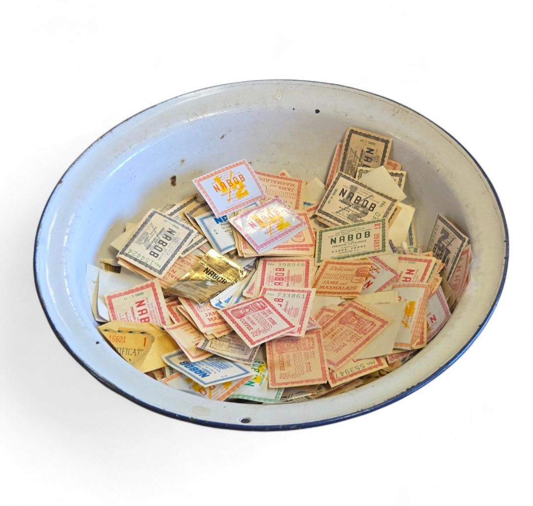 Large enamel bowl containing a collection of vintage Nabob Coffee coupons. The coupons appear to reference an older promotional period for Nabob Coffee products. Bowl has a smooth enamel finish. Item includes the bowl and its coupon contents as pictured.