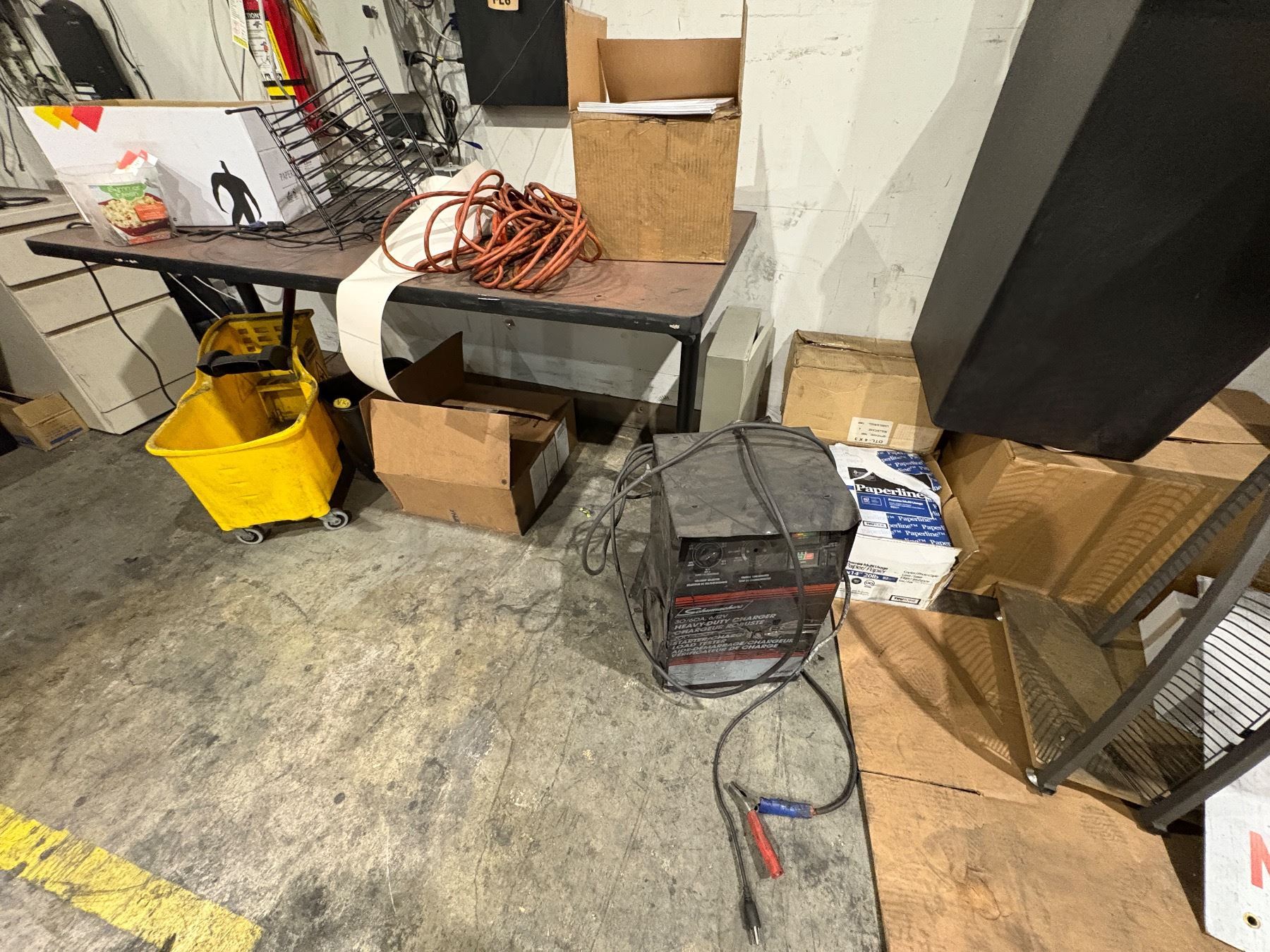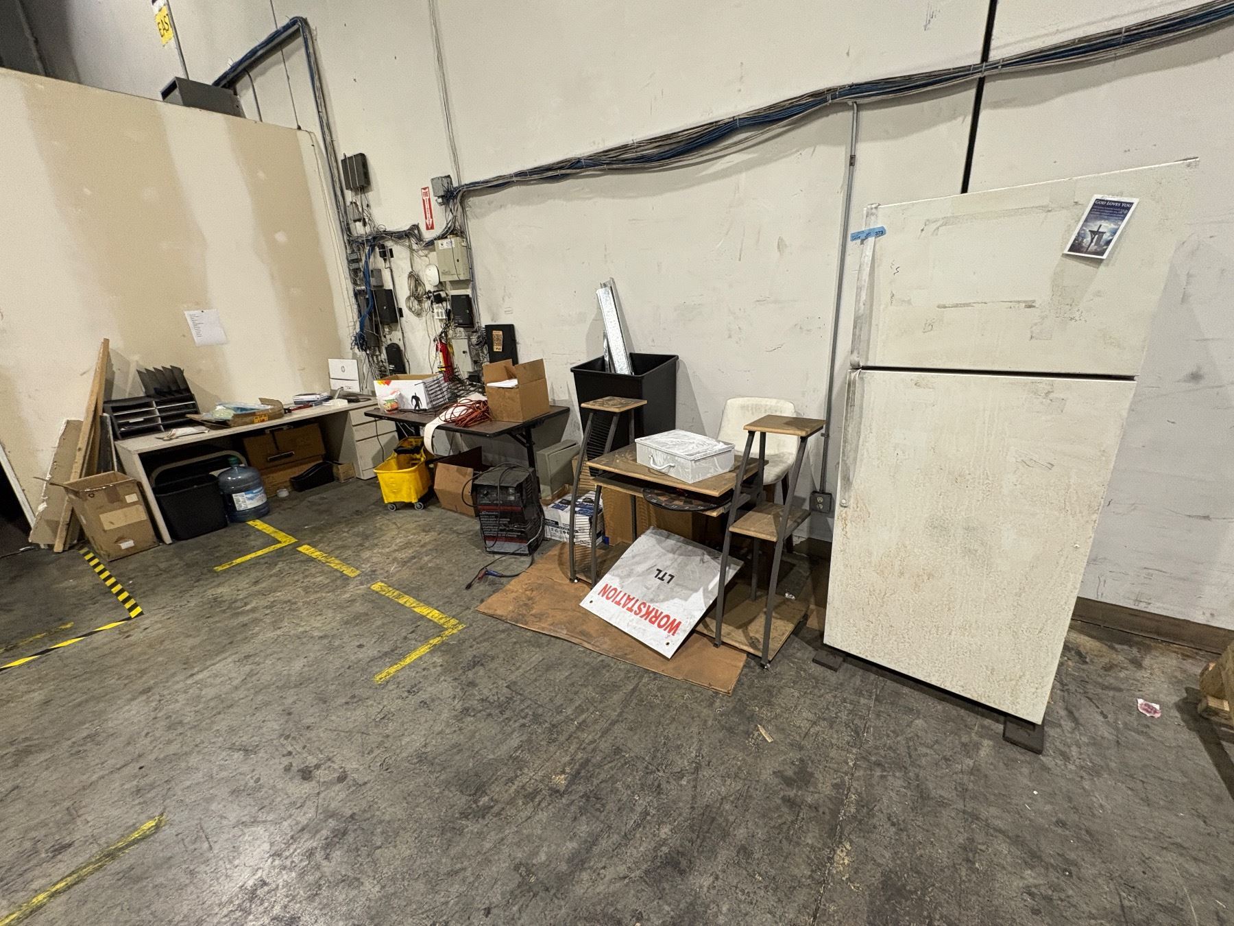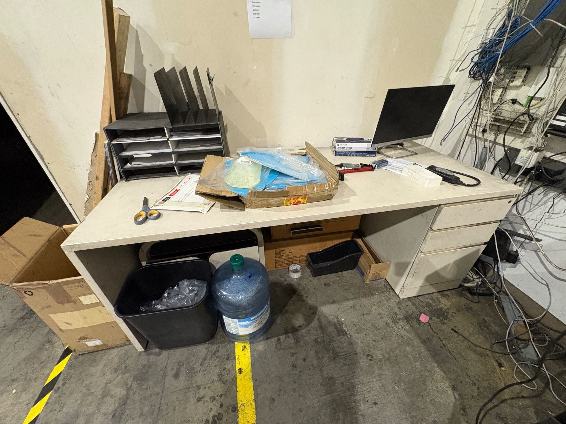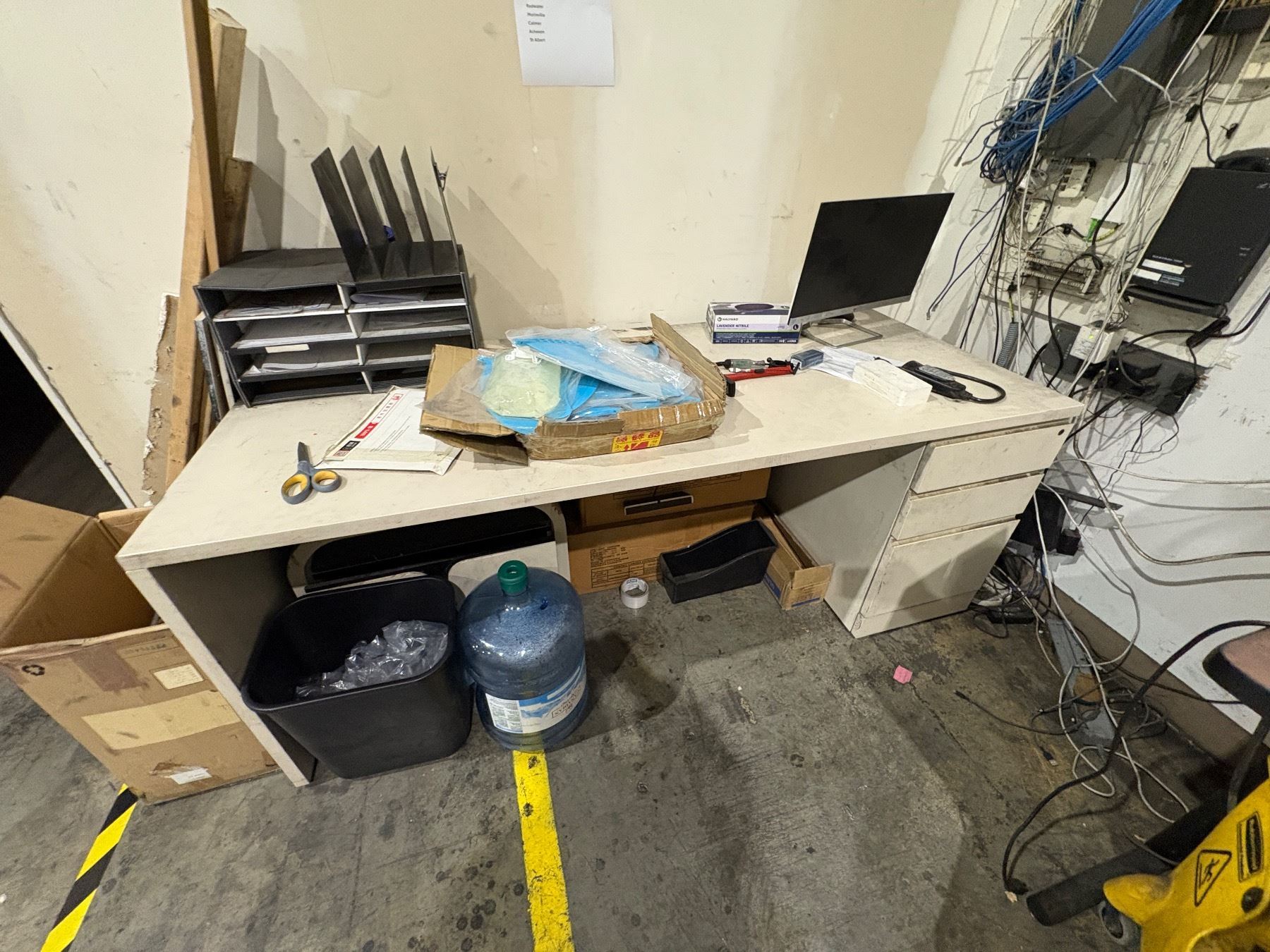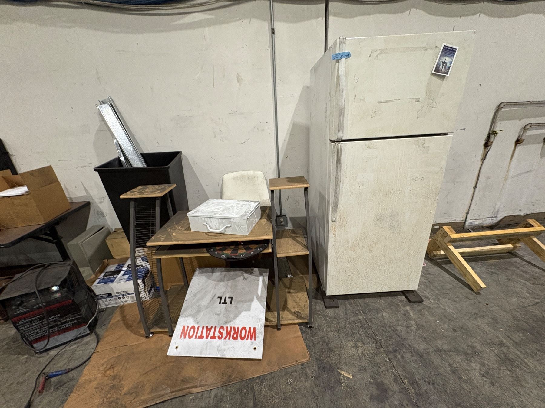 Large Group of Misc - Fridge, Heavy Duty Charger, HP Monitor, Office Desks, Chair, Etc.
