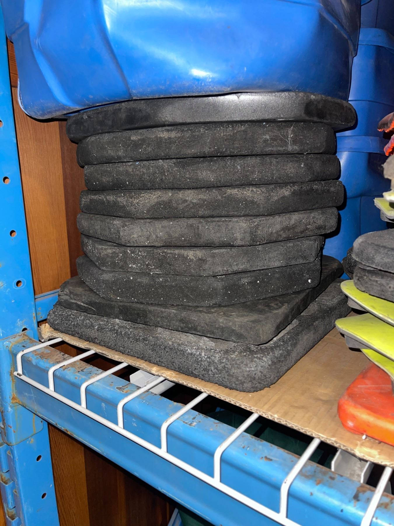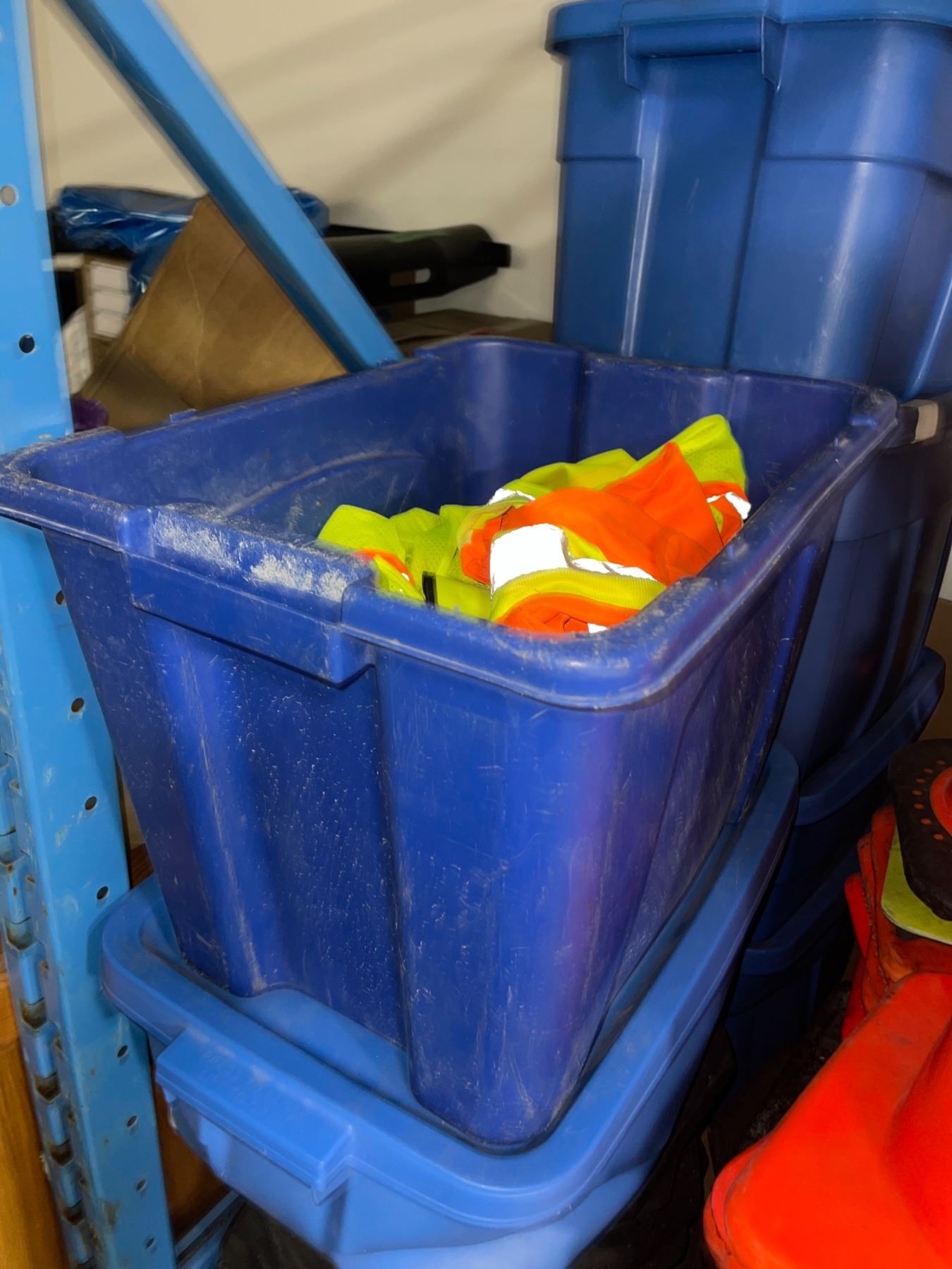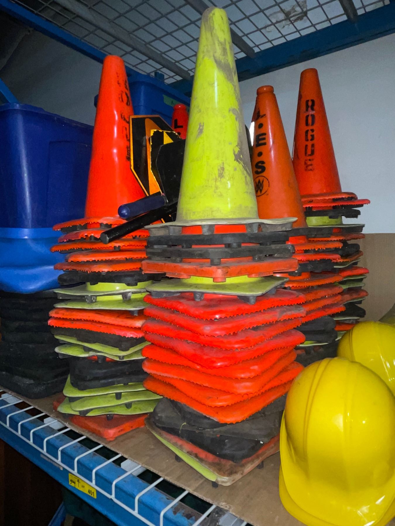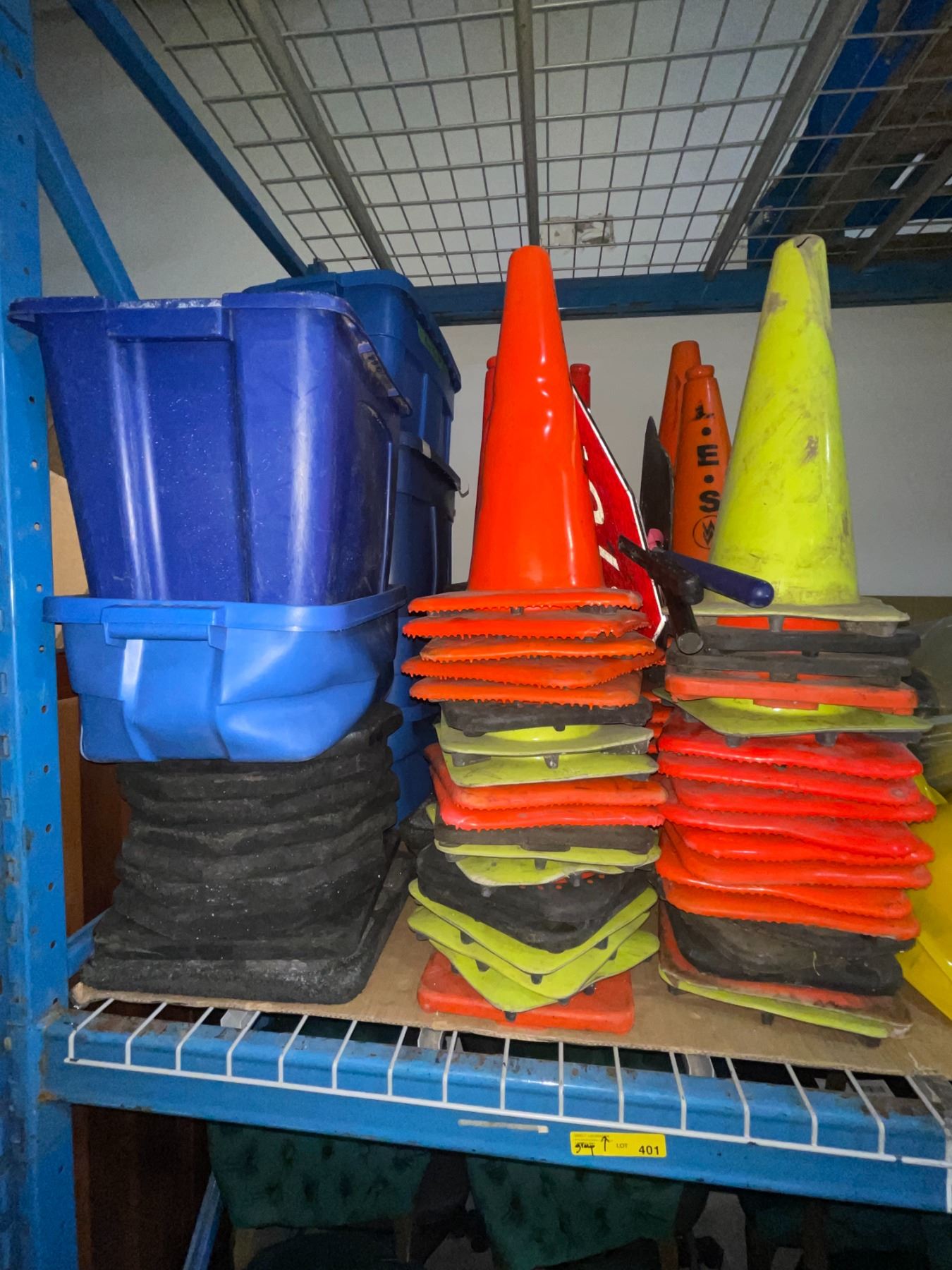 Large Group of Traffic Safety Equipments - Cones, Weights, and Safety Vests