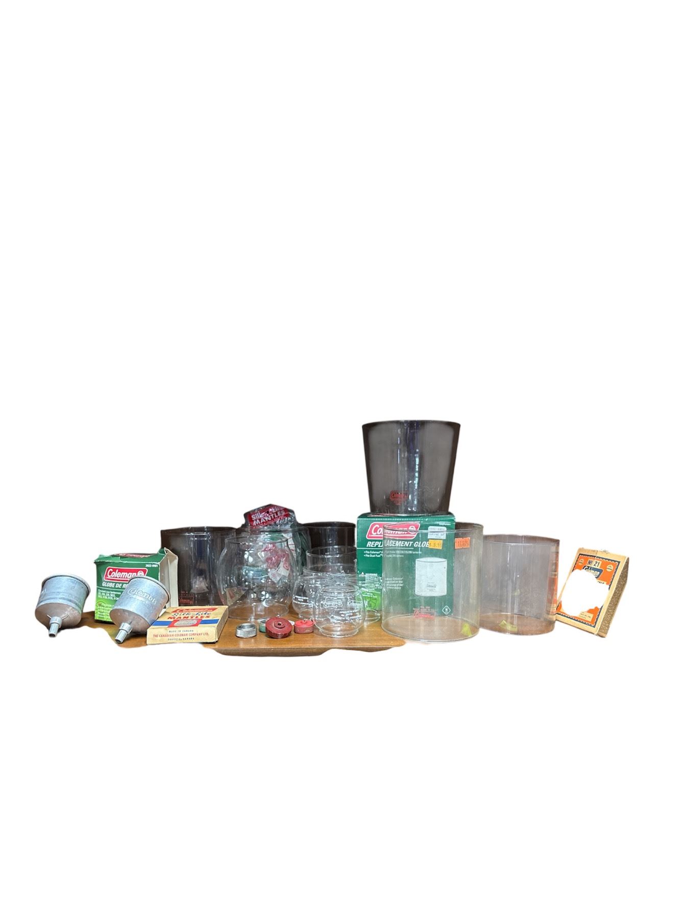 Large collection of Coleman lantern replacement glass globes and various parts. Includes globes designed for Coleman lantern models along with other components. Items are as pictured and appropriate for lantern restoration or repair purposes.
