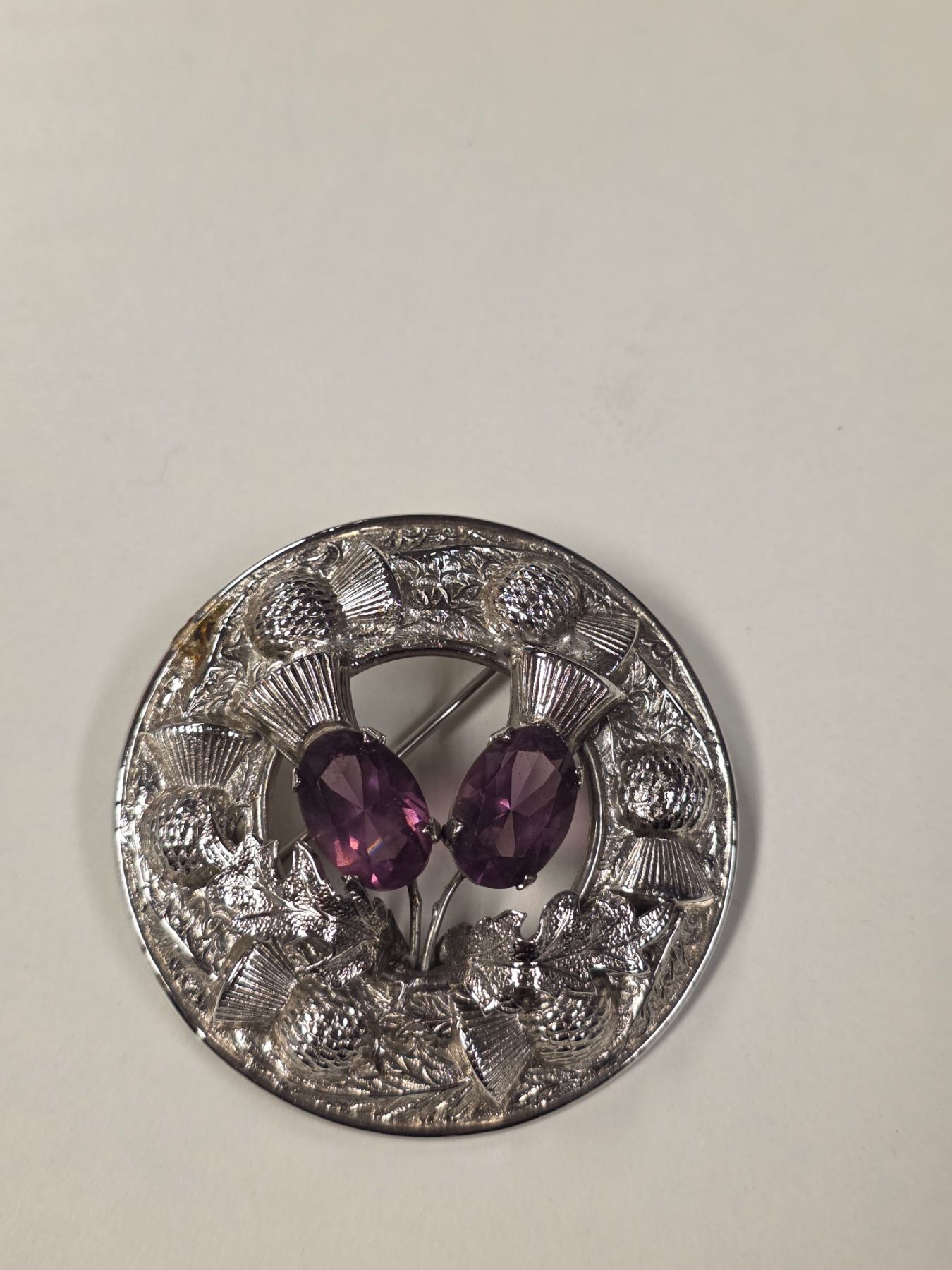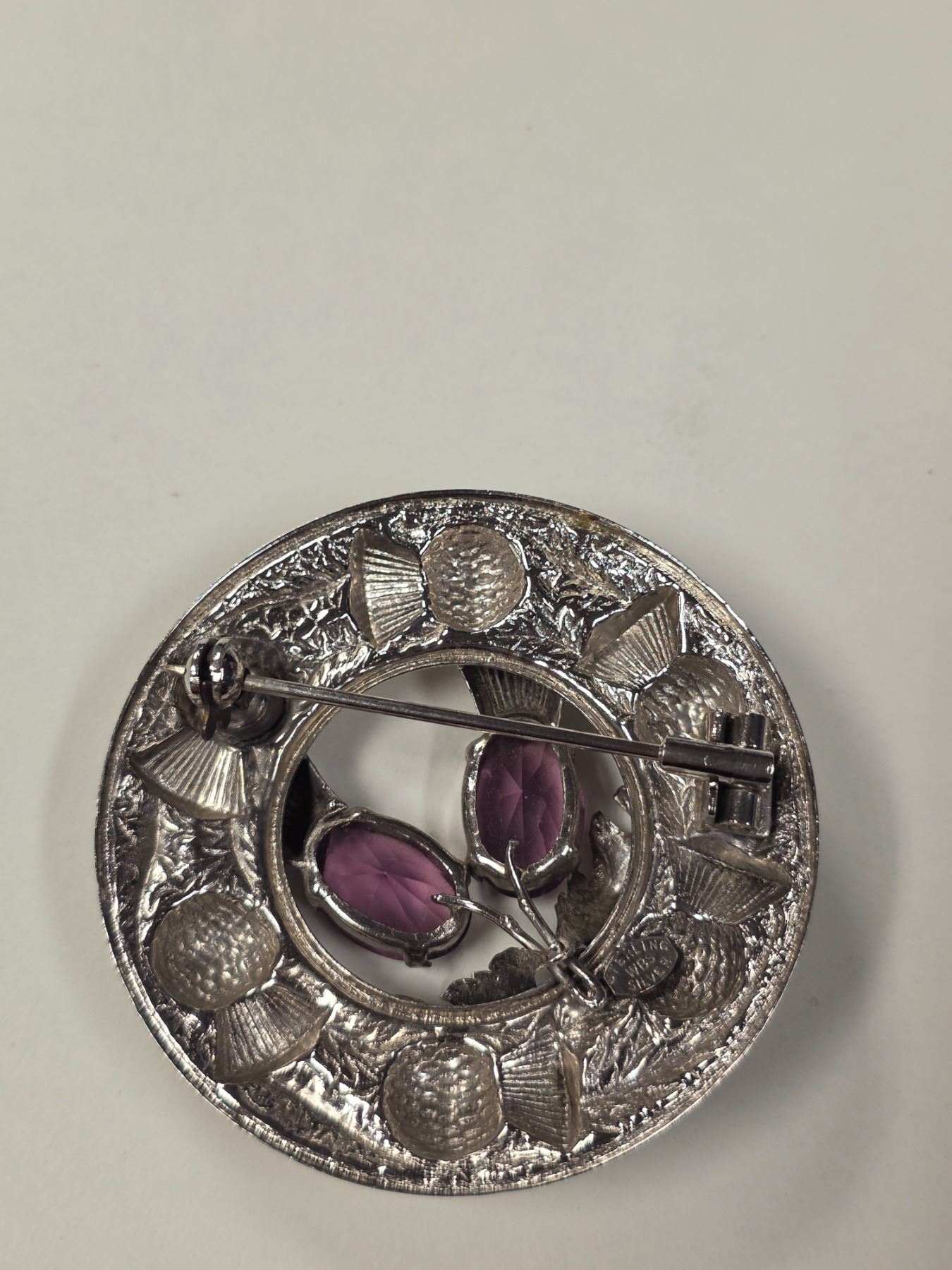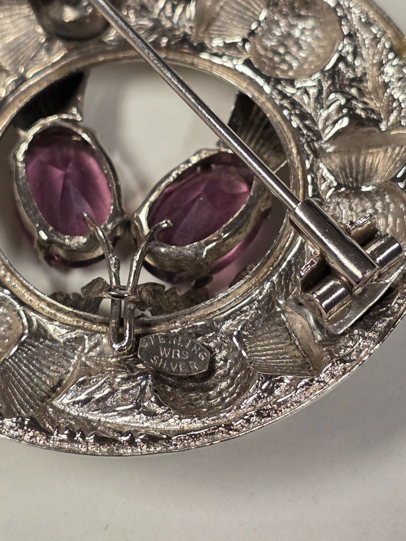 Large Sterling Silver & Amethyst Crystal Scottish Thistle Brooch - 2.5" (60mm) diameter - Weight including amethysts: 28 grams