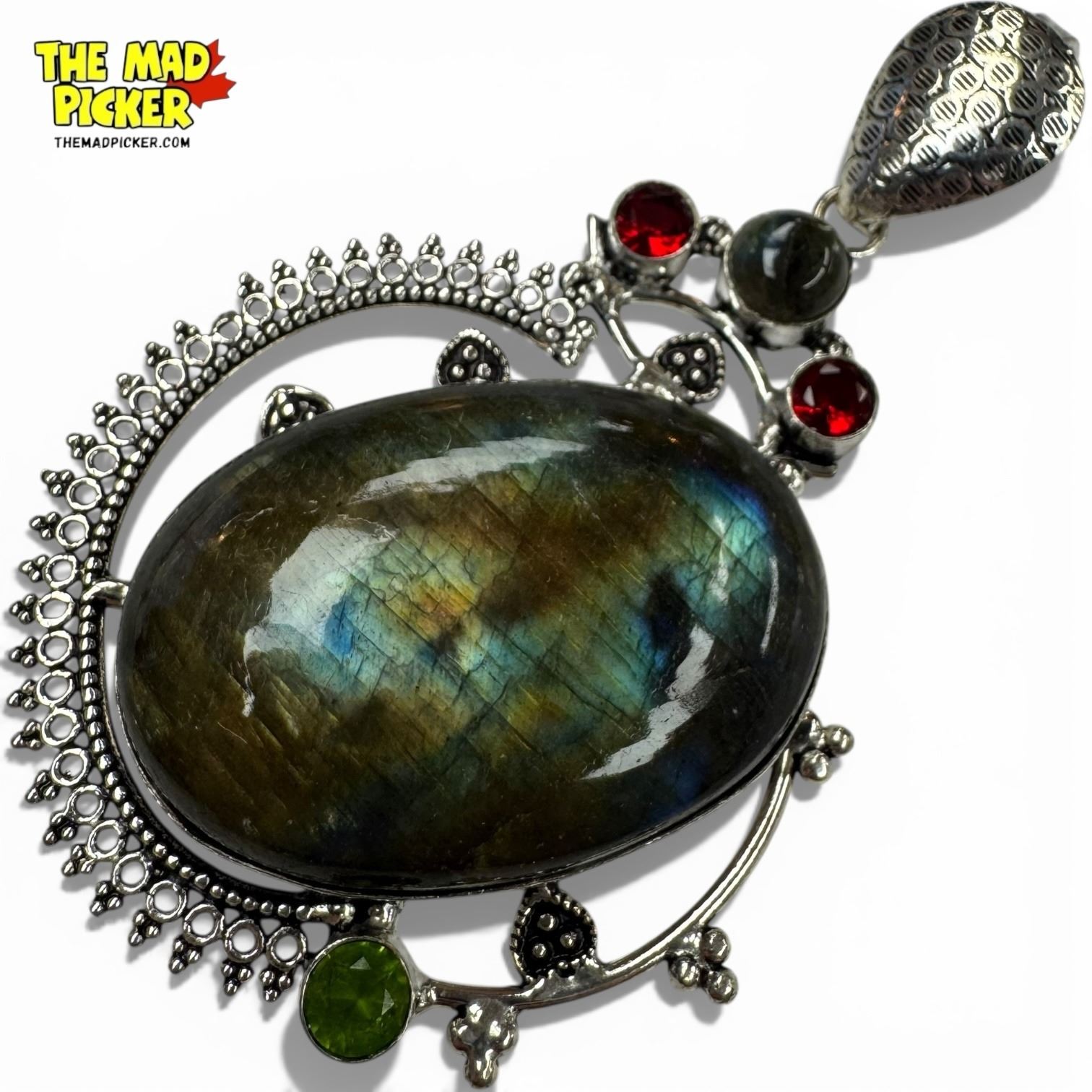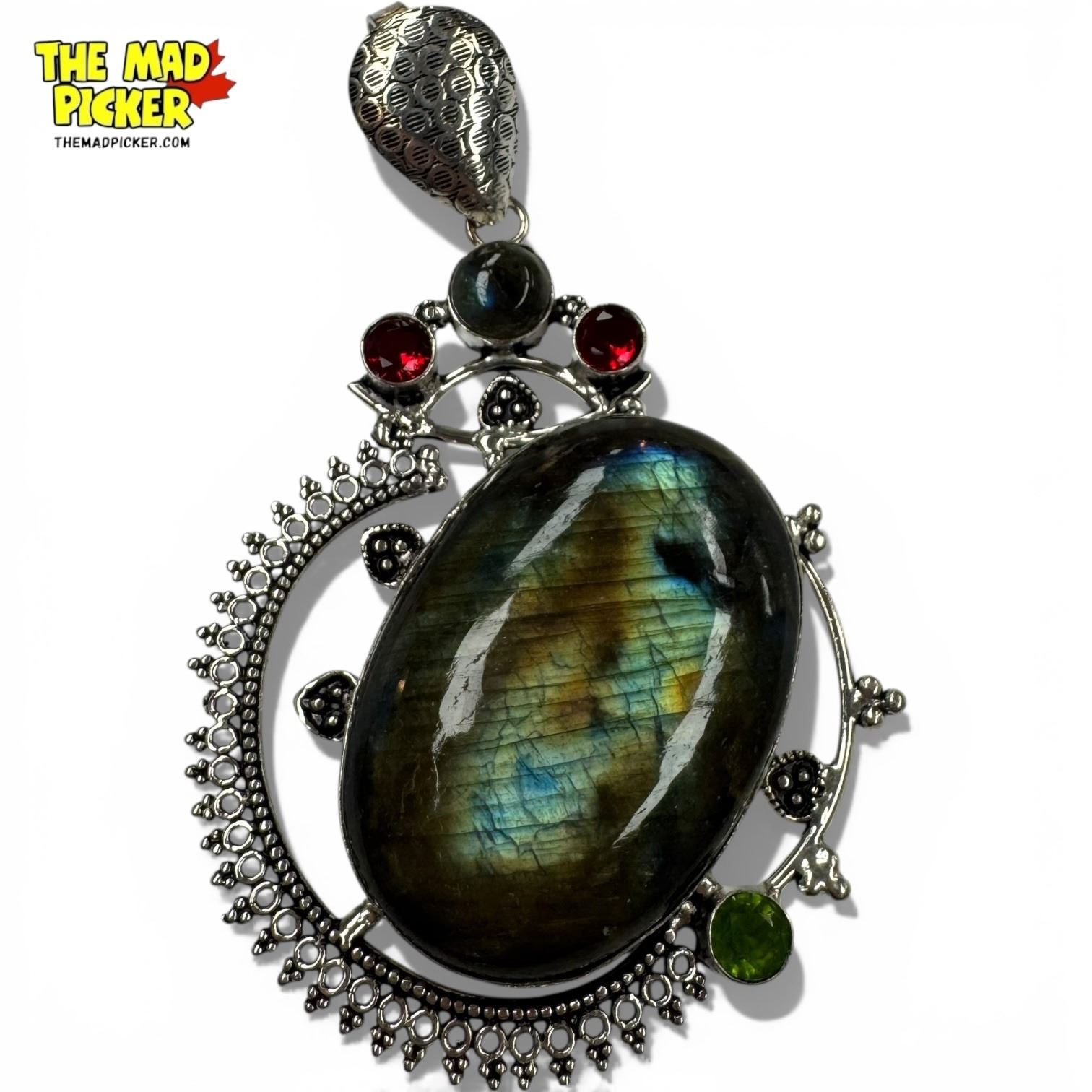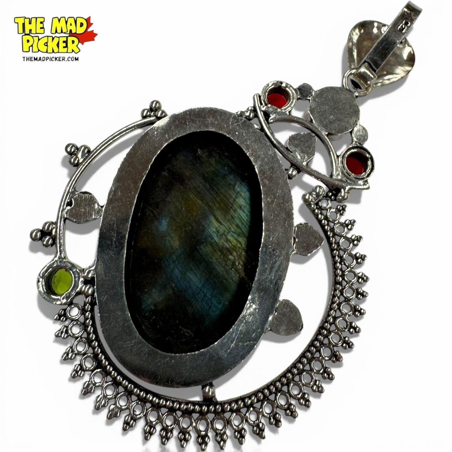 Large Sterling Silver Labradorite & Gemstone Pendant - 2.5" x 3" - Weight: 44.7 grams