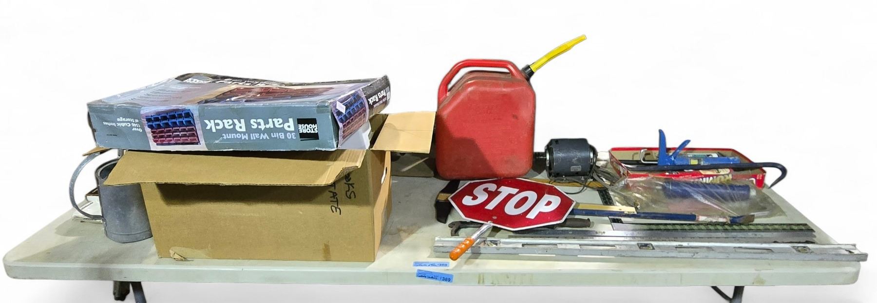 Large Table Top of Misc - Gas Gan, Stop Sign, Measuring Tools, Motor, Parts Rack, Etc.