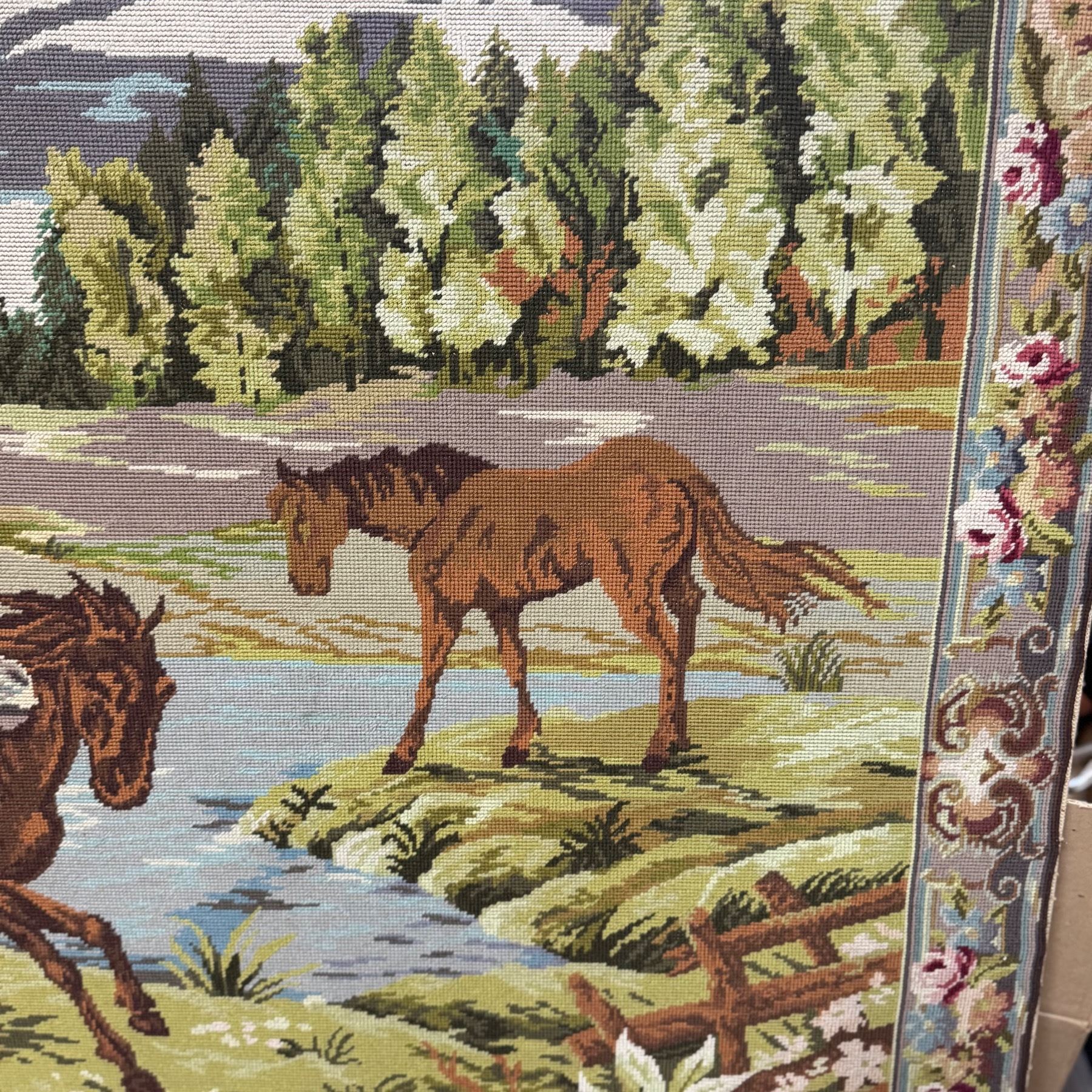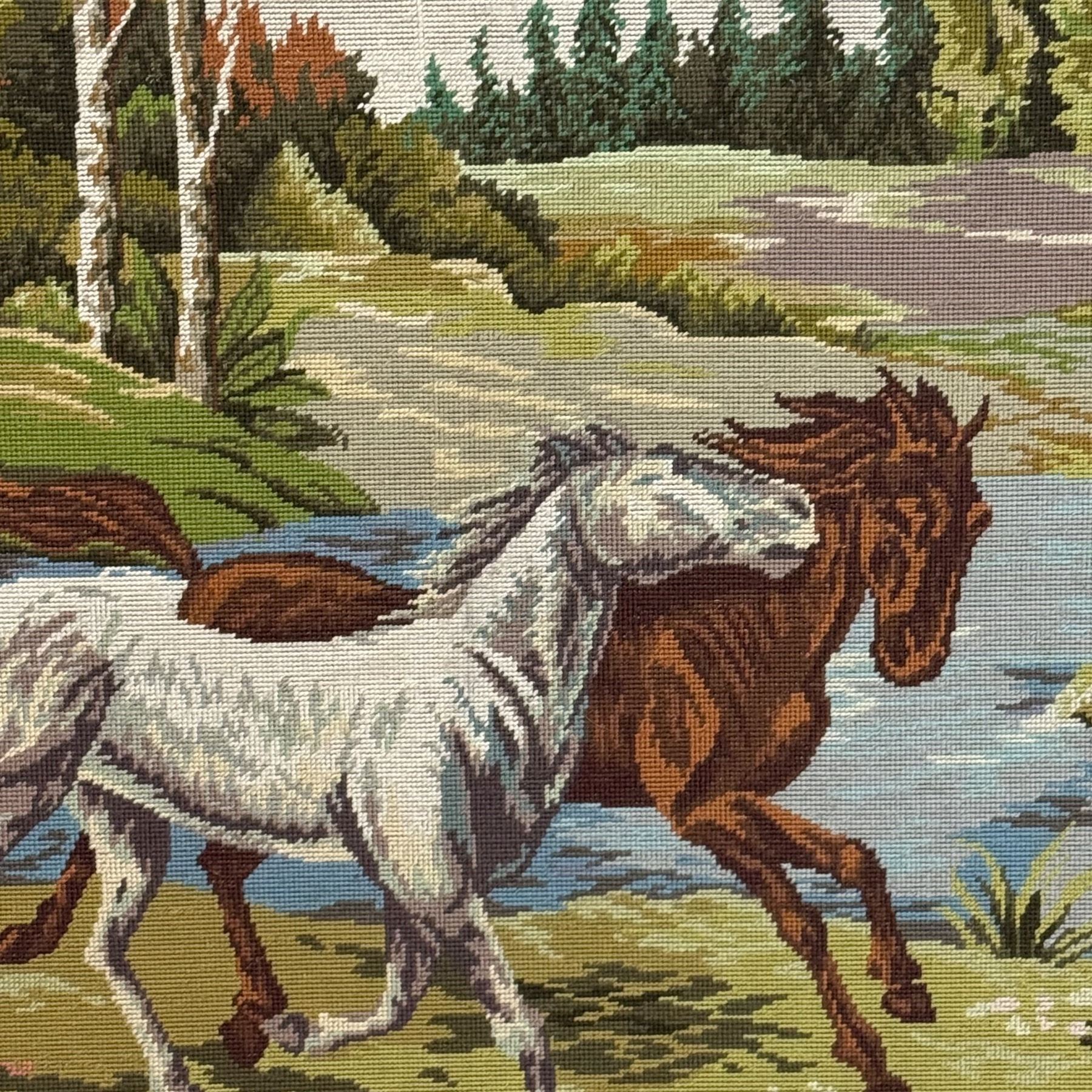 Large Tapestry Landscape with Horses on Wood Frame (67" x 46")