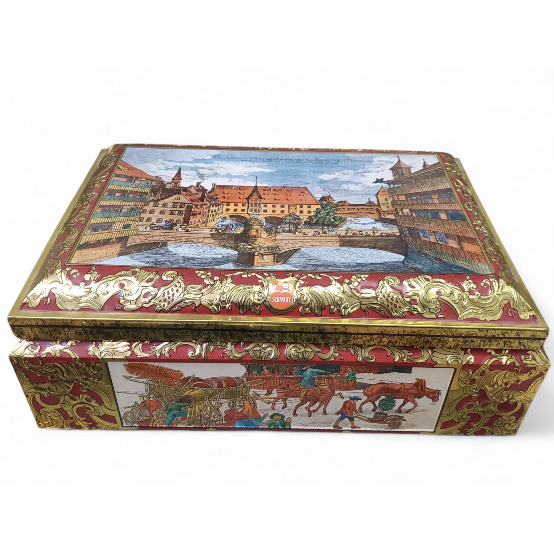 Large Vintage 1988 E. Otto Schmidt Tin Box (Nuremberg Scene), 8500 Nuremberg - 11" x 16" - Made in W. Germany