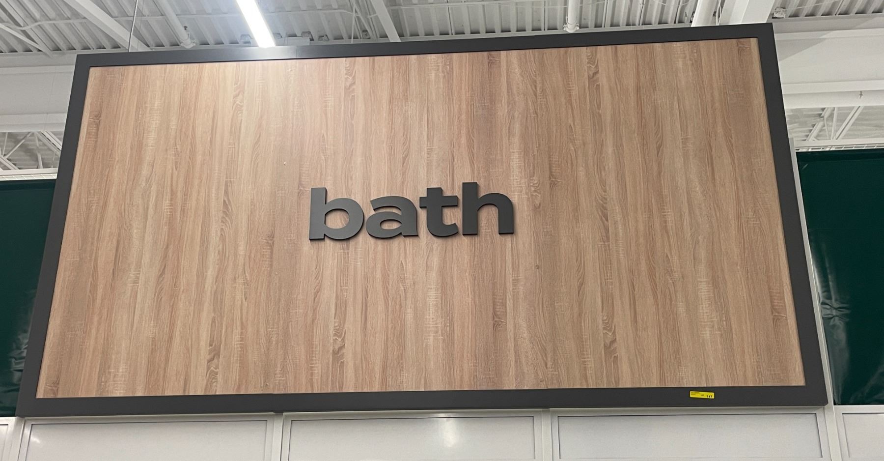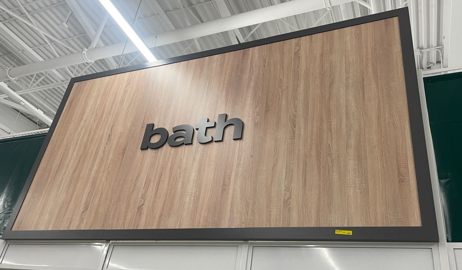 Large bath store sign (approx. 13ft W 76in H 2in D) BIDDERS ARE RESPONSIBLE FOR ALL COSTS ASSOCIATED WITH PICKUP OF THEIR LOTS INCLUDING BUT NOT LIMITED TO RENTAL OF EQUIPMENT, FORKLIFTS, LABOUR, TRUCKING, TOOLS ETC.