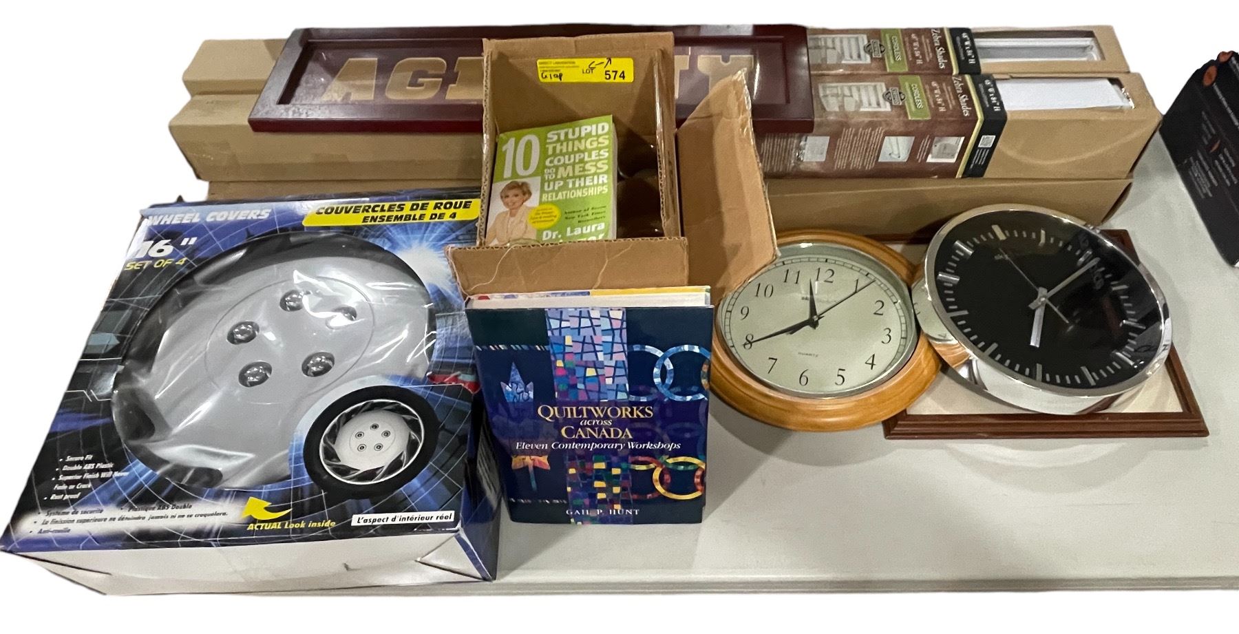 Large group of assorted items - includes Set of 4 16in wheel covers / wall clocks / zebra shades etc