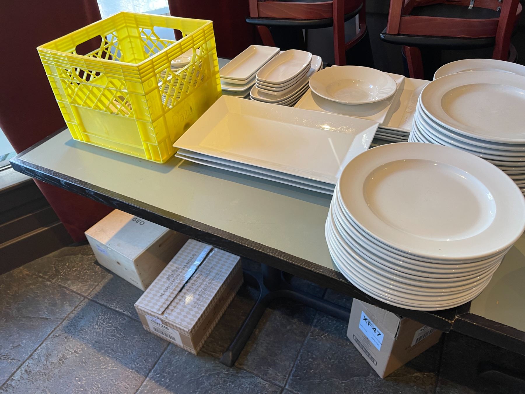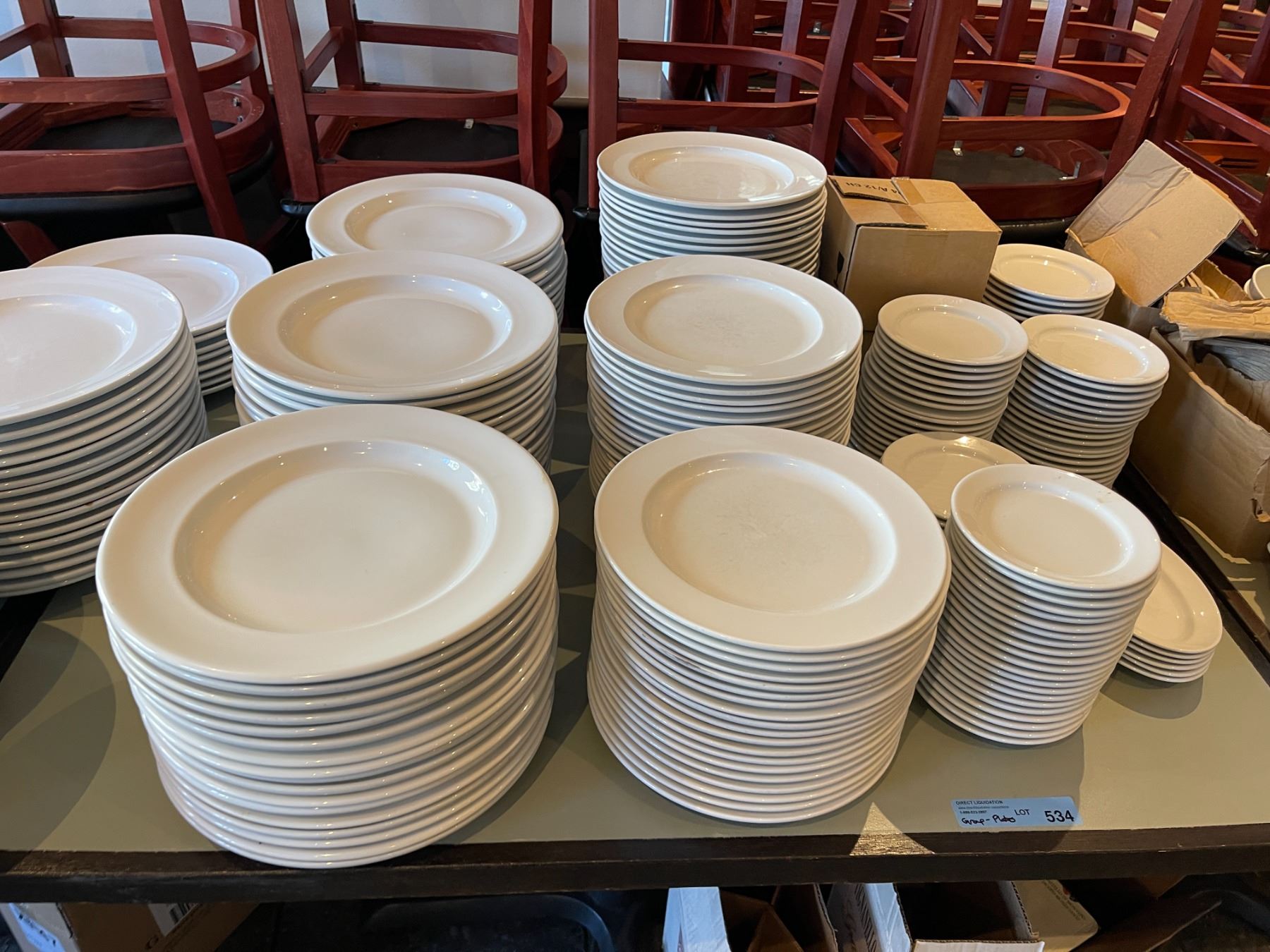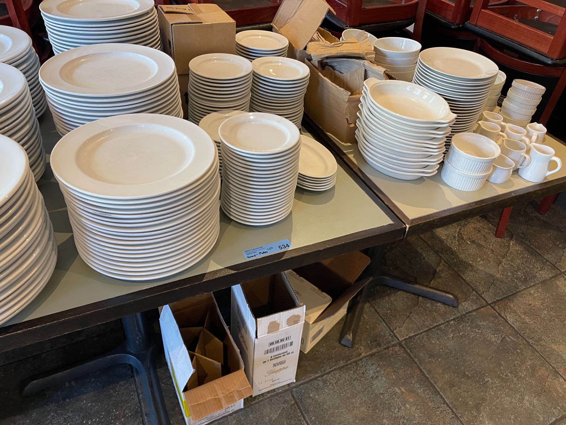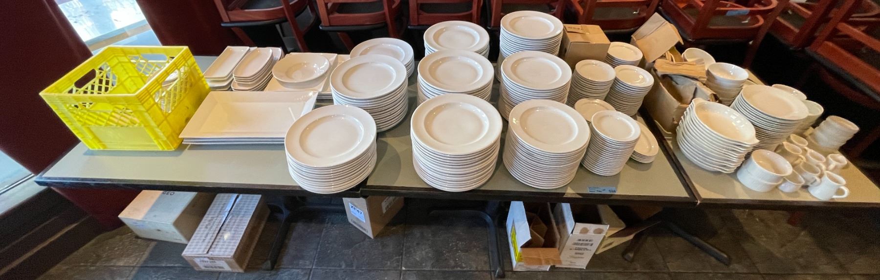 Large group of dinnerware, plates, ramekins, serving dishes, etc.