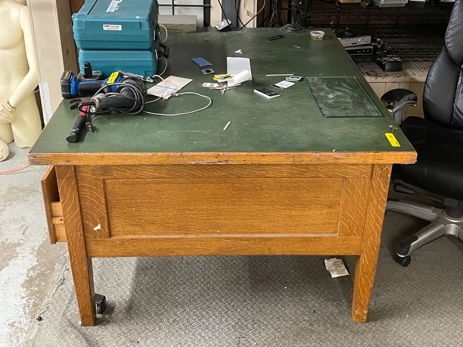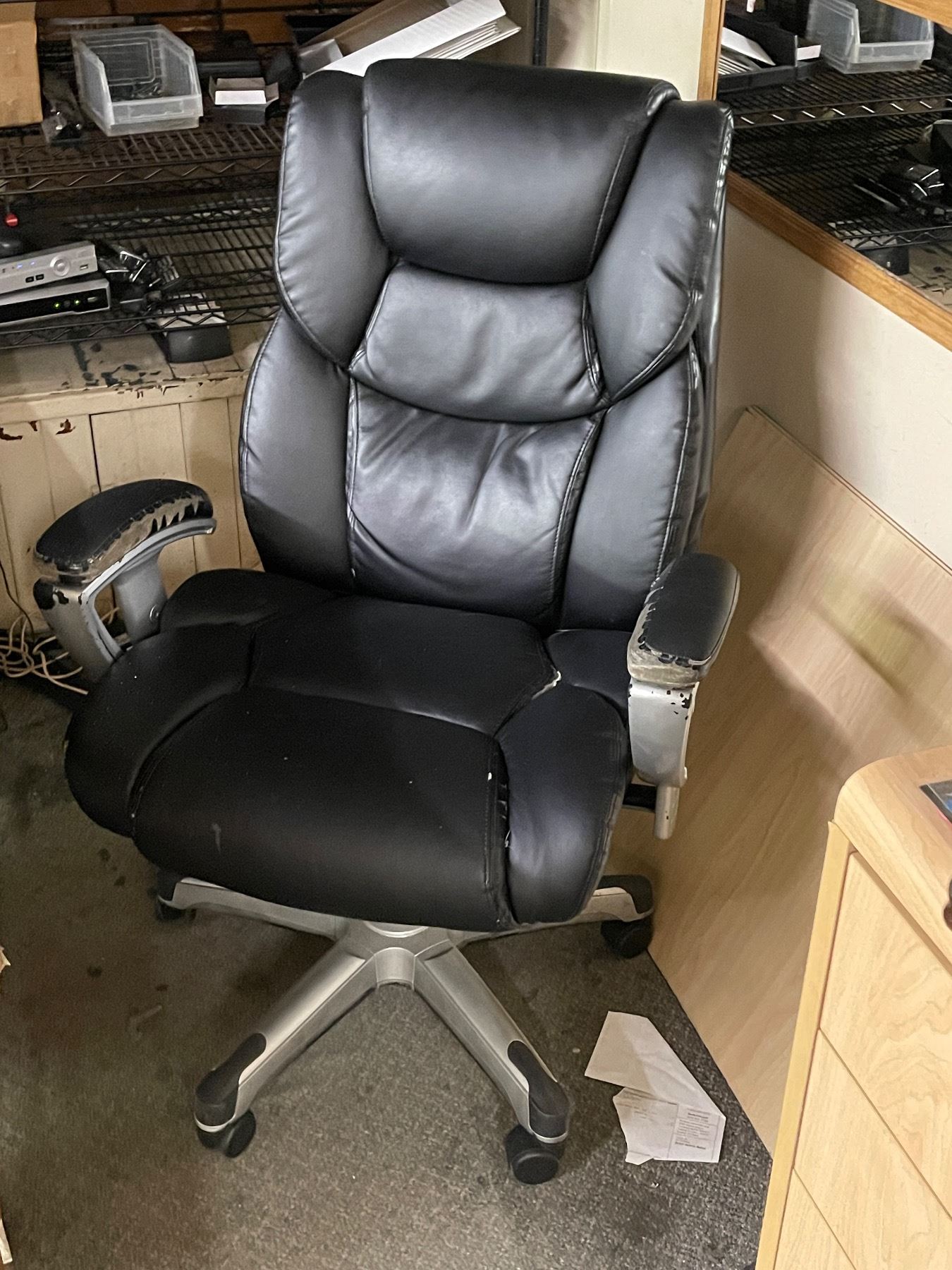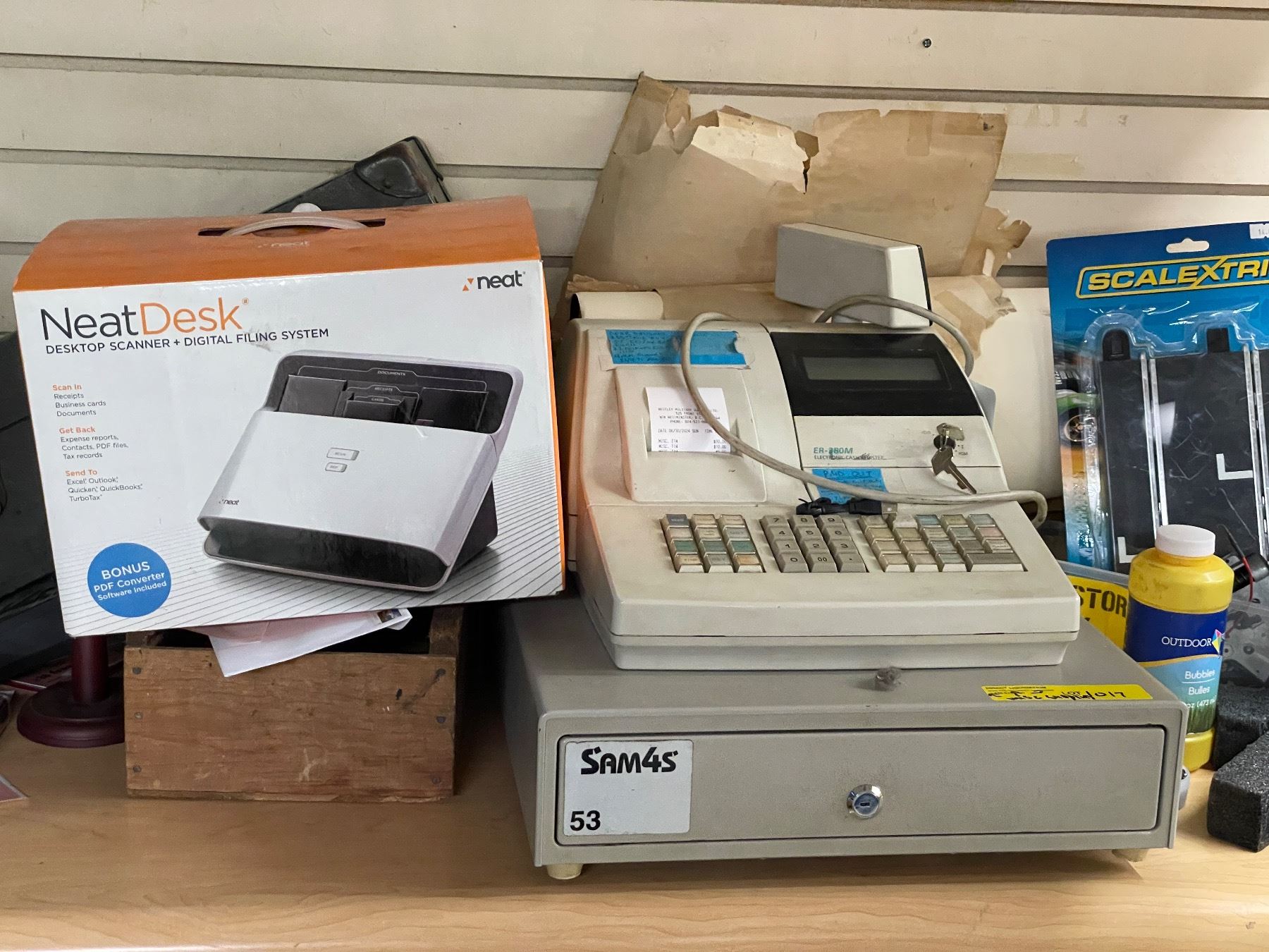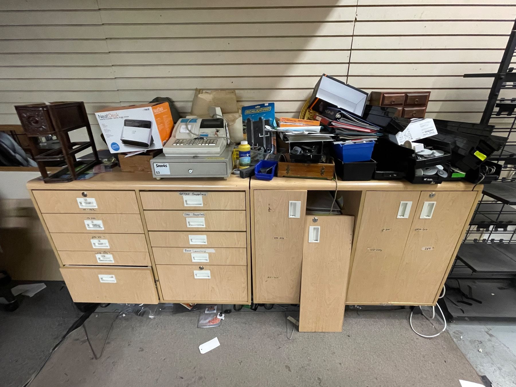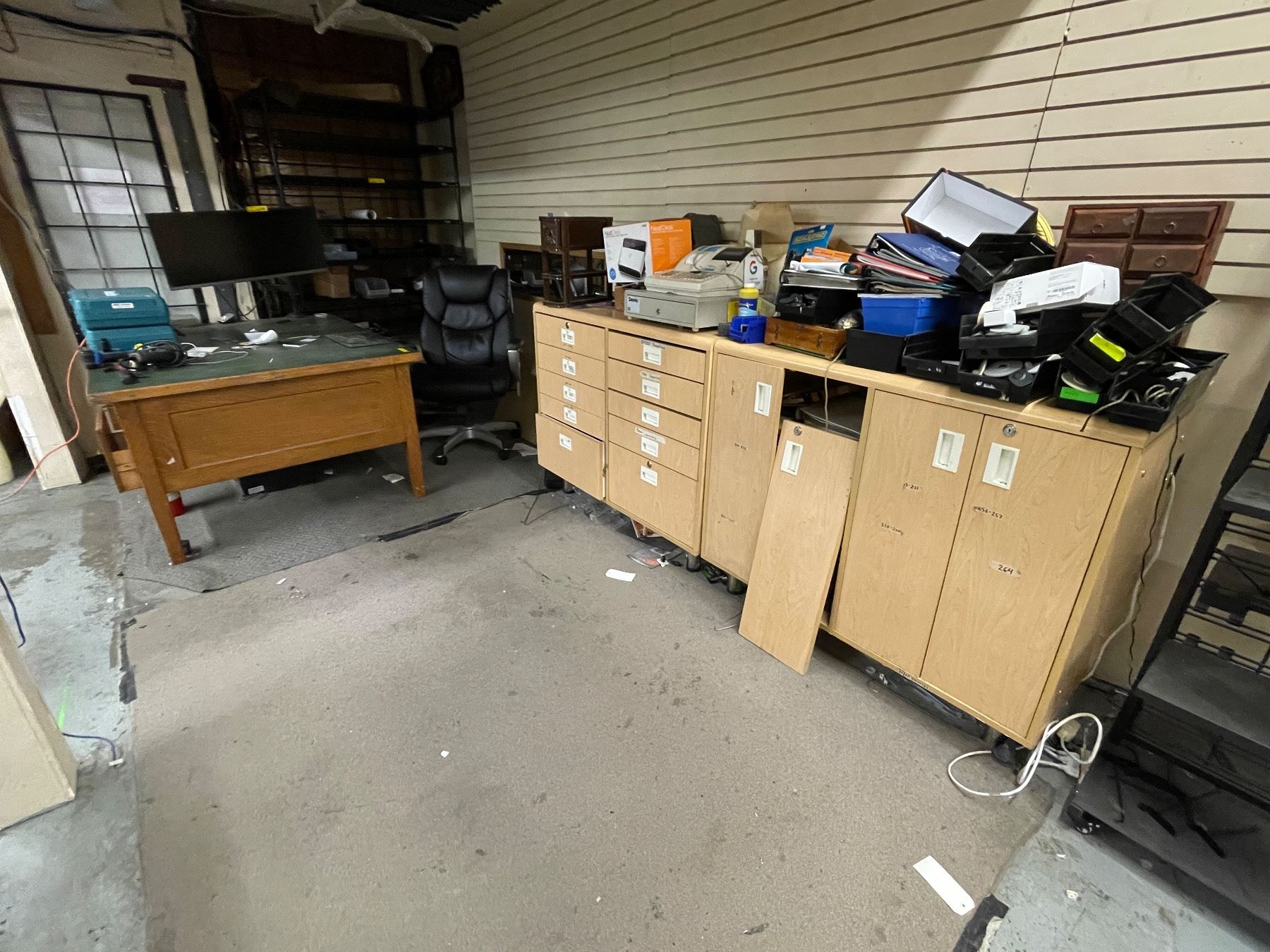Large group of misc - includes 2 office supplies cabinet (approx 47in x 25in x 40in H) office chair / desk (approx 60in x 48in x 30in H) / Neatdesk desktop scanner etc (TOOLS NOT INCLUDED IN LOT)