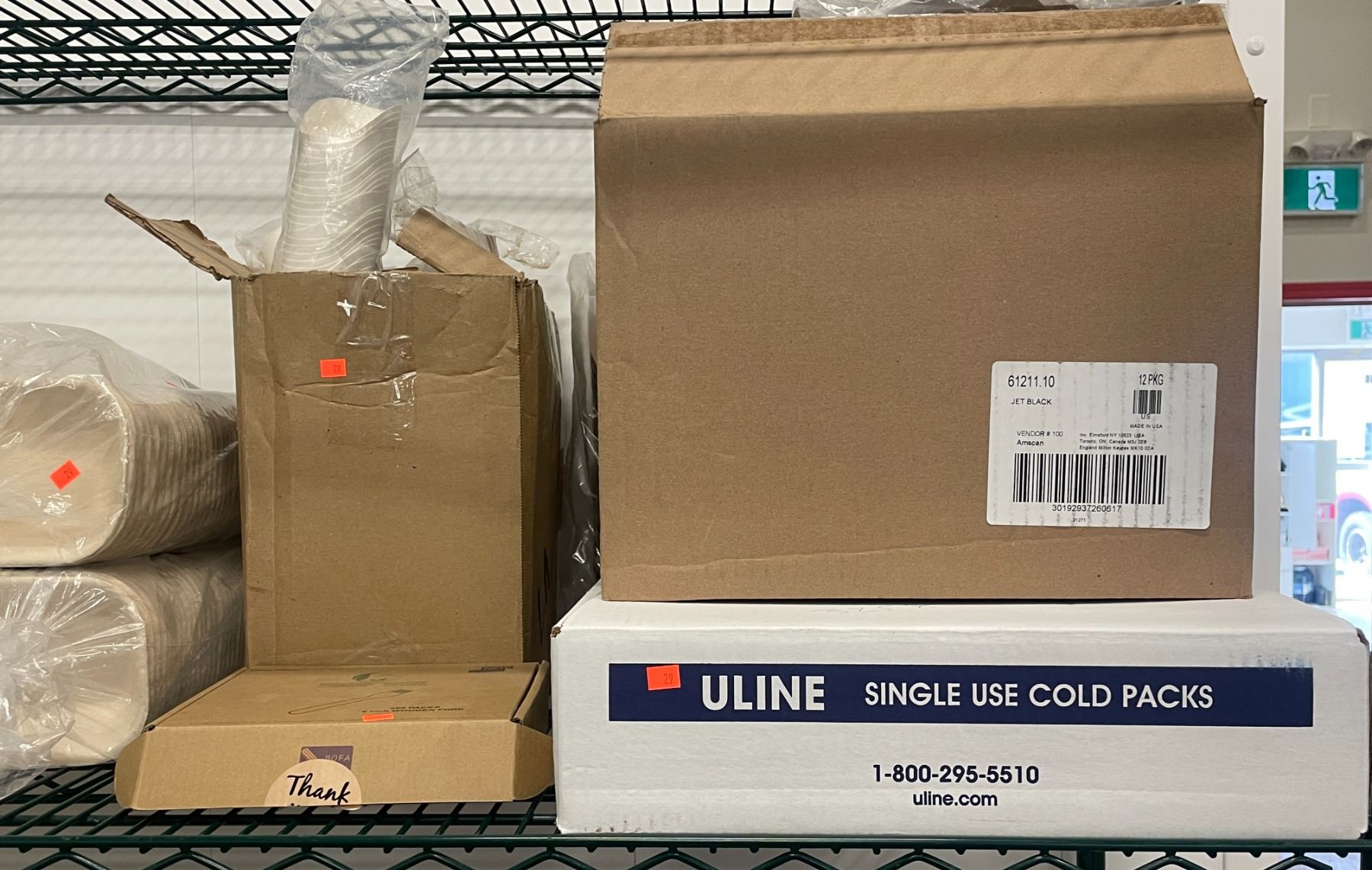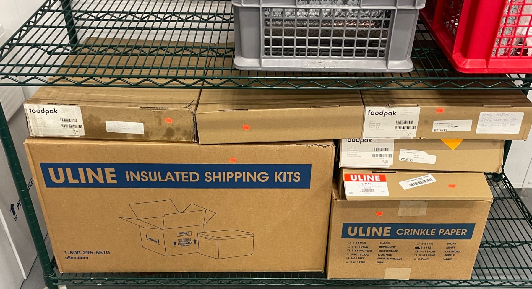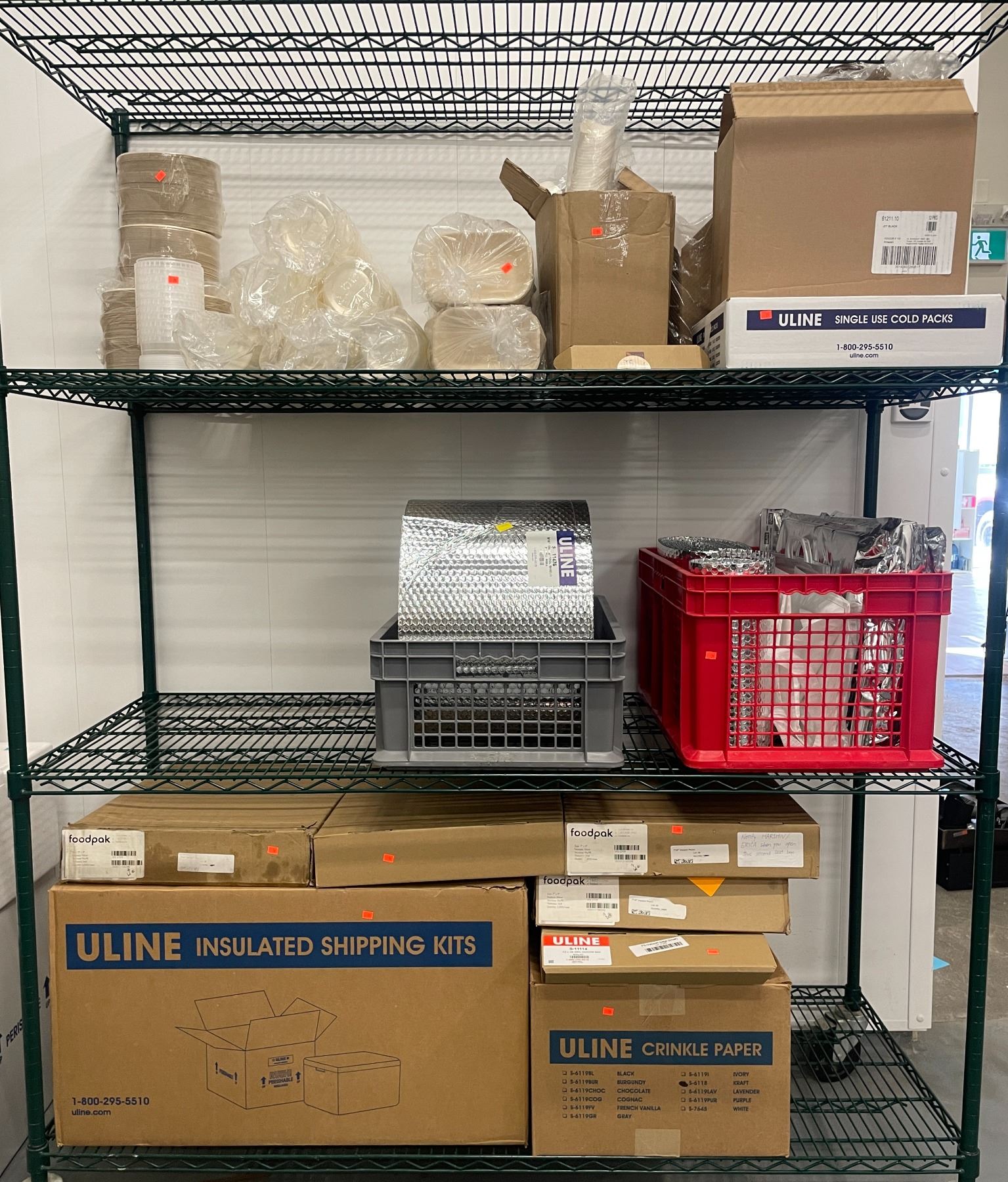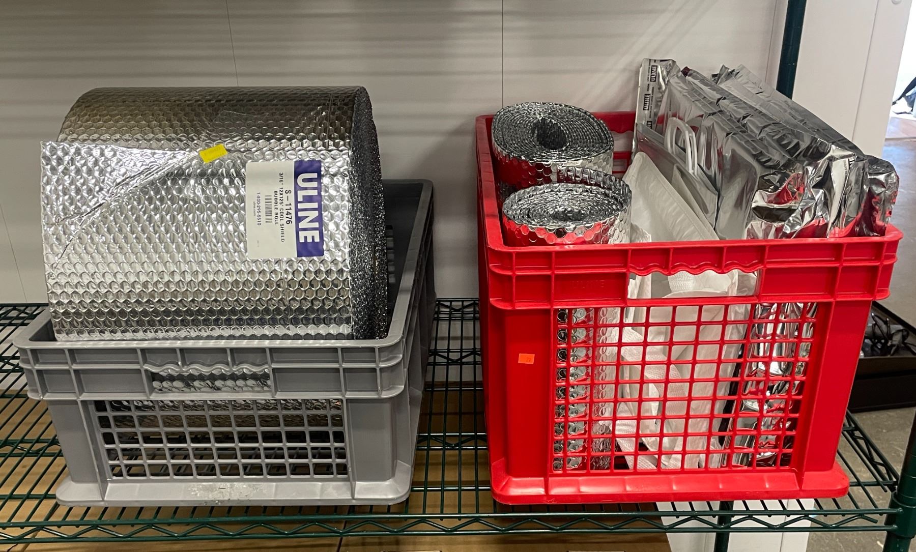 Large group of supplies - includes Uline Cool shield bubble roll/single use cold packs/Uline insulated shipping kits etc.