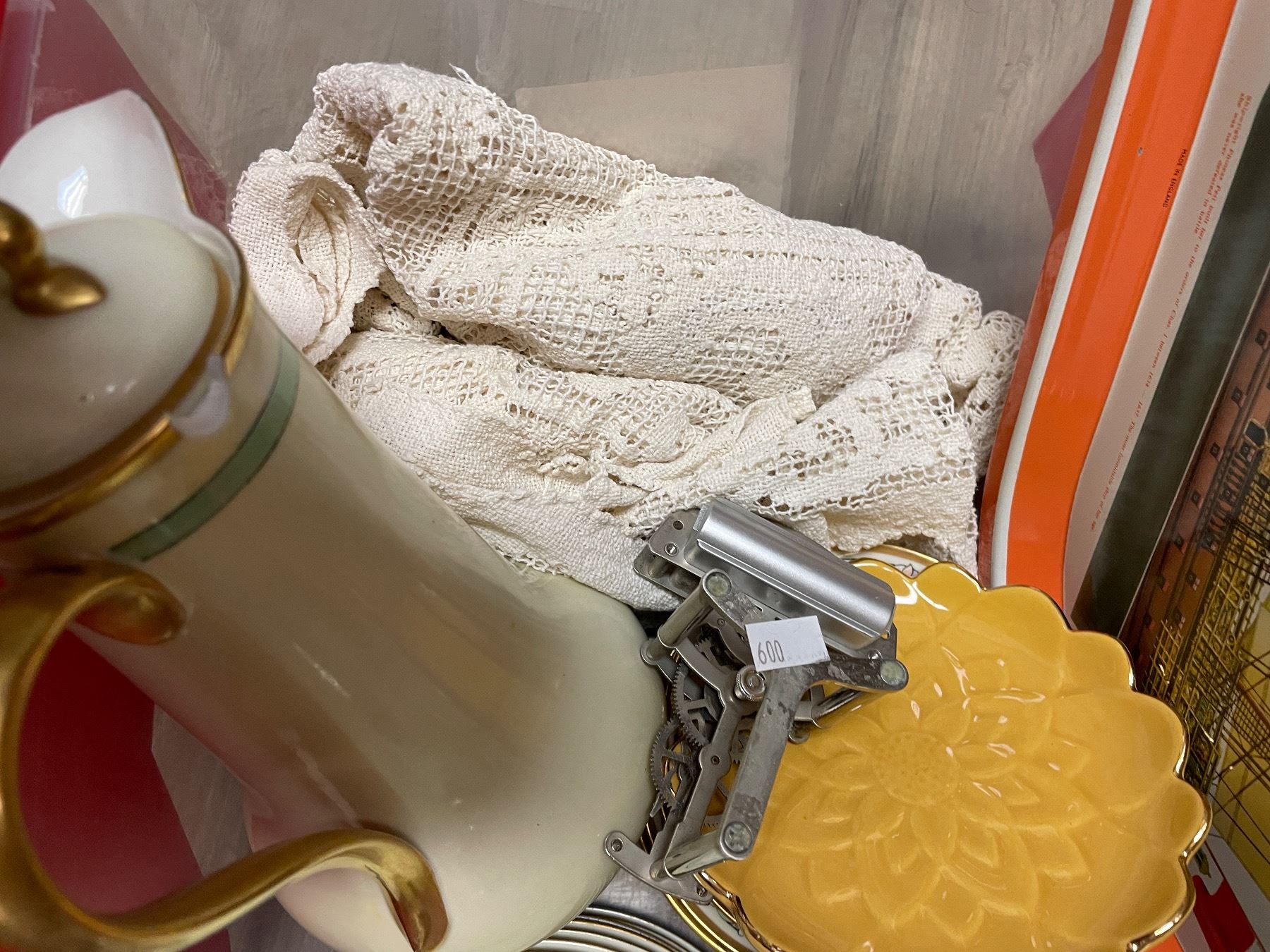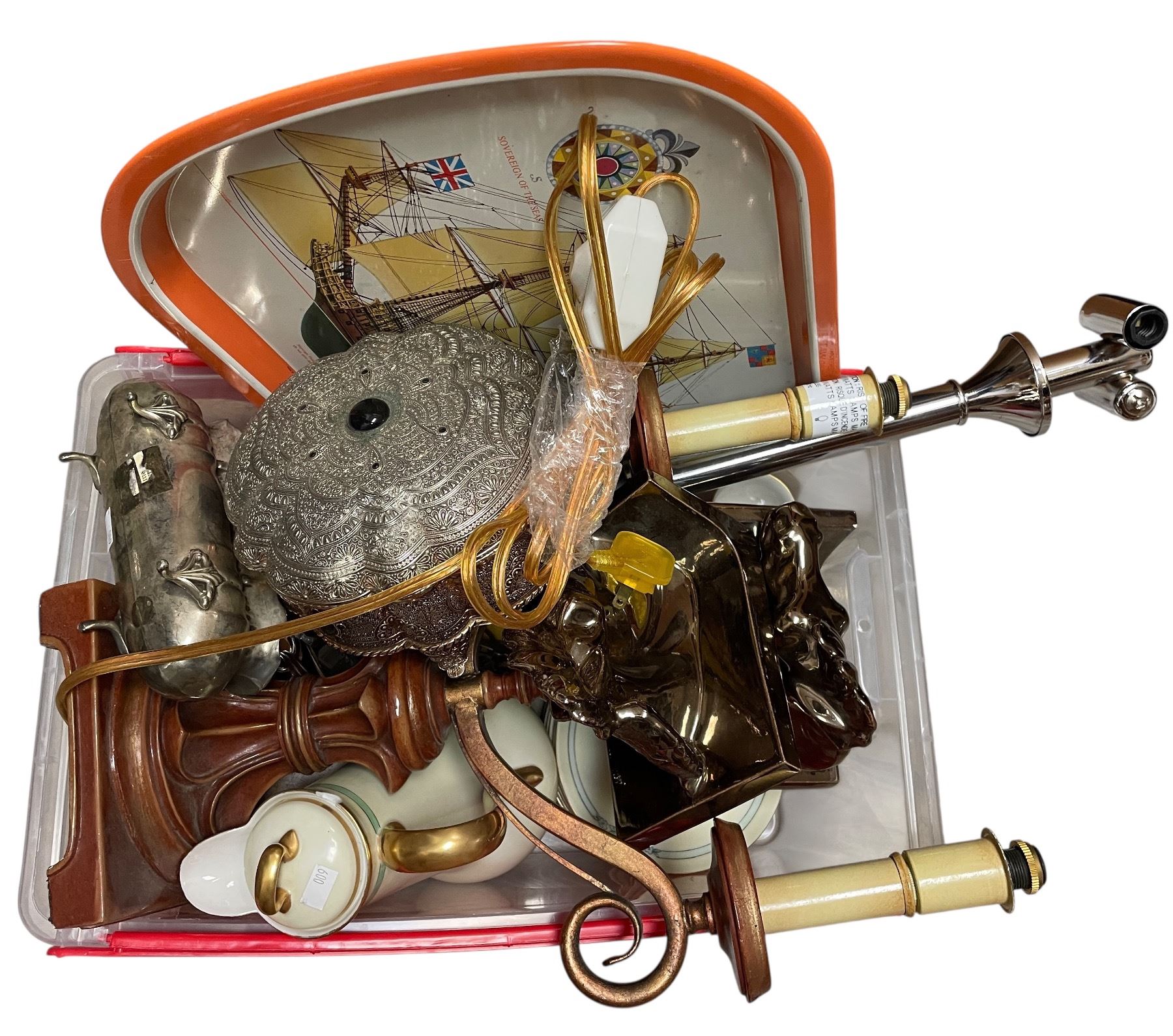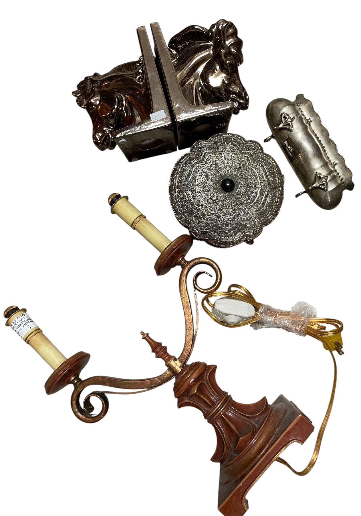 Large lot of vintage items including silver plated serving dish, lamp, electric candelabra, etc.