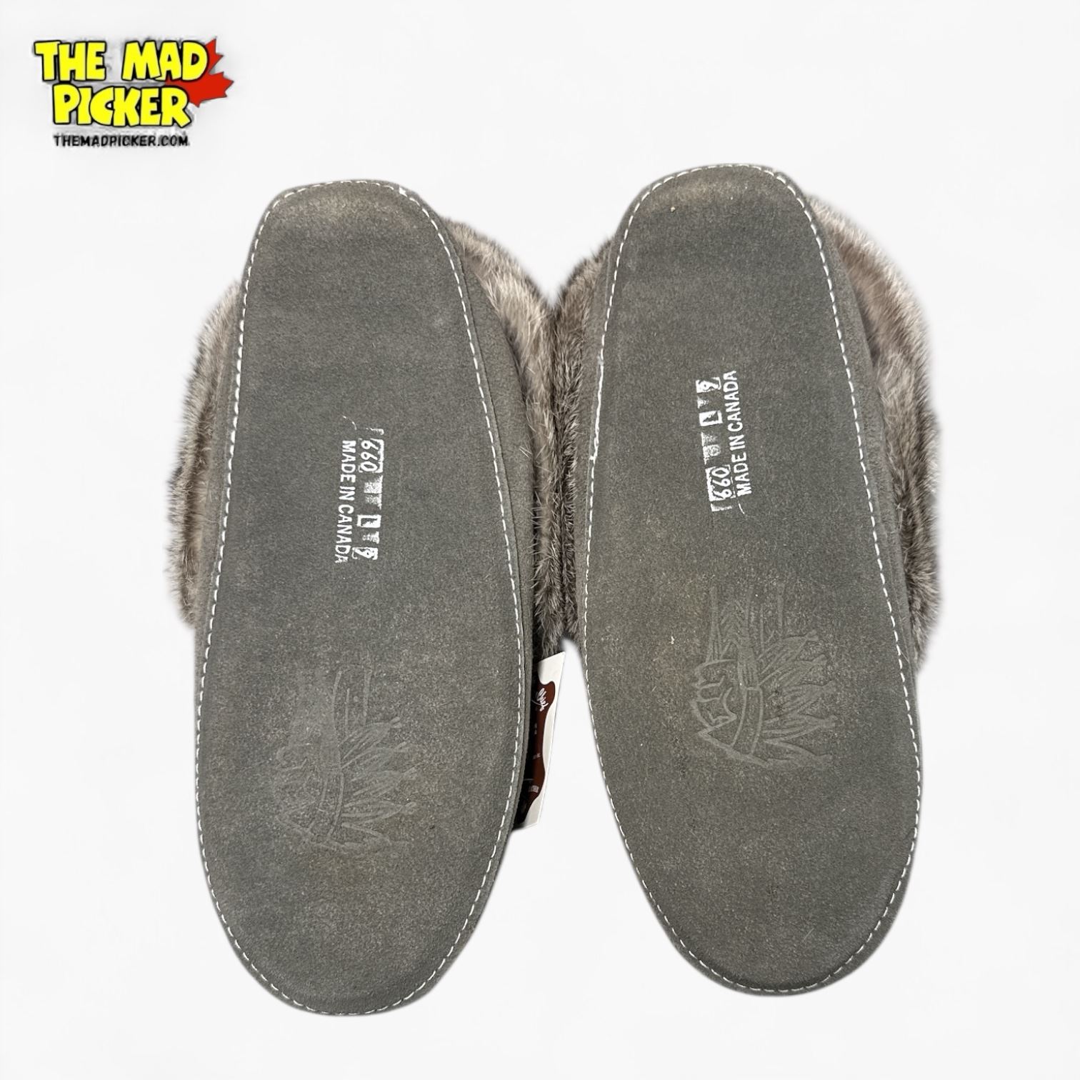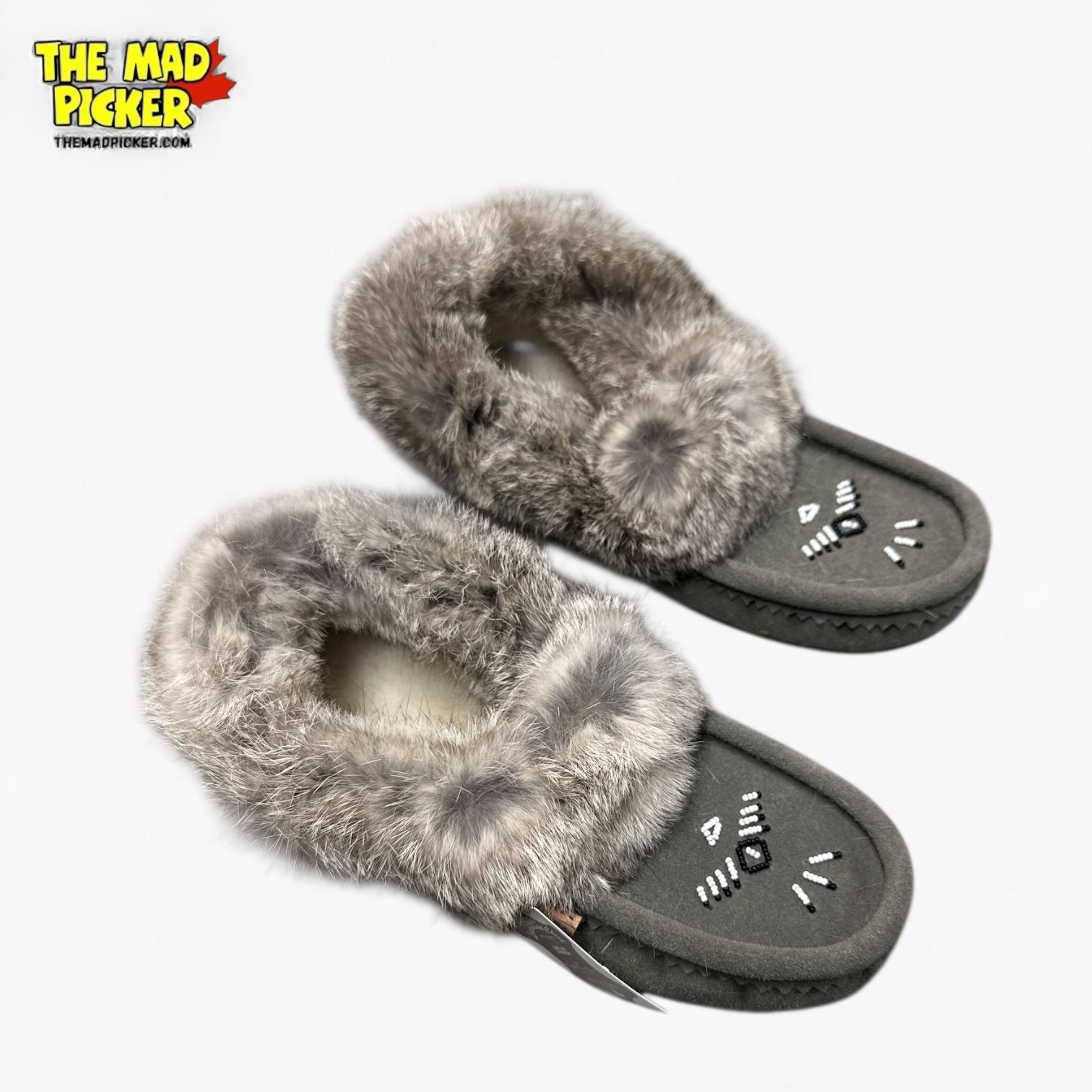 Pair of Laurentian Chief women's soft-sole moccasin slippers, size 9. Made of charcoal suede with rabbit fur trim and lined for comfort. New in original box. Features traditional handcrafted design. Produced in Canada, known for high-quality Indigenous-inspired footwear.