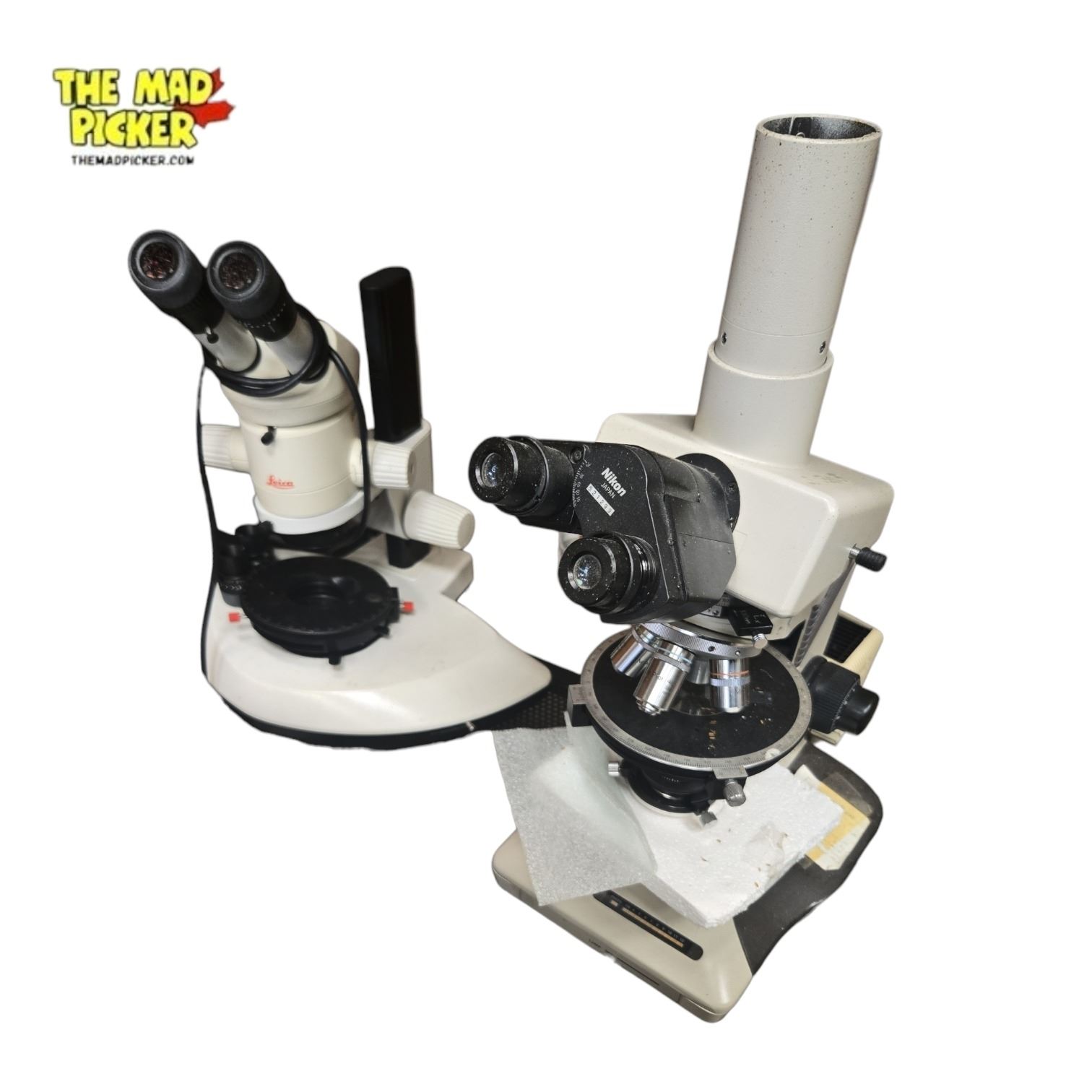 Pair of scientific microscopes sold as is and untested. Includes Leica MZ6 stereo microscope, suitable for low magnification observation, and Nikon Optiphot 2-Pol polarizing microscope, designed for advanced mineral or material analysis. Both models are professional-grade for specialized use.
