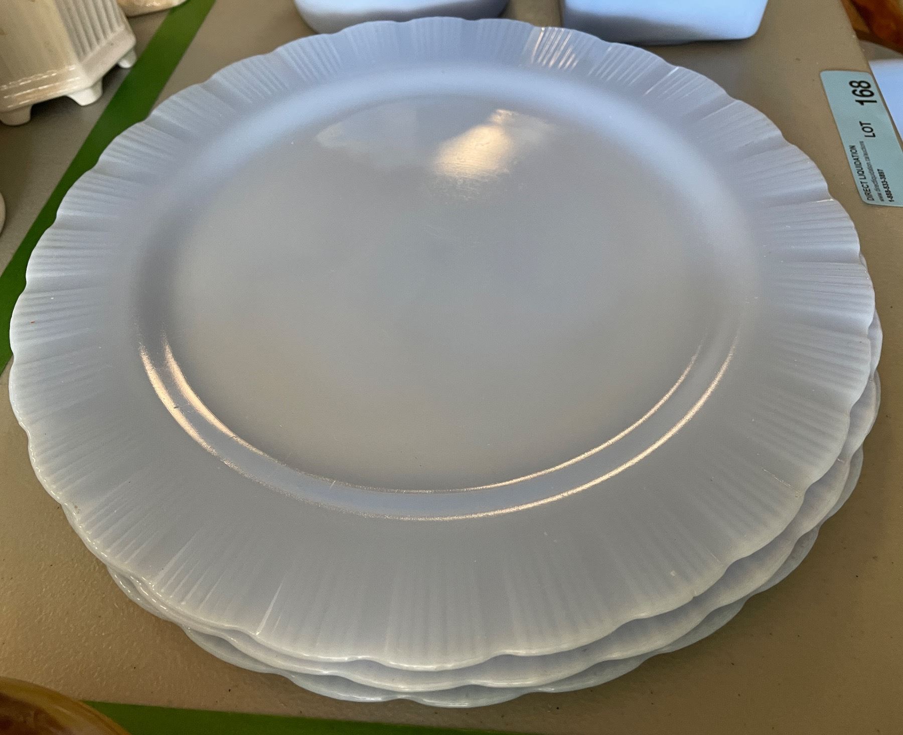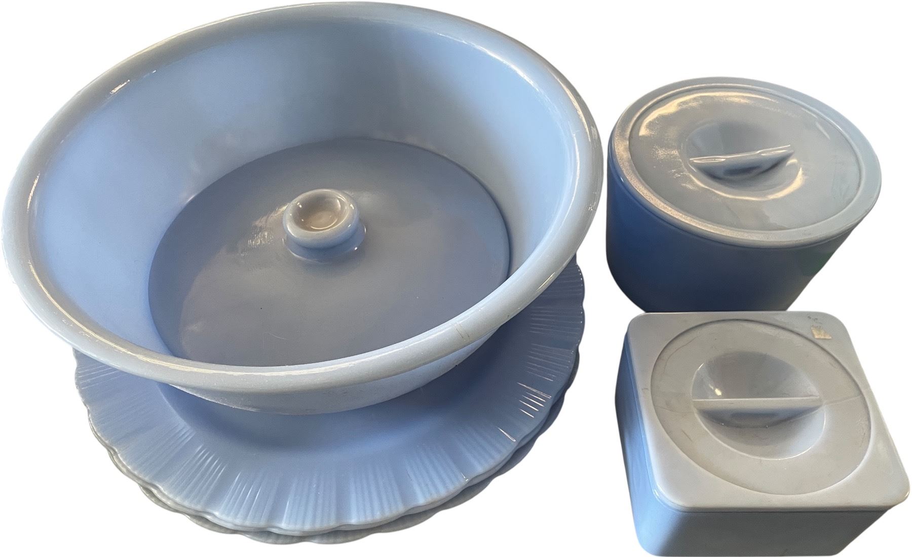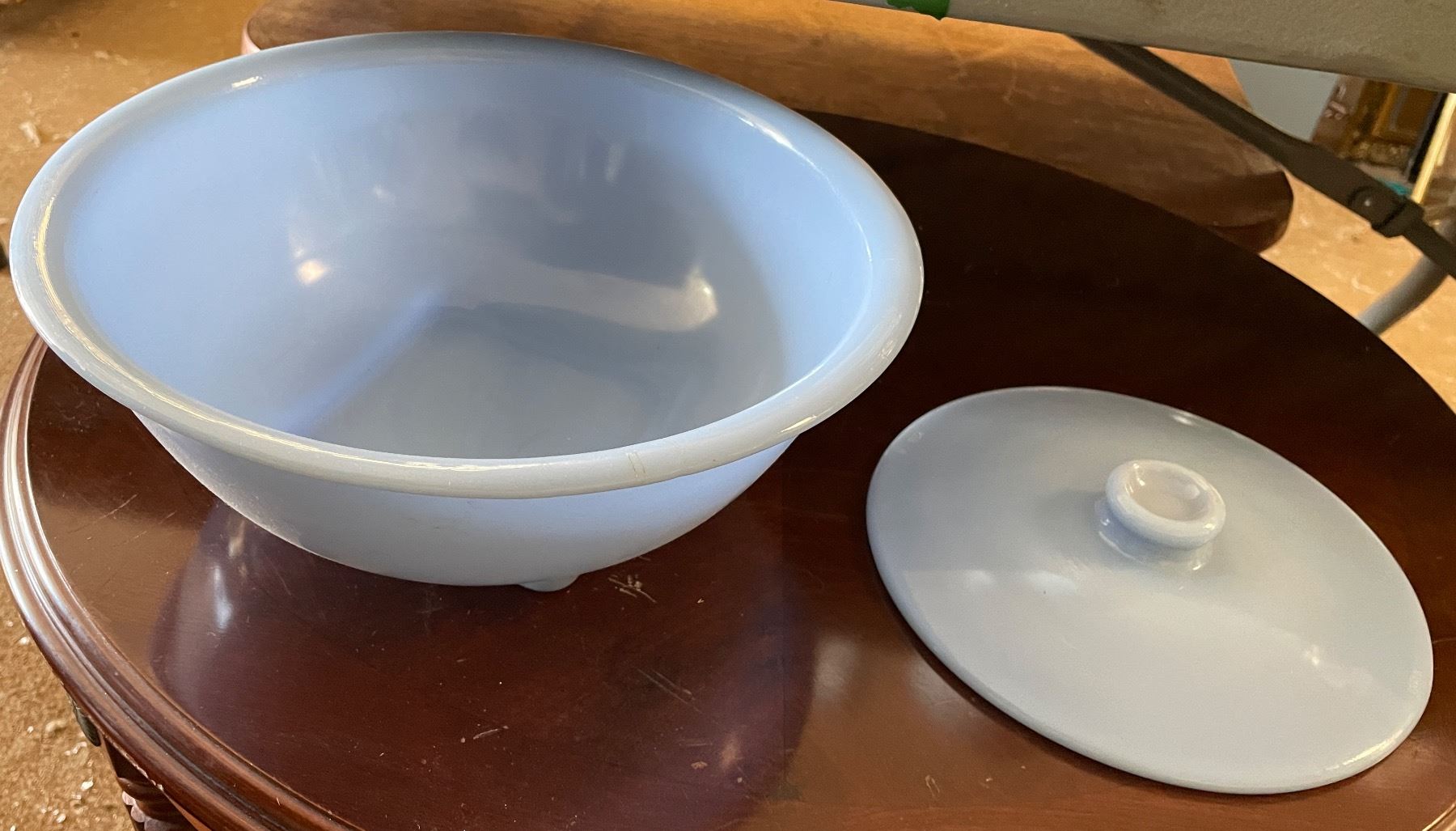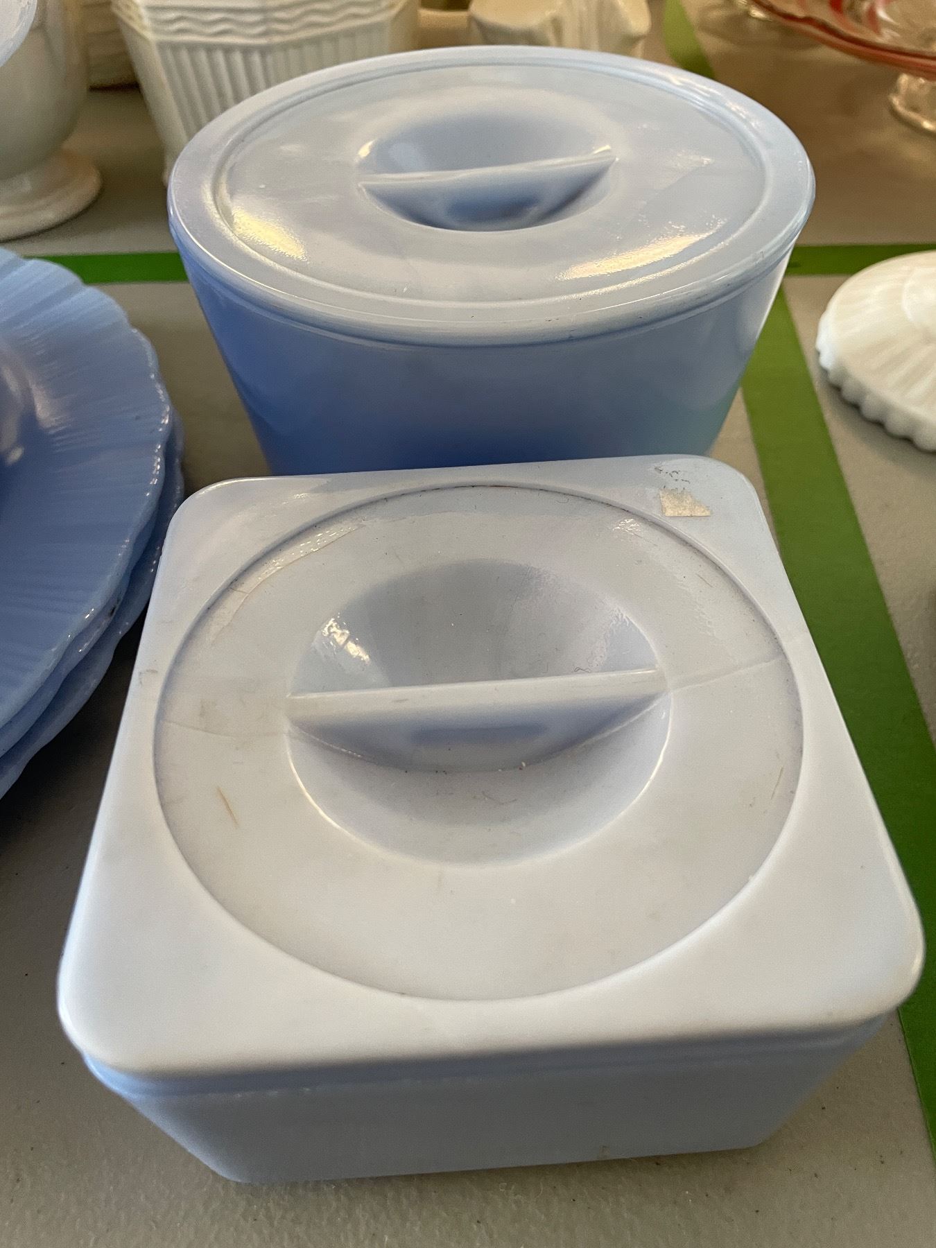 Light Blue Milk Glass Covered Bowl & Refrigerator Dishes