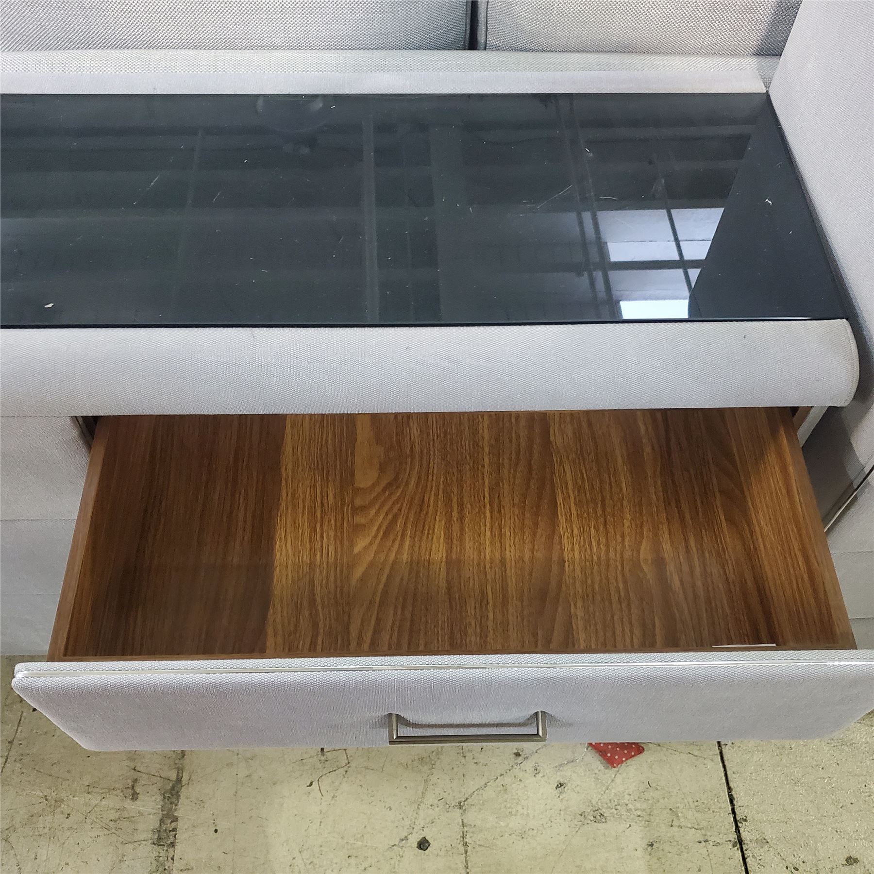 Light Grey Textured Fabric 6-Drawer Dresser with Glass Top, Approx. 30.5" x 56" x 17.5"