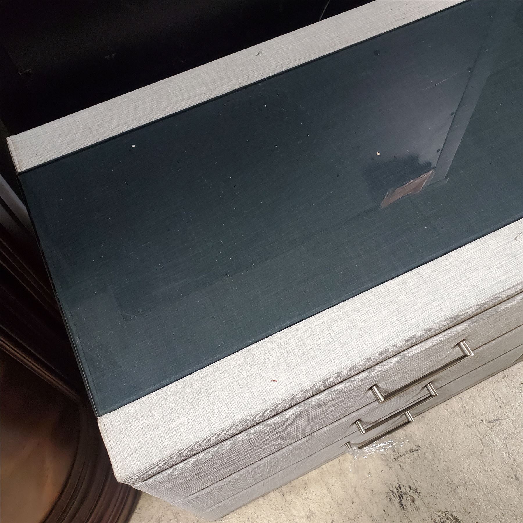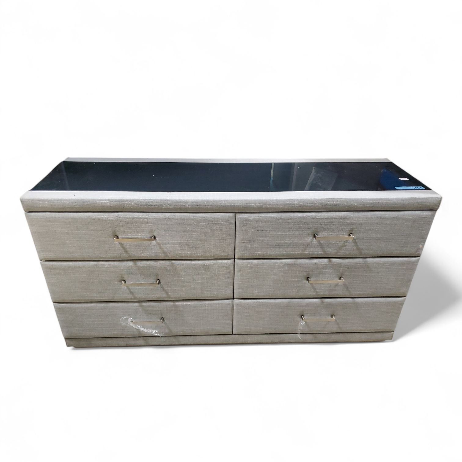 Light Grey Textured Fabric 6-Drawer Dresser with Glass Top, Approx. 30.5" x 56" x 17.5"