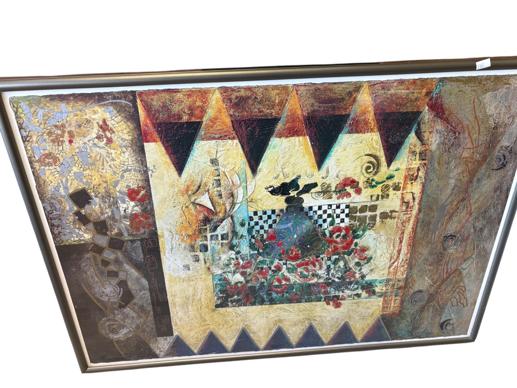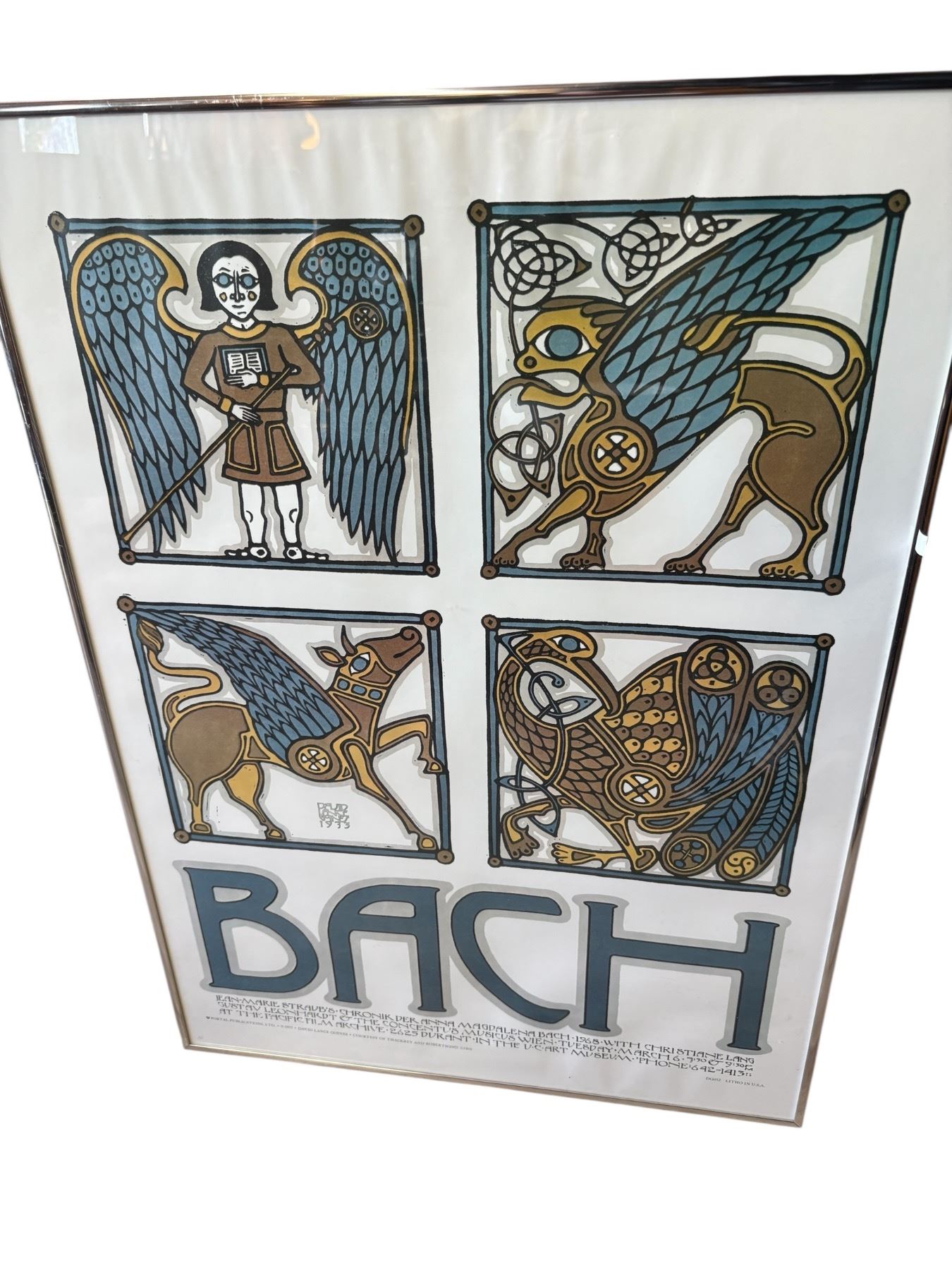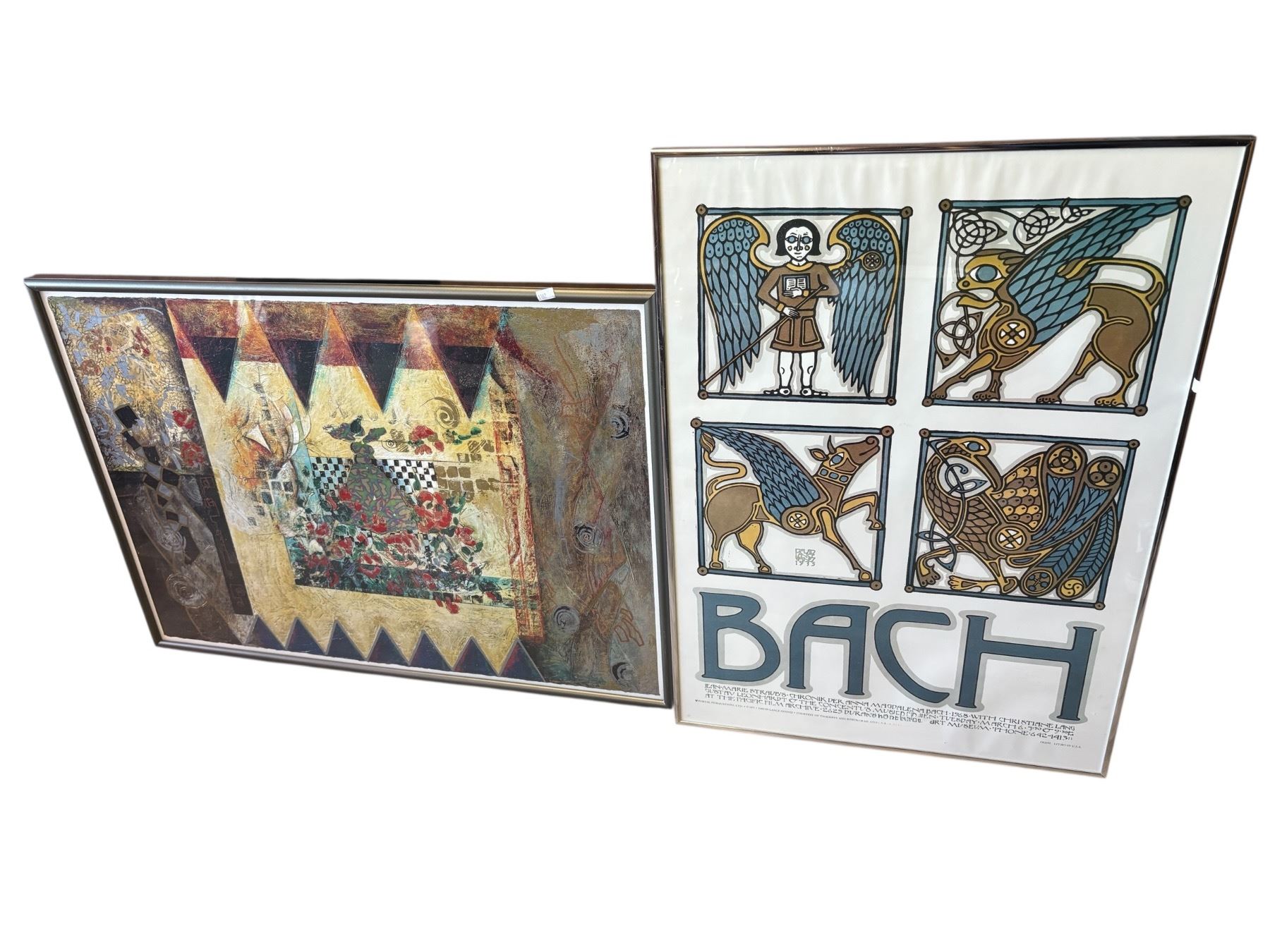 Lot includes two prints: a Celtic designed poster featuring 'Bach' by David Lance Goines, measuring 20x28 inches, and an abstract scene with floral elements measuring 22.5x32 inches. Both prints showcase distinct artistic styles. Item is as pictured.